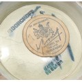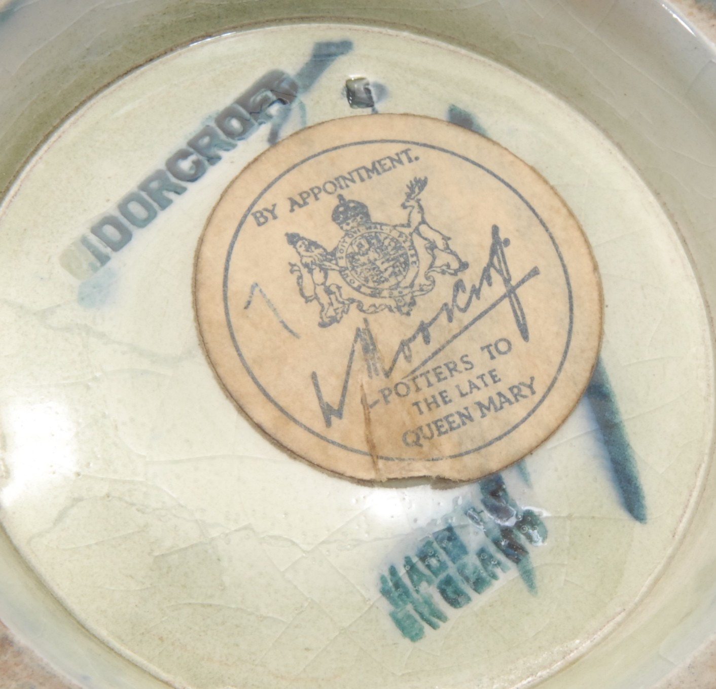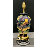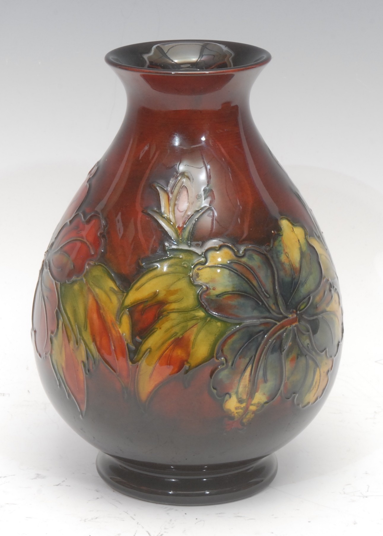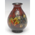 A Moorcroft pottery ovoid flambe vase, tube lined in the Hibiscus pattern, in tones of green, blue, yellow and red, brandy ground, 20.5cm high, impressed and painted marks, by appointment Potters to the Late Queen Mary label, c.1960