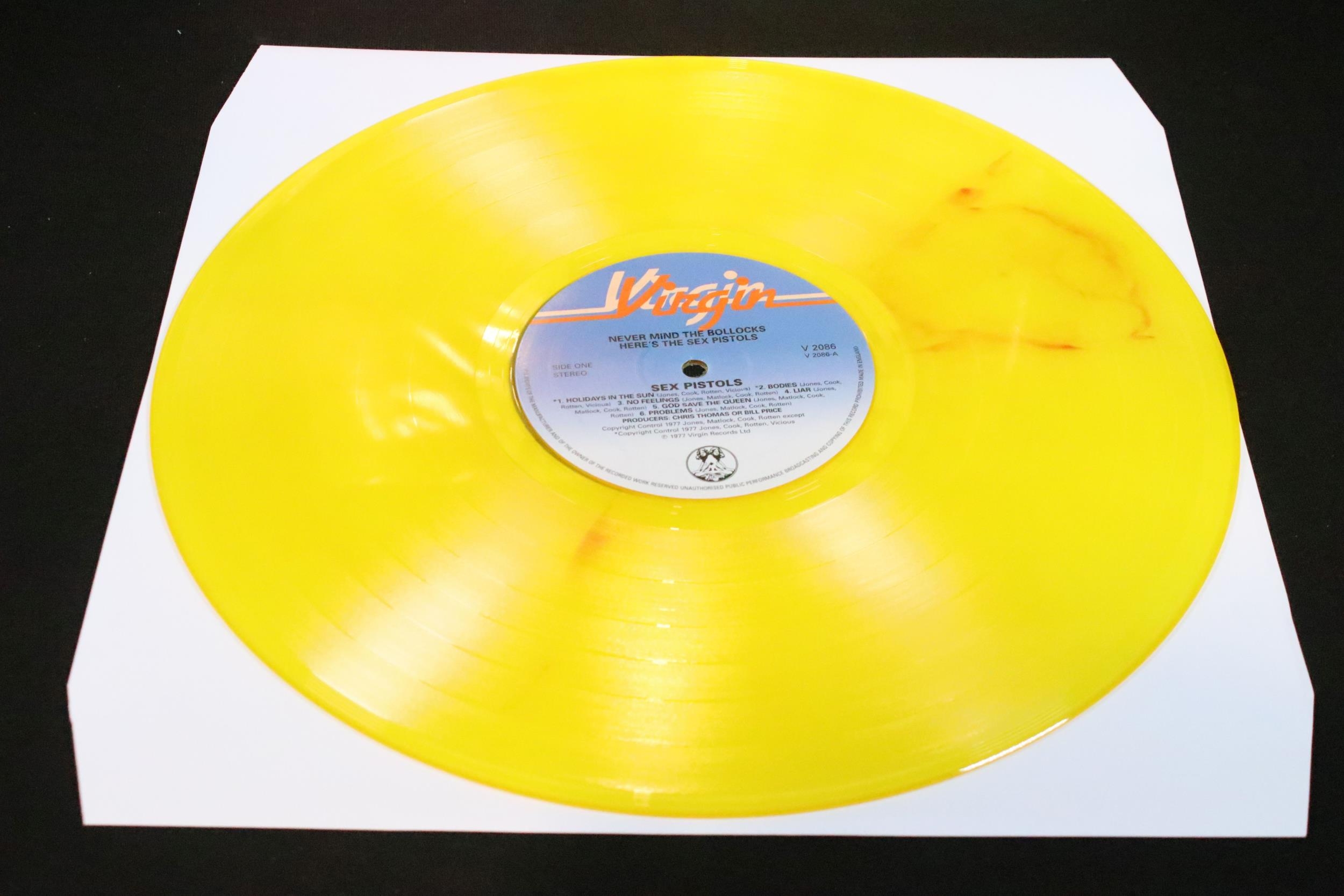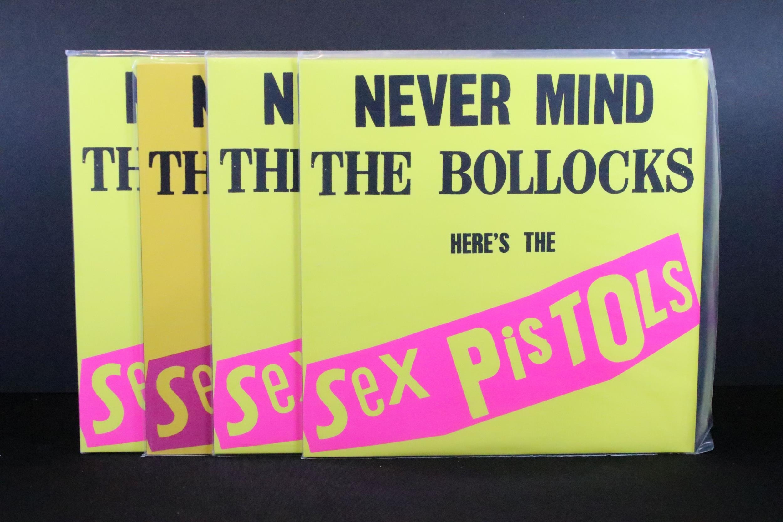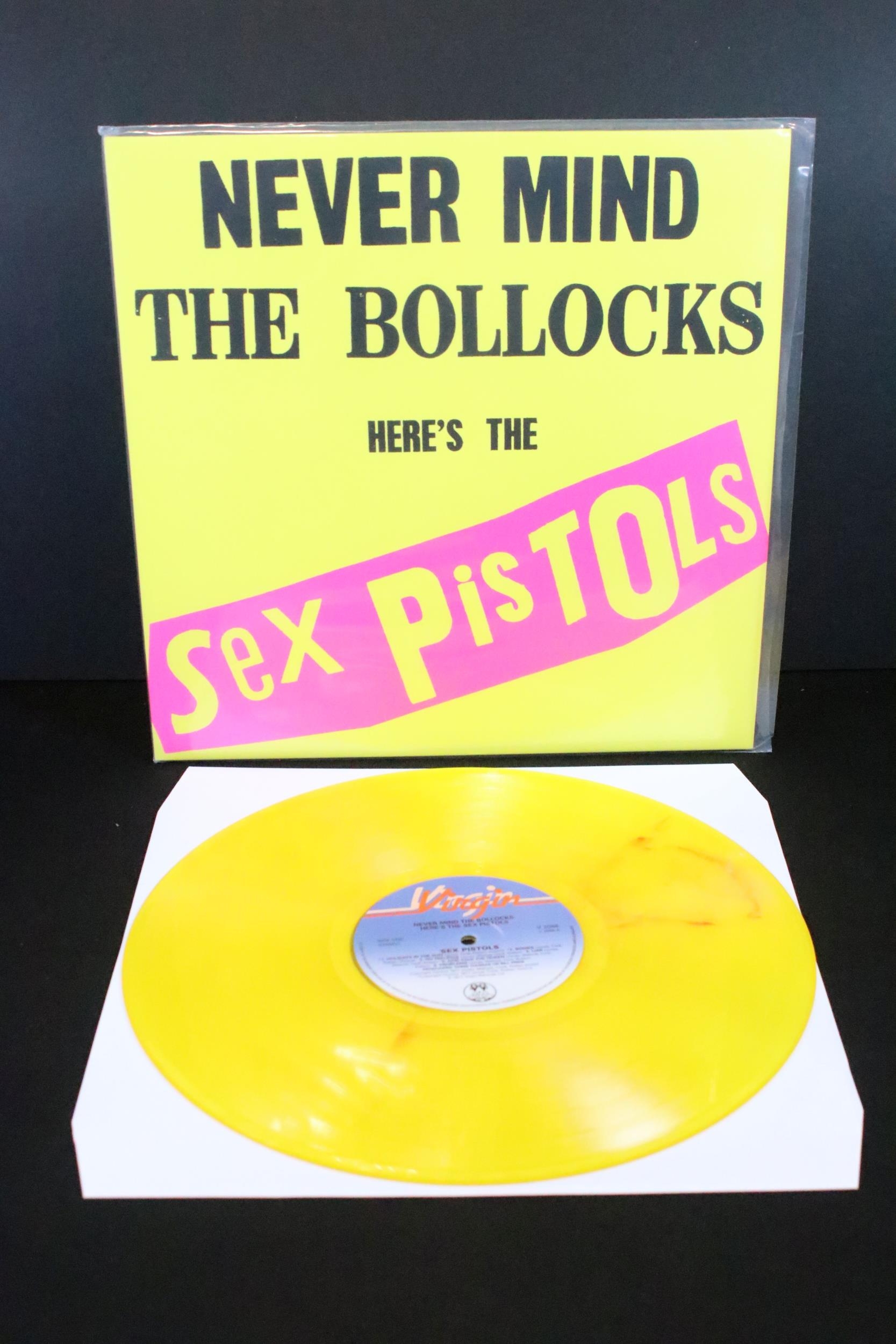 Vinyl - 4 Sex Pistols limited edition UK coloured vinyl re-issue LP’s of Never Mind The Bo****ks Here's The Sex Pistols, Virgin – V-2086, 2014 green marbled, 2010 pink, 2010 blue, 2016 yellow marbled. Condition EX+