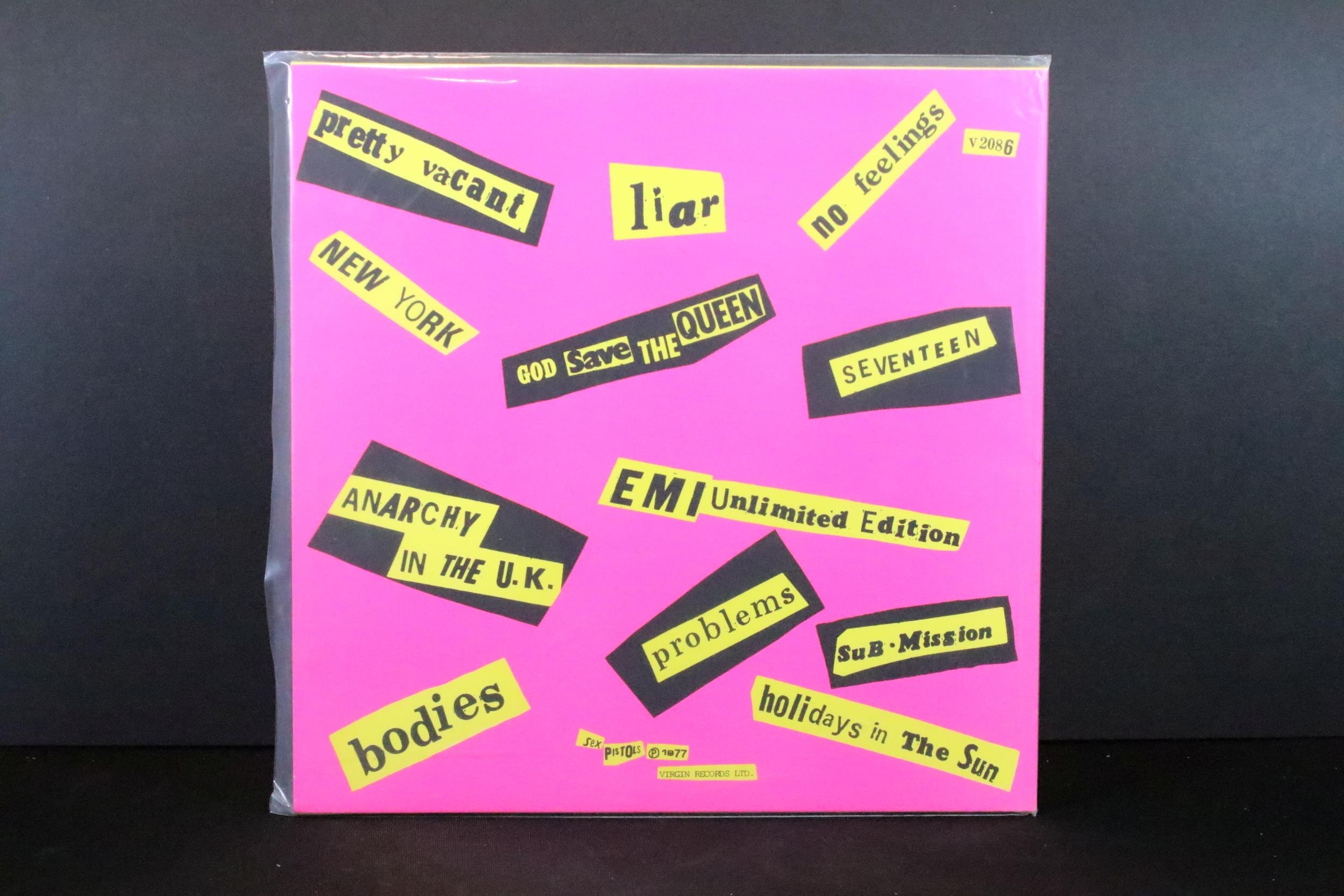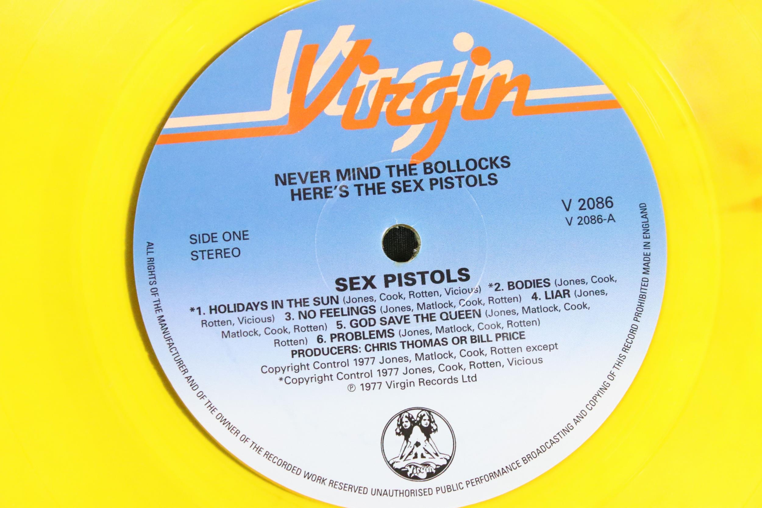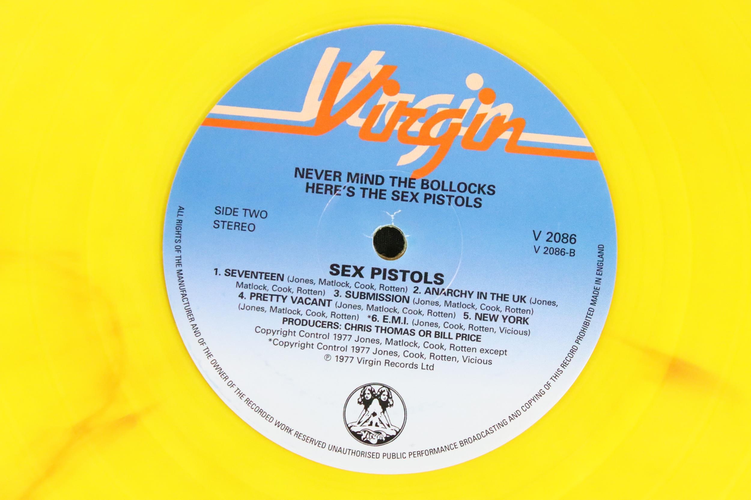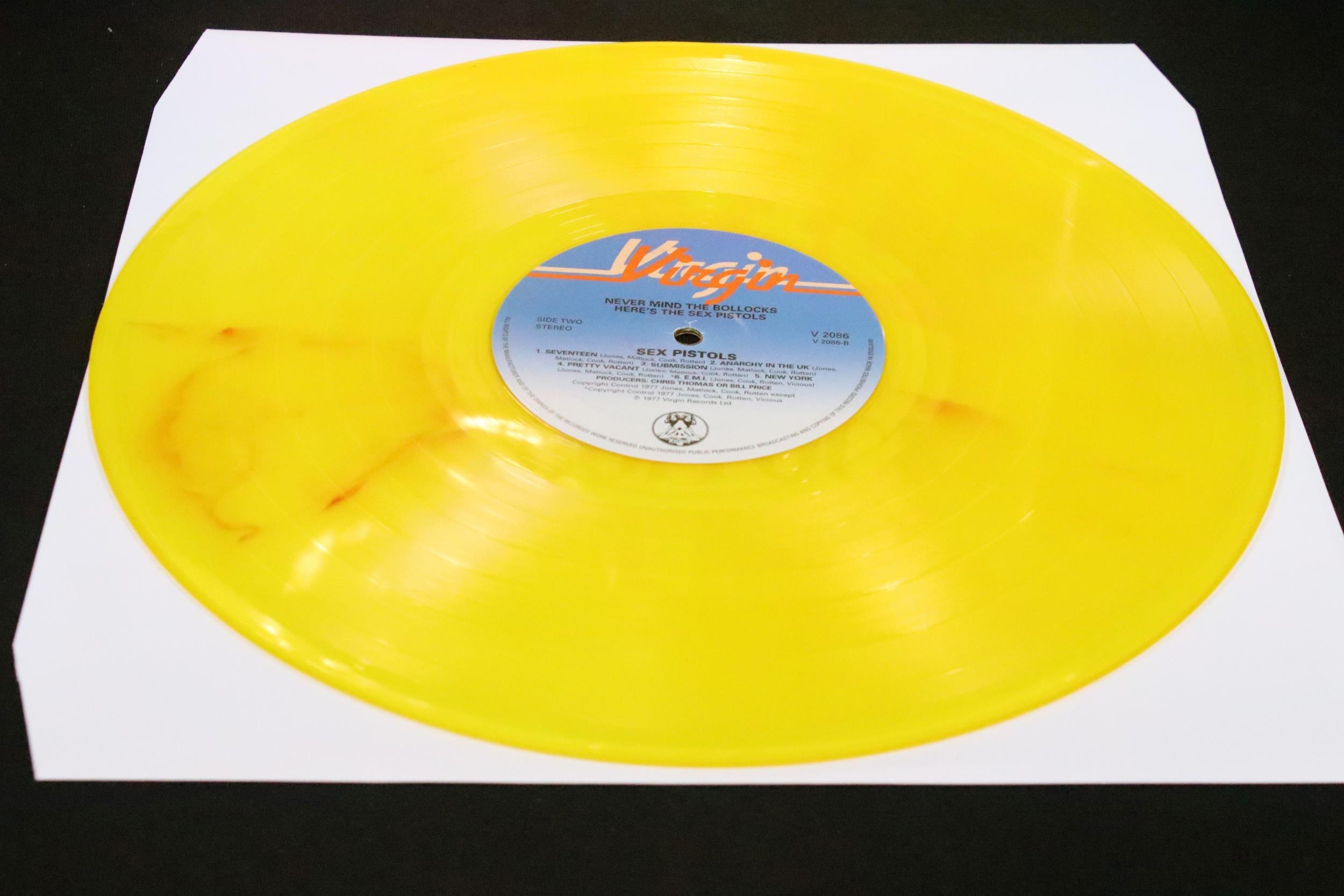 Vinyl - 4 Sex Pistols limited edition UK coloured vinyl re-issue LP’s of Never Mind The Bo****ks Here's The Sex Pistols, Virgin – V-2086, 2014 green marbled, 2010 pink, 2010 blue, 2016 yellow marbled. Condition EX+
