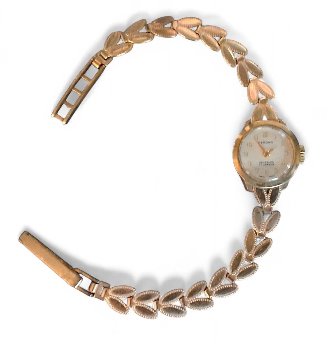 A 9ct gold Perona lady's wristwatch, Swiss Incabloc 17 jewel movement, cream dial, Arabic numerals 9ct gold fancy link bracelet, w/o, 8.8g gross (without movement)
