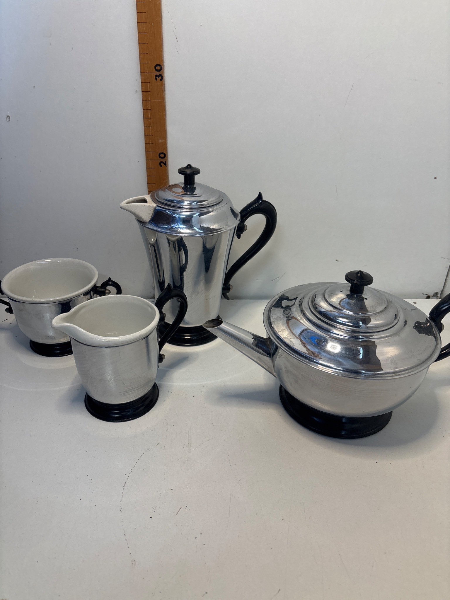 Silver-tone tea set with four pieces, includes teapot, creamer, sugar bowl, and coffee pot with black accents. Condition as shown.
