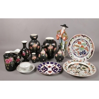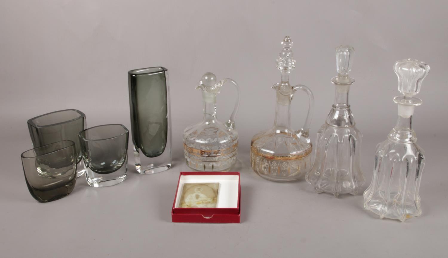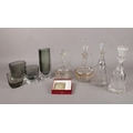 A selection of assorted glassware. To include a Swedish Orrefors vase no 3595/2, four glass decanters and a glass photographic slide of a seated gentleman etc.