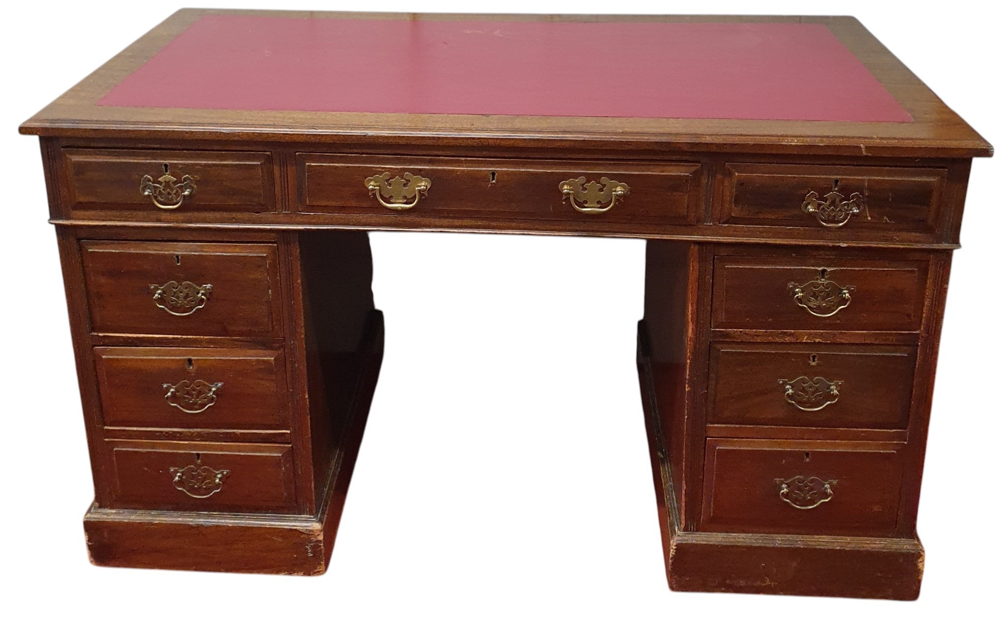 An early 20th Century Mahogany Pedestal Desk with red leatherette top. W 122 x D 64 x H 73 cm approx.