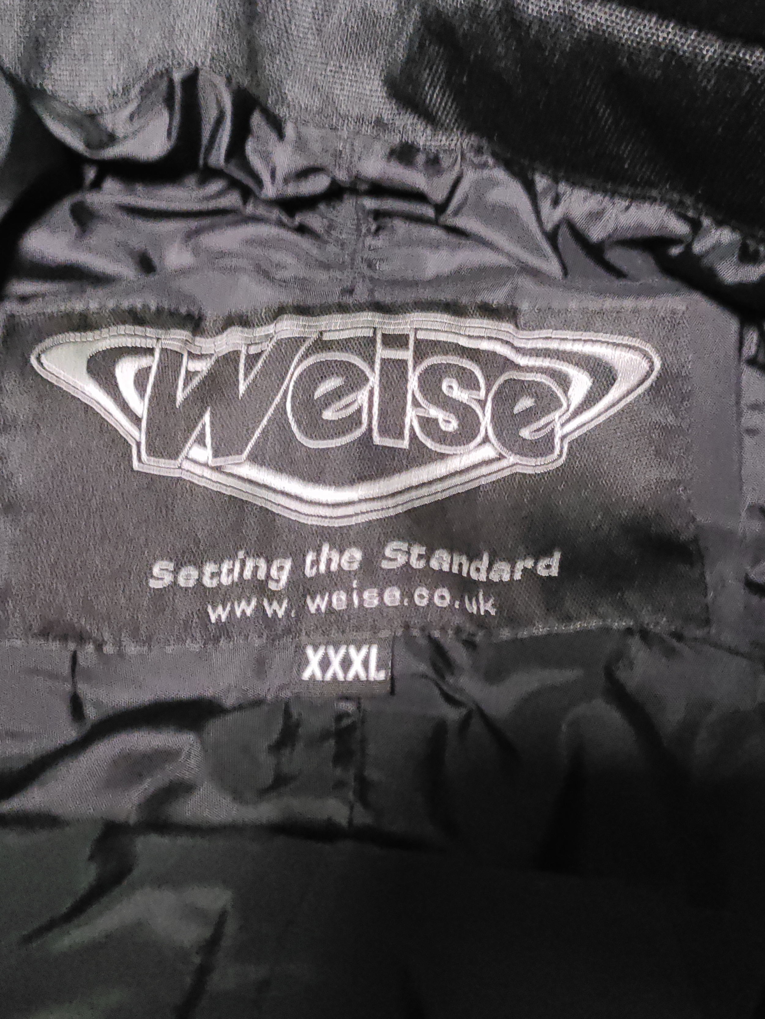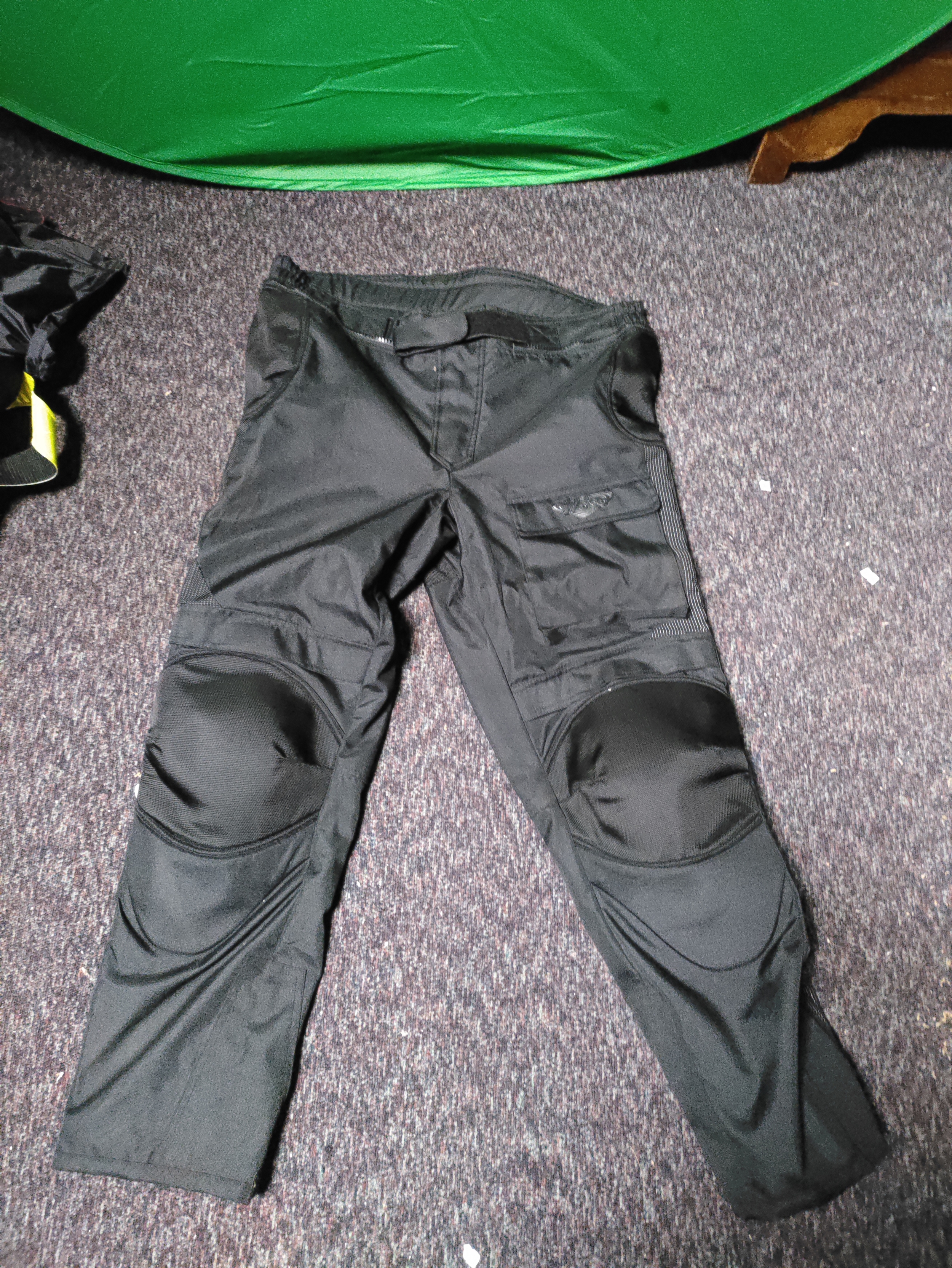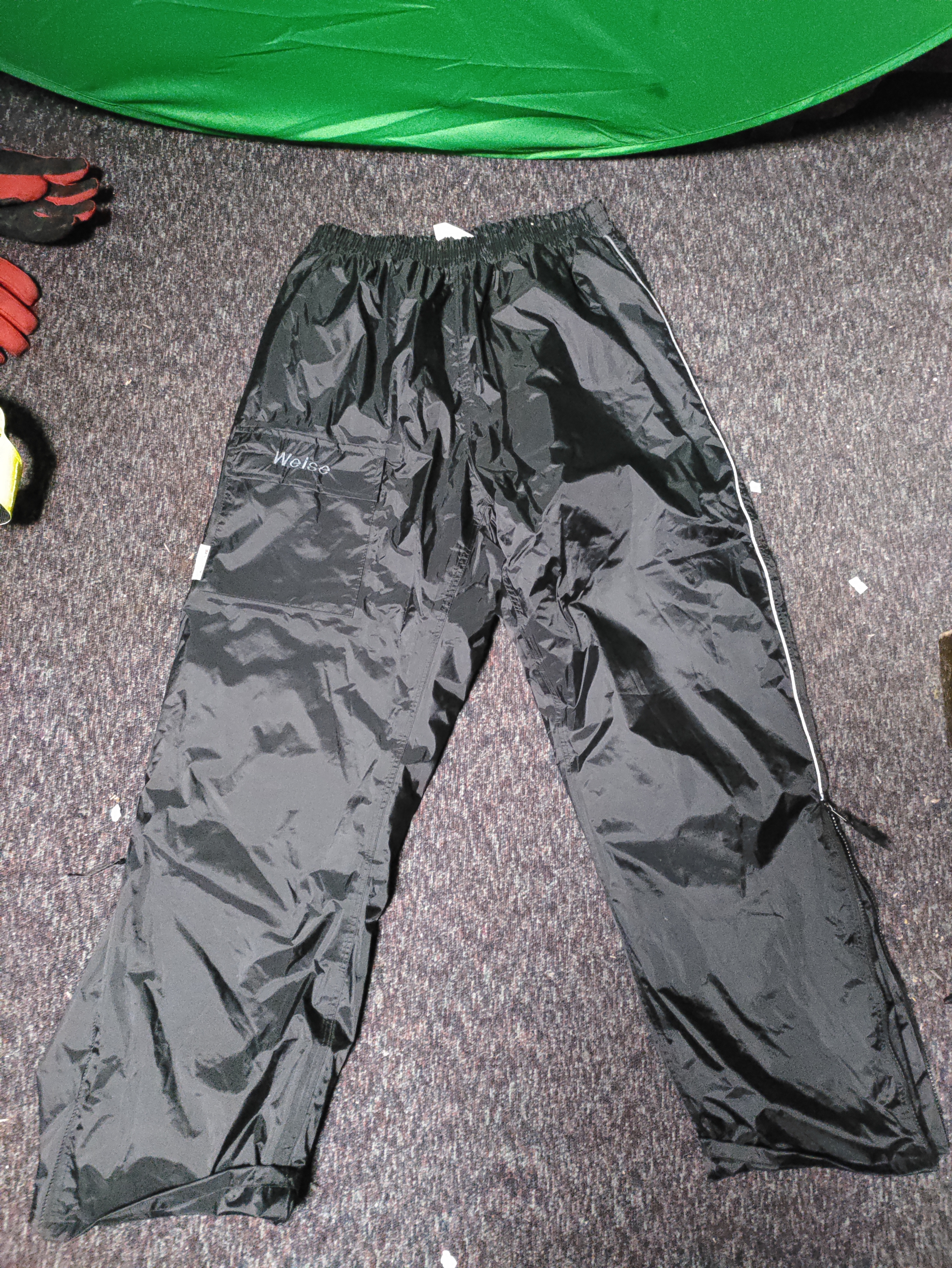 A collection of protective clothing. To include 2 pairs of weise motorcyclist trousers one size XXL, & other L , step ahead high visibility jacket size L, a pair of large bone dry motorcyclist gloves & 2 high visibility vests.