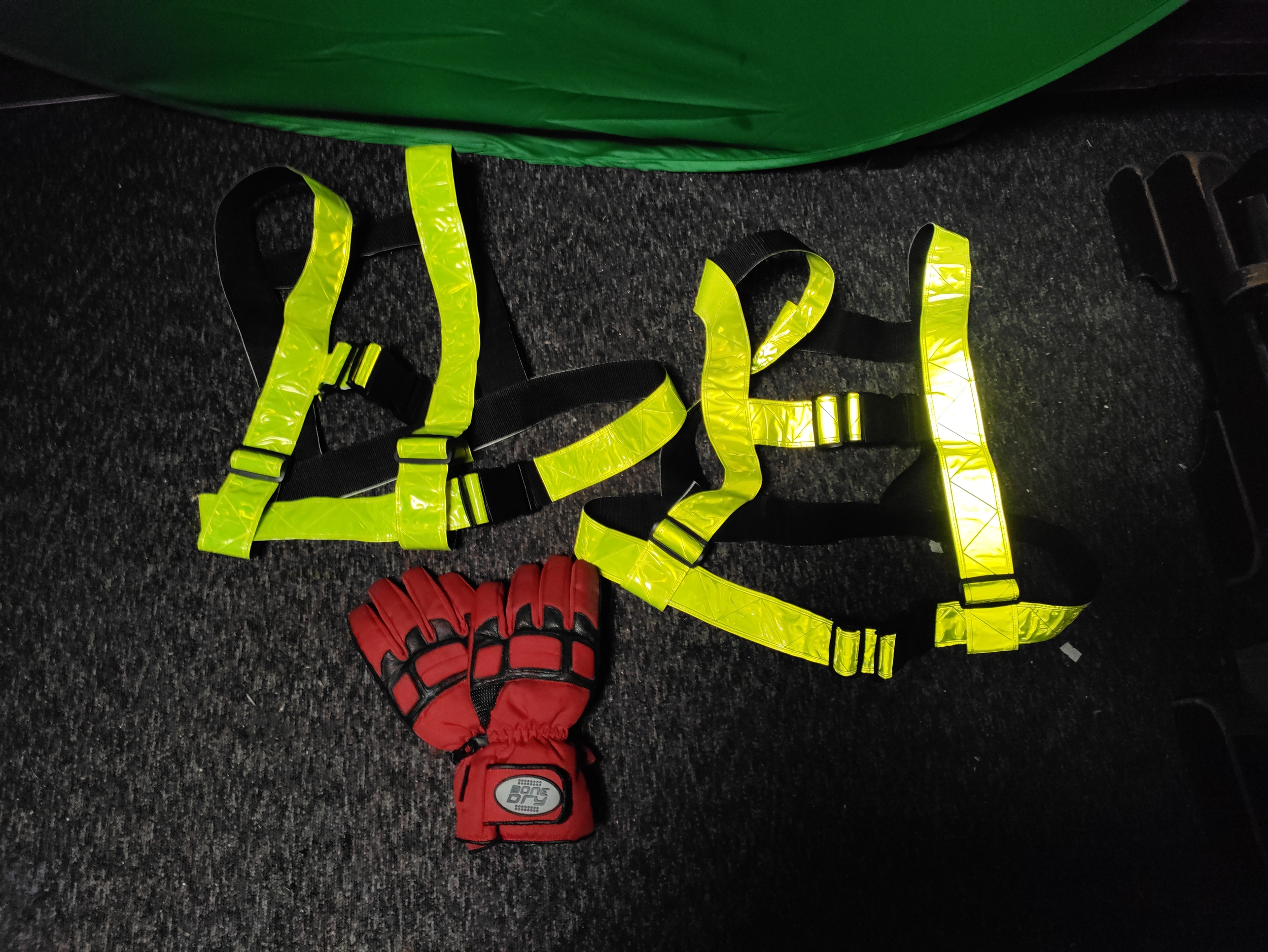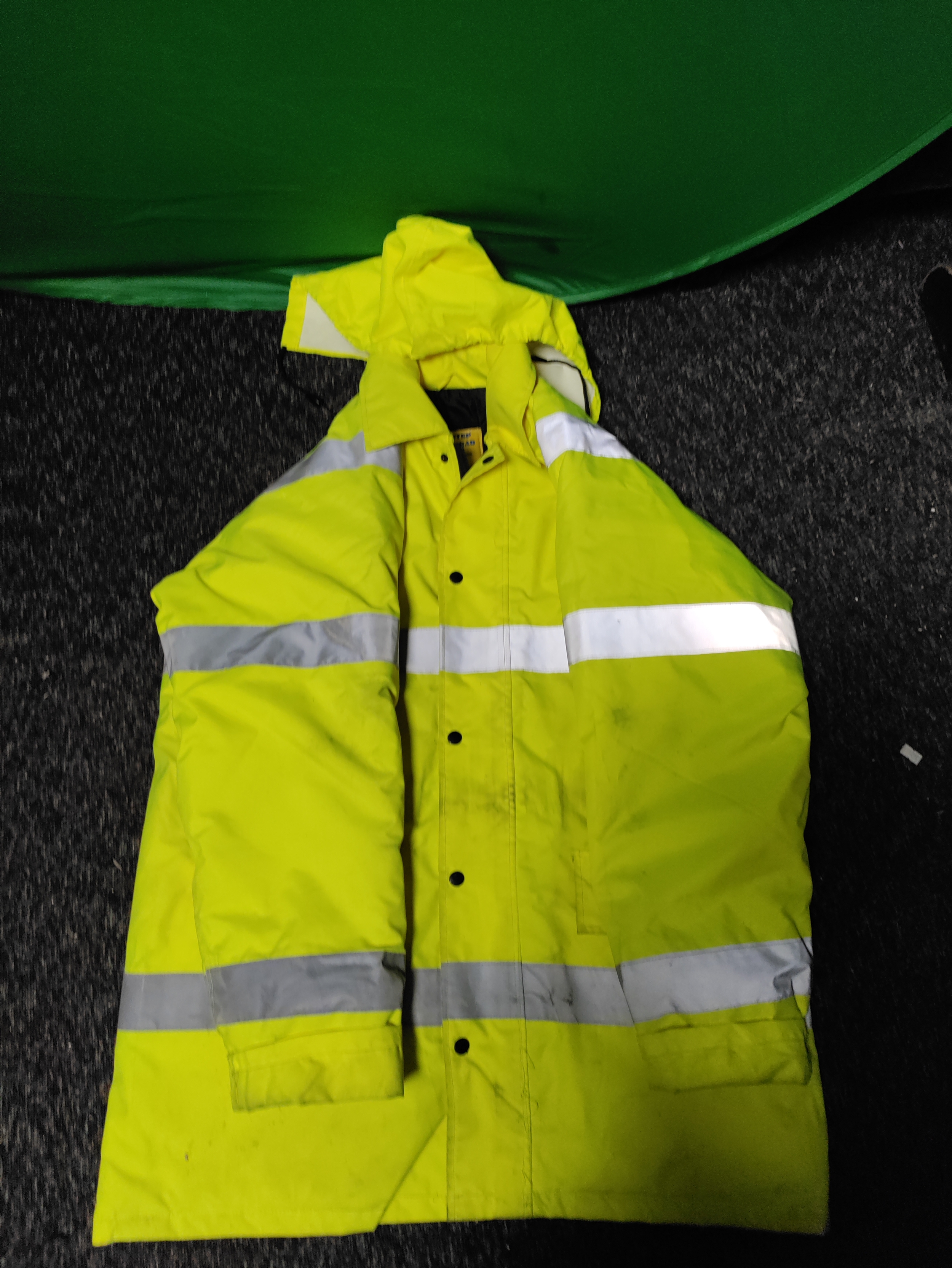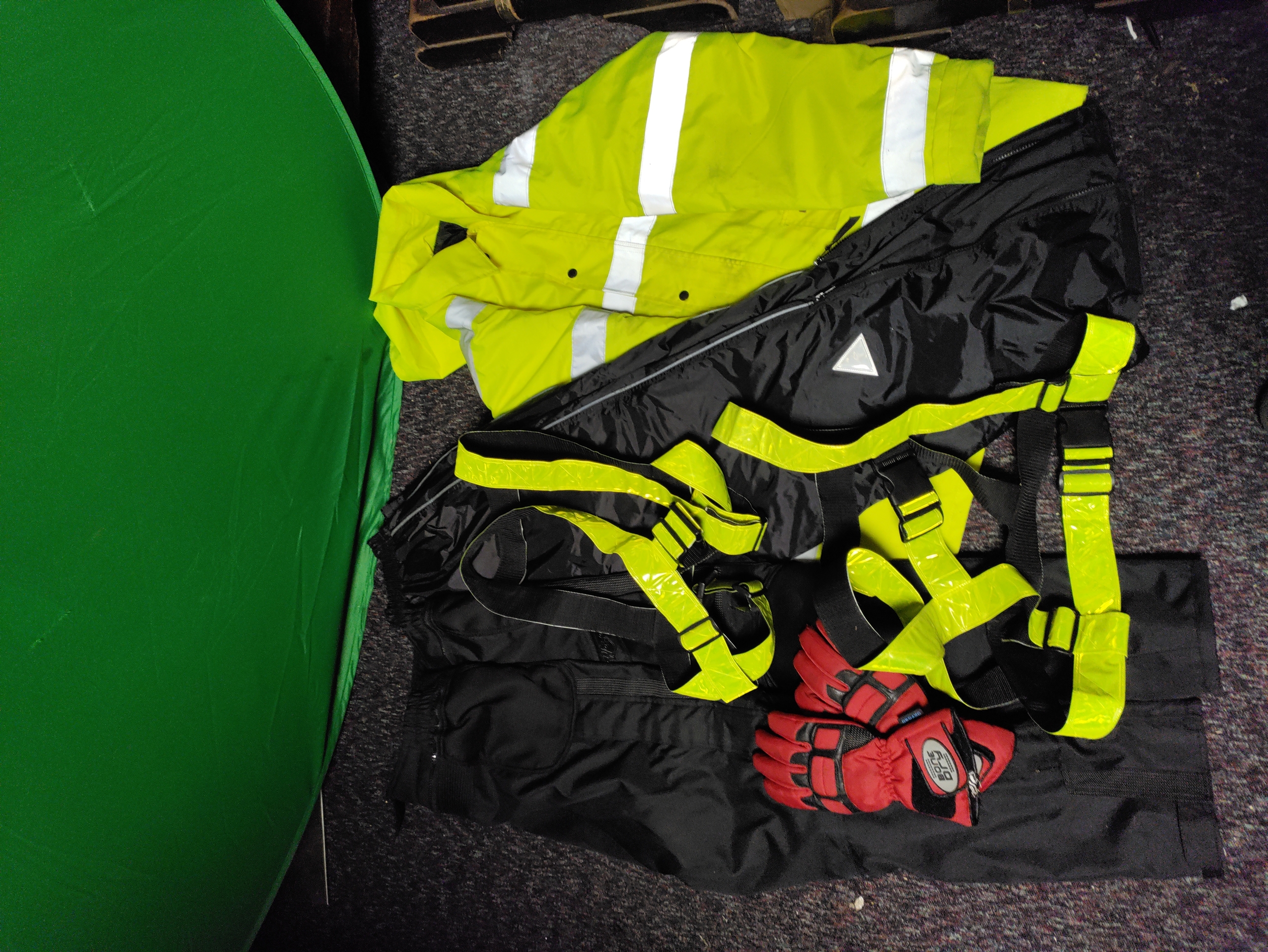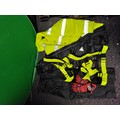 A collection of protective clothing. To include 2 pairs of weise motorcyclist trousers one size XXL, & other L , step ahead high visibility jacket size L, a pair of large bone dry motorcyclist gloves & 2 high visibility vests.