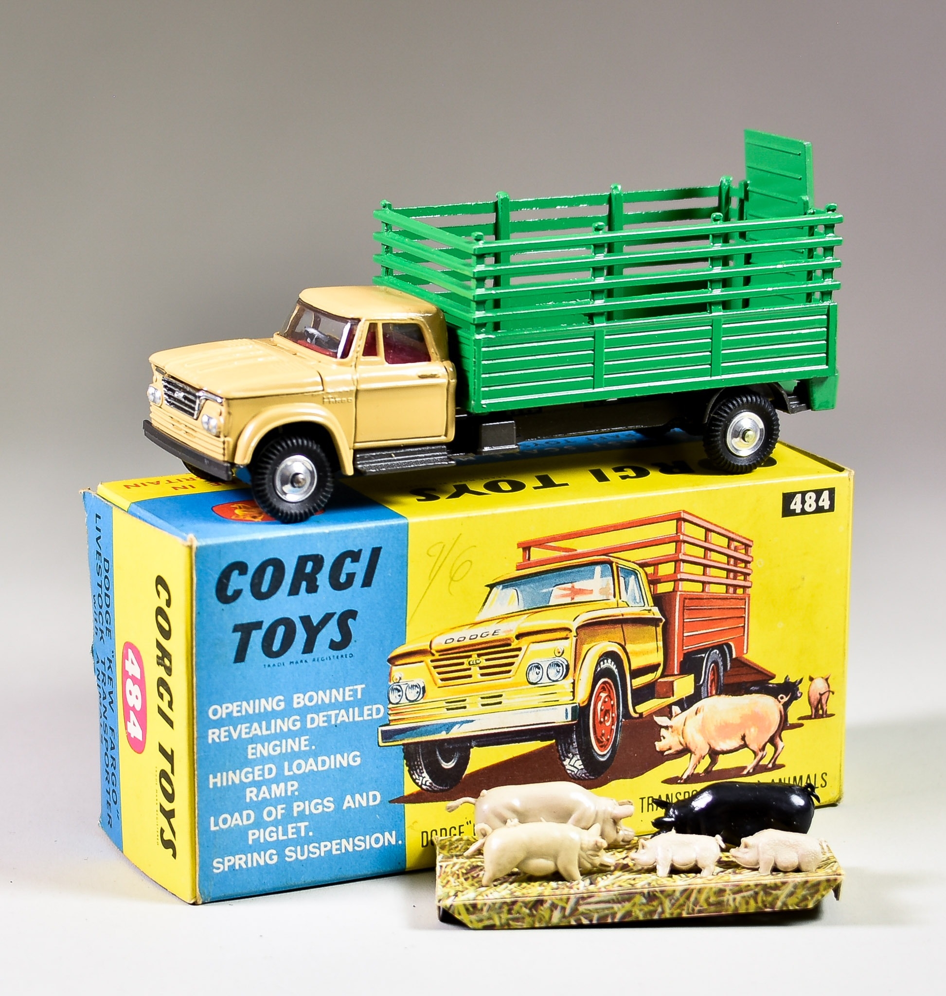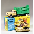 Four Corgi Toys Diecast Model Vehicles, comprising - No. 484 "Dodge Kew Fargo Livestock Transporter with Animals", with tan cabin, green loader, five pig figures, cardboard grass holder, spun hubs and grey metal detailing, in original box with insert, a No. 205M "Riley Pathfinder Saloon", with deep blue body, spun hubs and silver trim, in original box, a No. 1128 "Priestman Luffing Shovel", with red body, yellow undercarriage, rubber tracks, grey shovel and decals, and No. 1111 "Massey-Ferguson 780 Combine Harvester", with red body, yellow hubs, yellow harvester and trim, both in original boxes with inserts