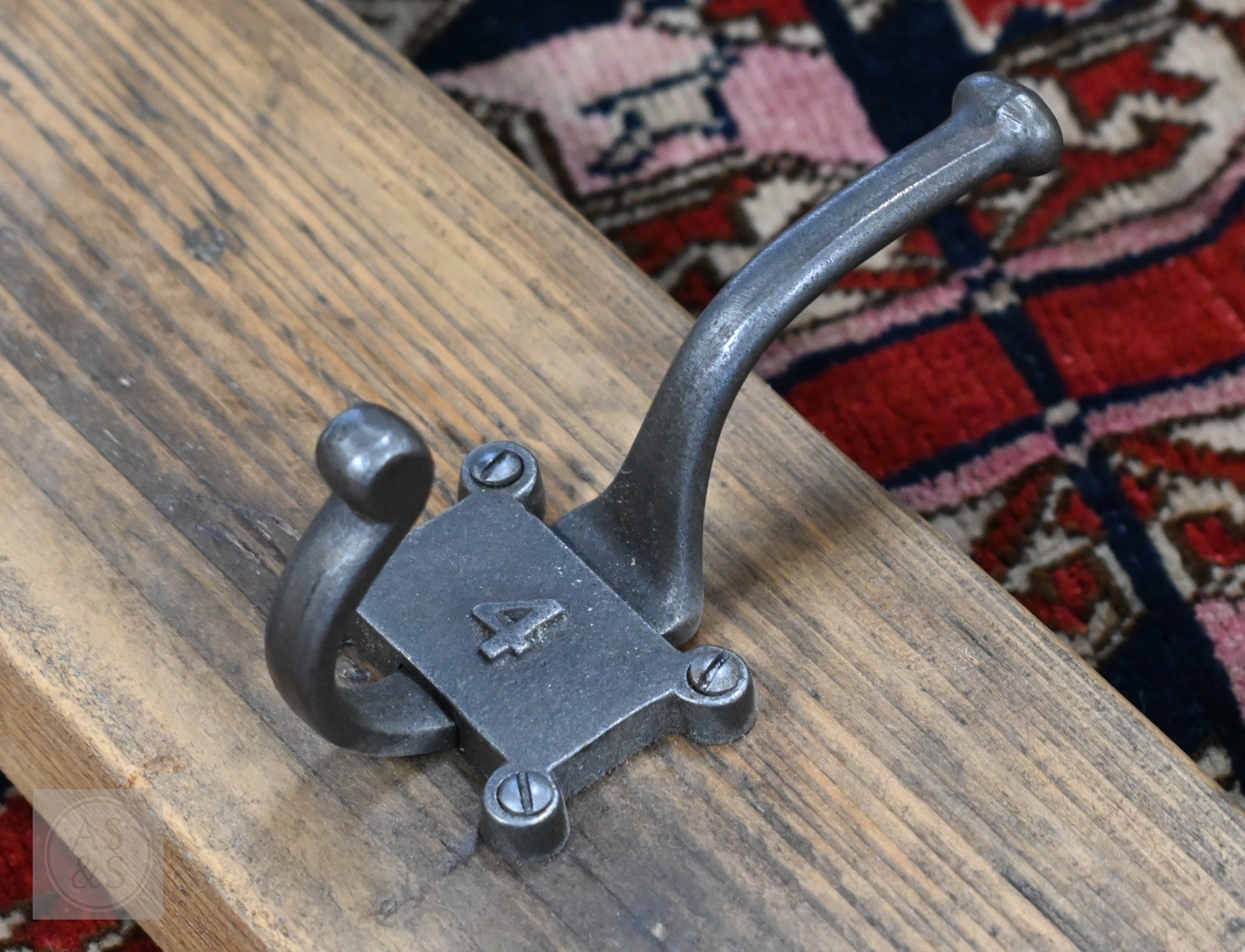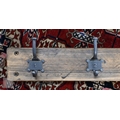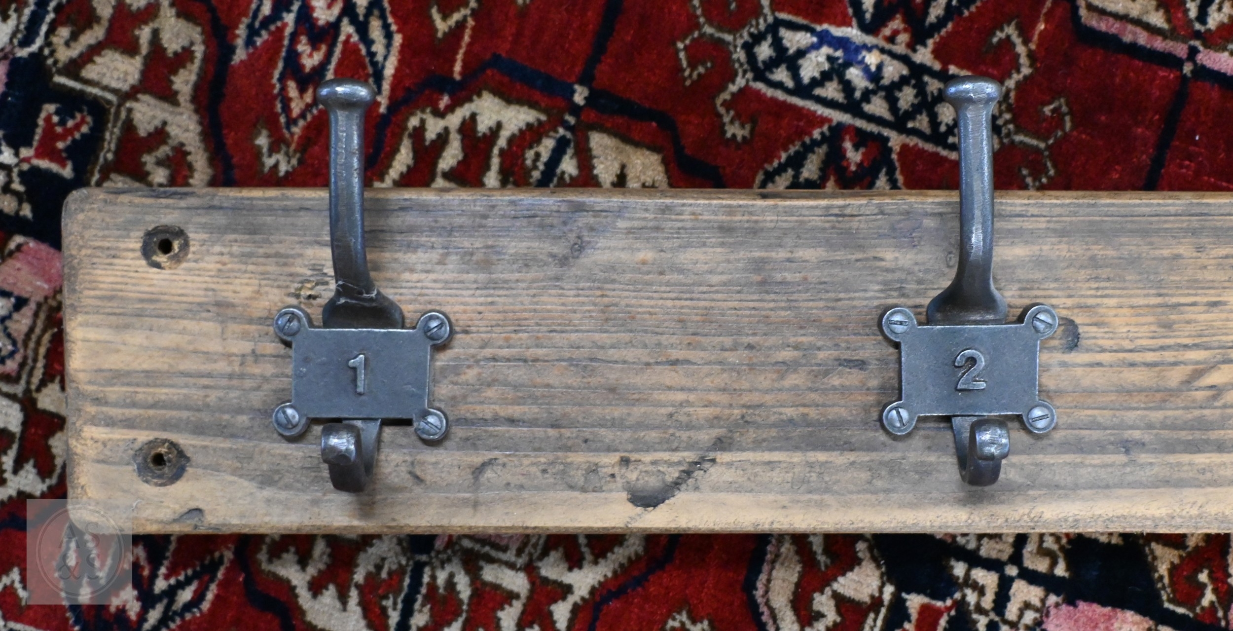 A vintage style five hanger wall coat rack, the metal twin hooks numbered 1-5, 91 cm long