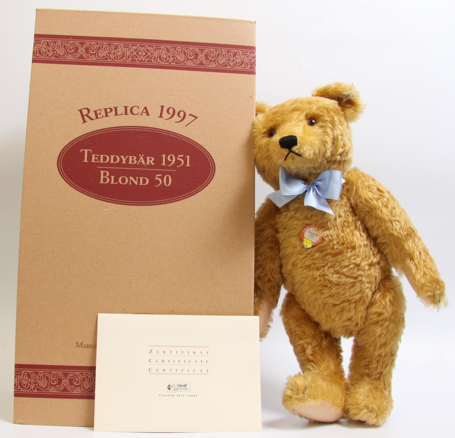 Steiff 1951 replica teddy bear, Blond 50, limited edition 00031/6000 pieces, trademark Steiff button to the ear and chest tag, with certificate, boxed