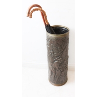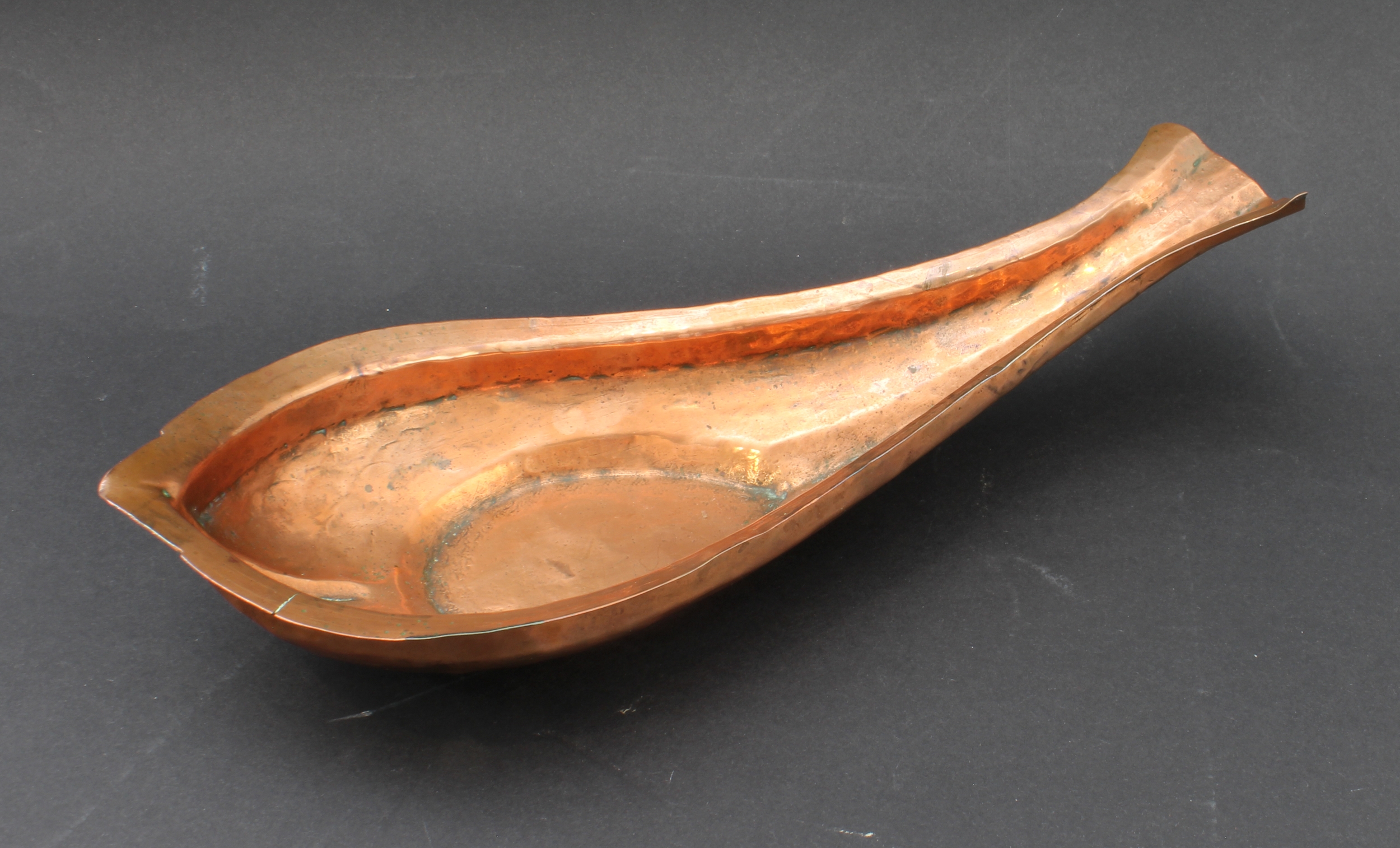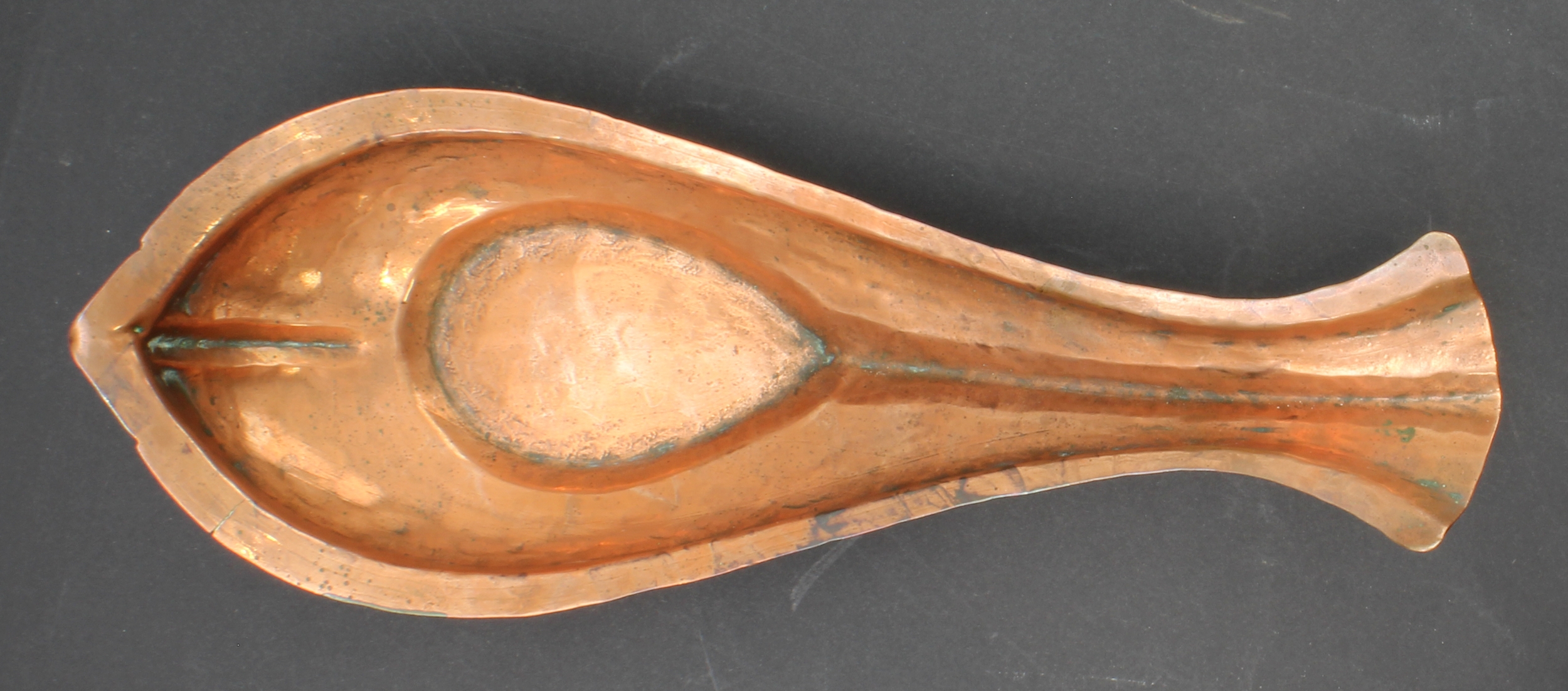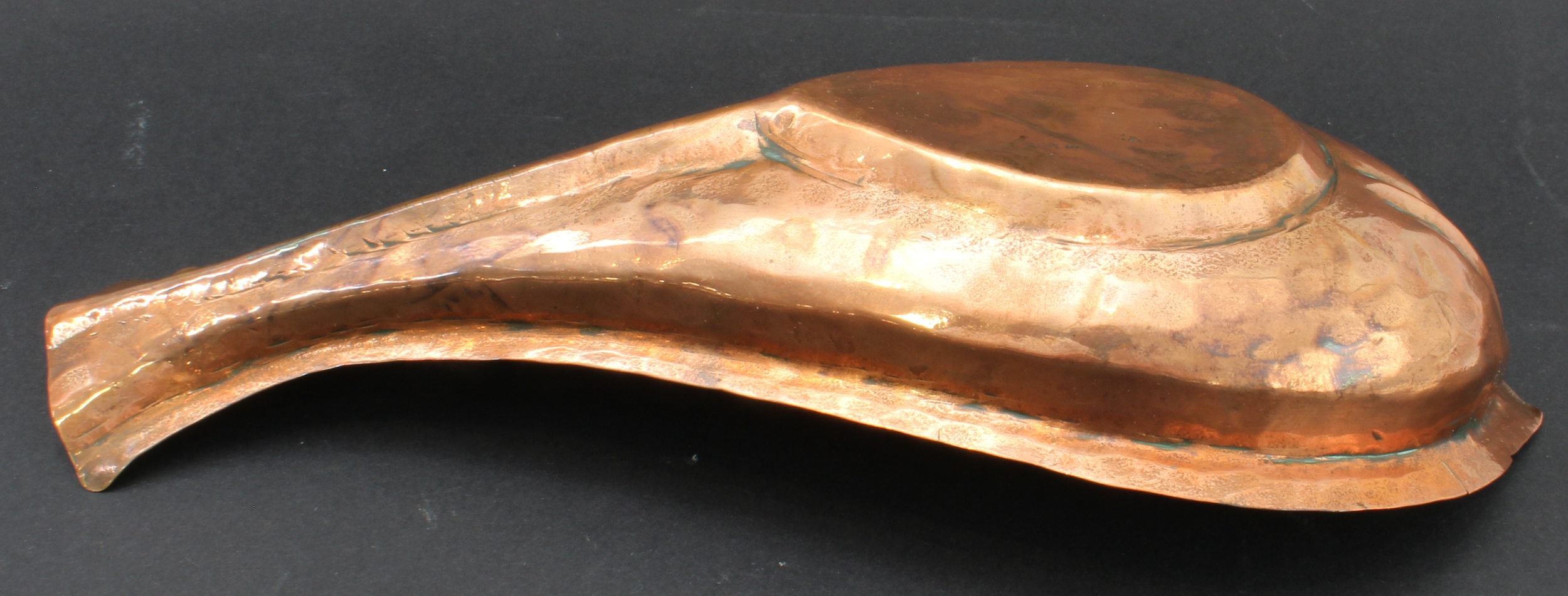A 19th century Hindu Yoni-ritual copper pourer: ridged bulbous fish form with elongated fishtail pourer. (Representative of the female genitalia and used to lustrate a Shiva temple's lingam). (29.75 cm long)