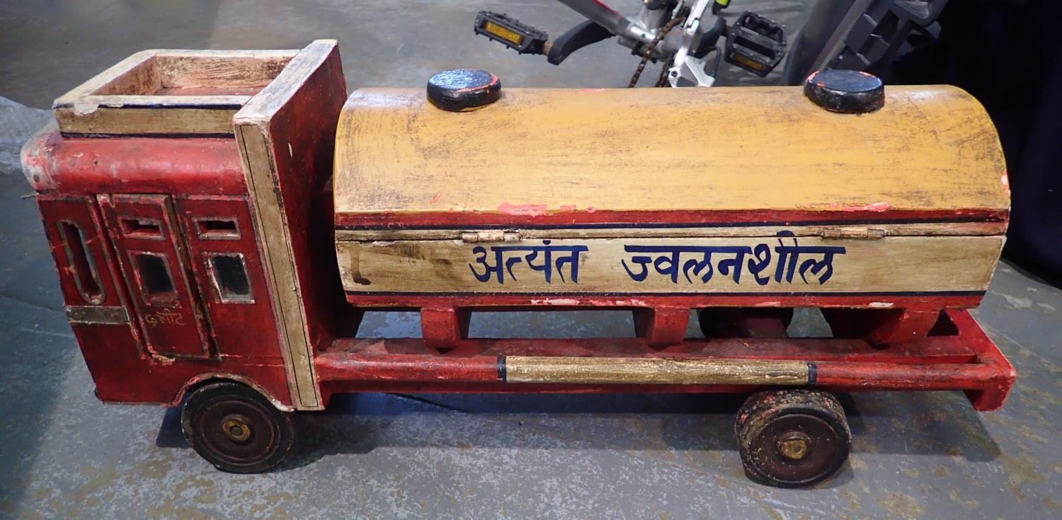 Scratch built wooden vintage petrol tanker with lifting lid, L: 56 cm. Not available for in-house P&P, contact Paul O'Hea at Mailboxes on 01925 659133