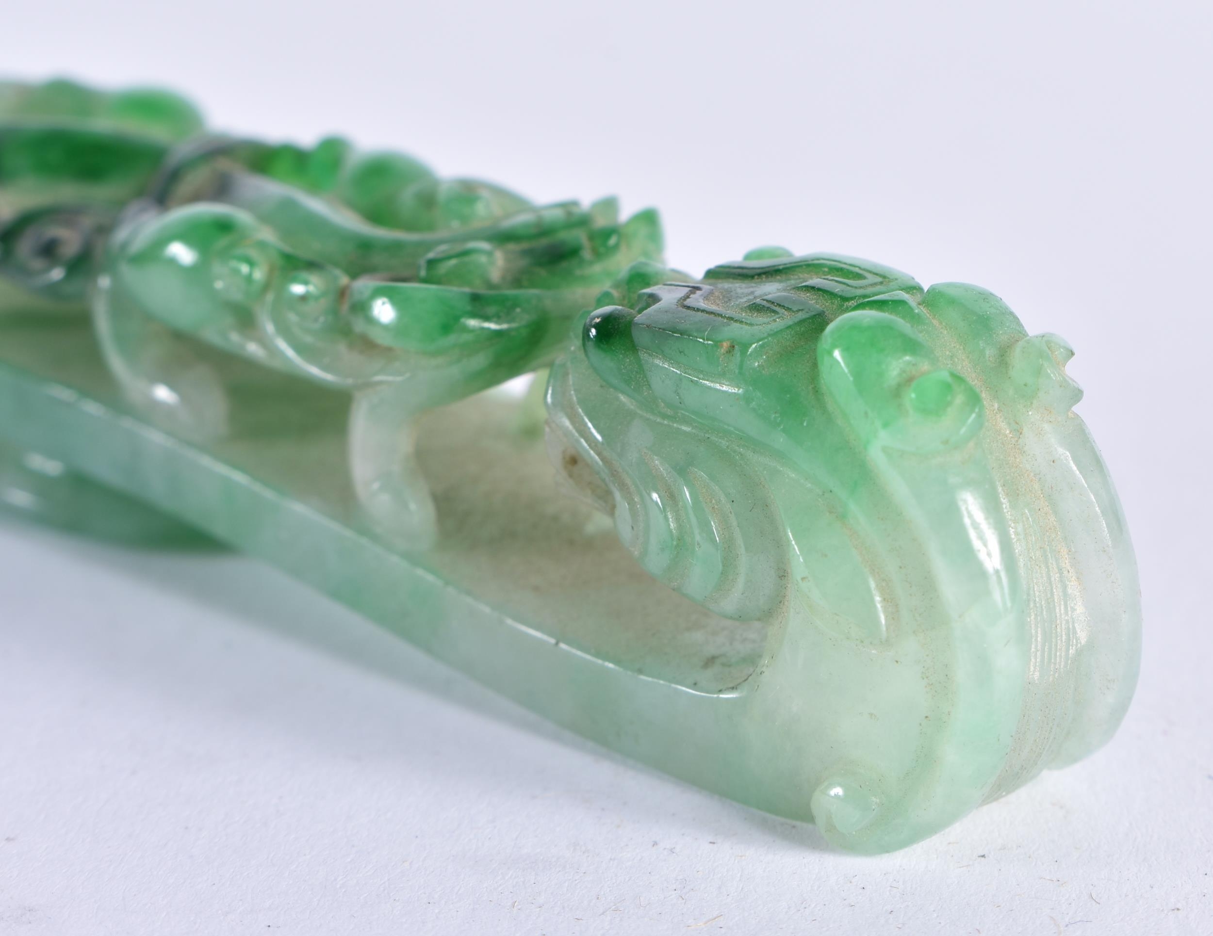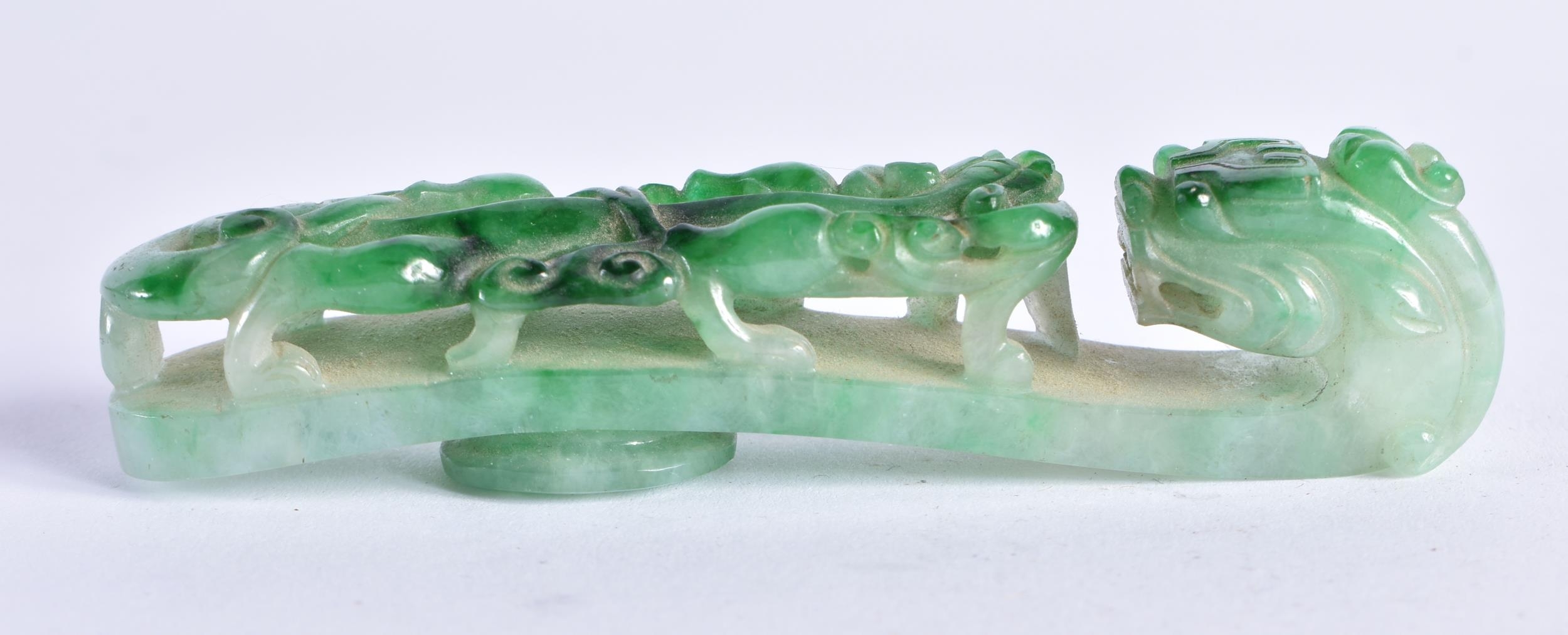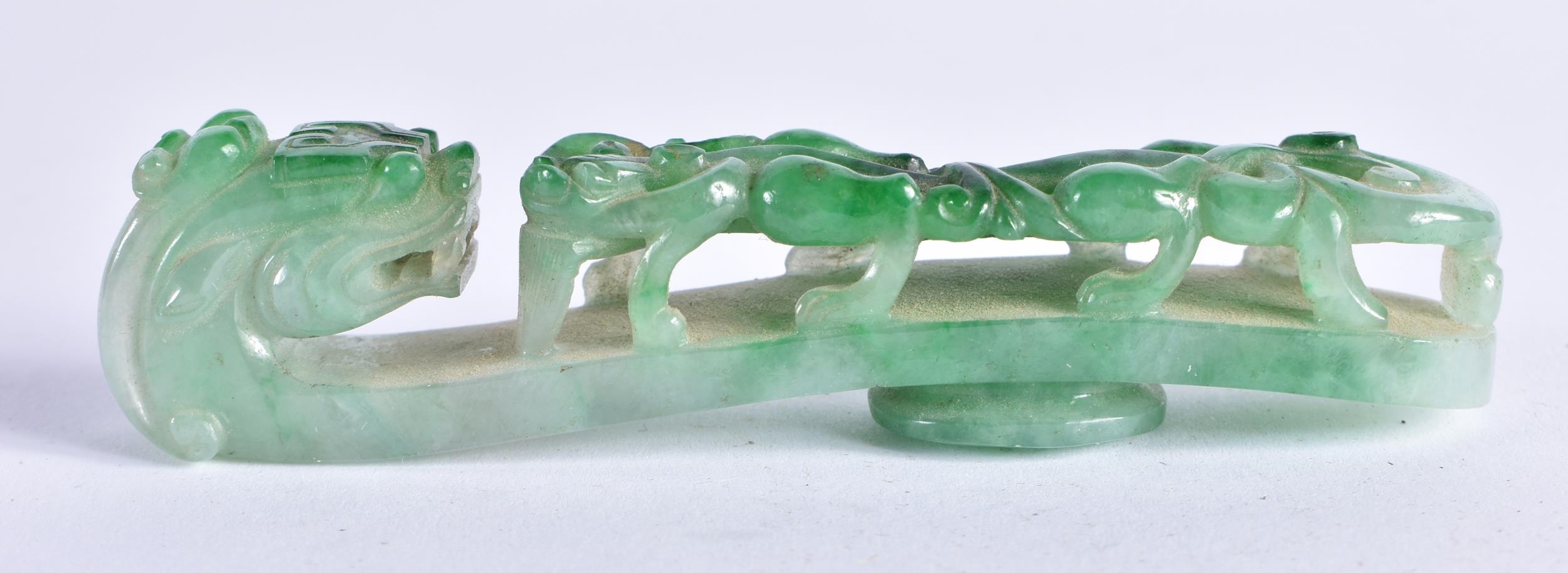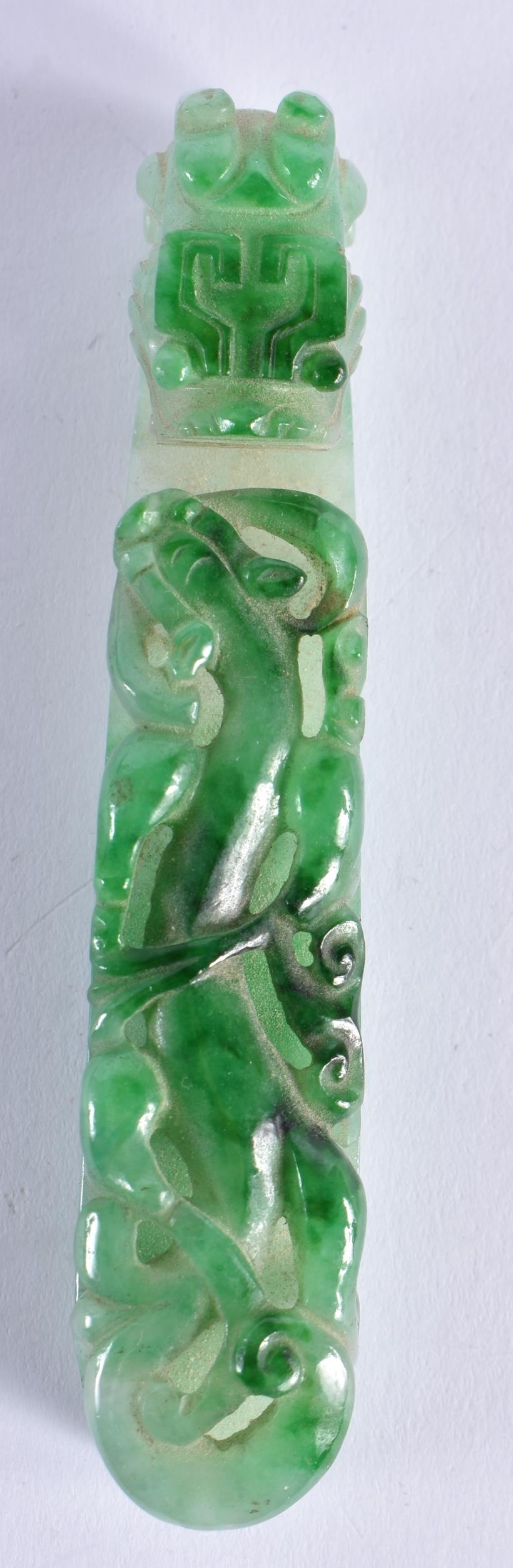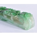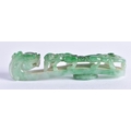 A FINE 19TH CENTURY CHINESE CARVED JADEITE BELT HOOK Qing. 10 cm long.