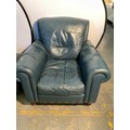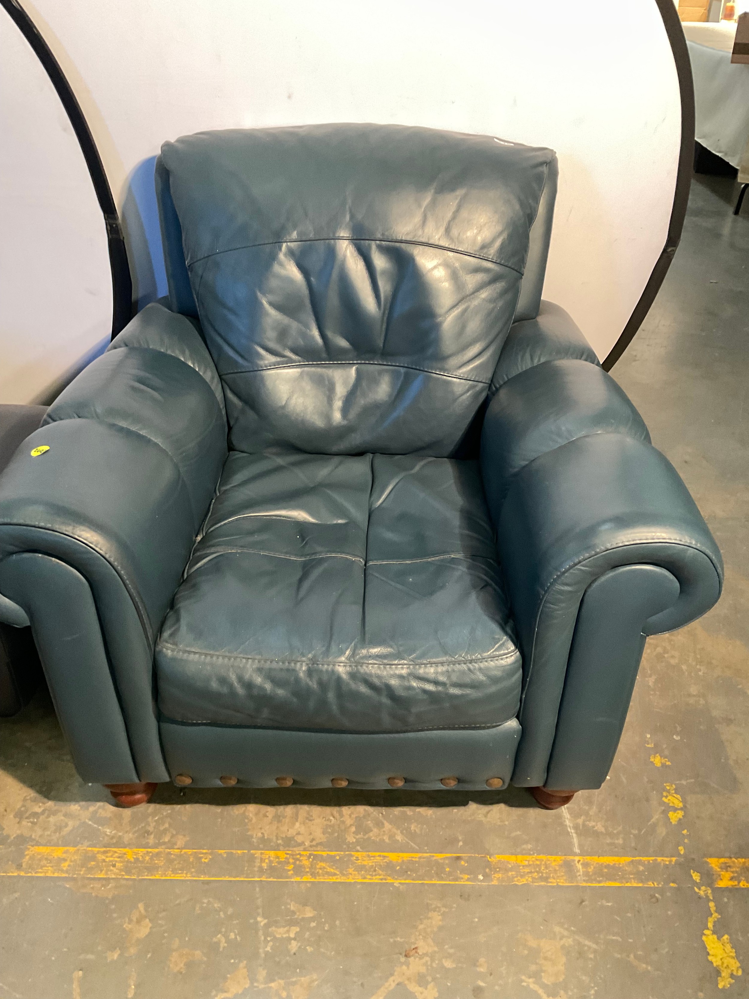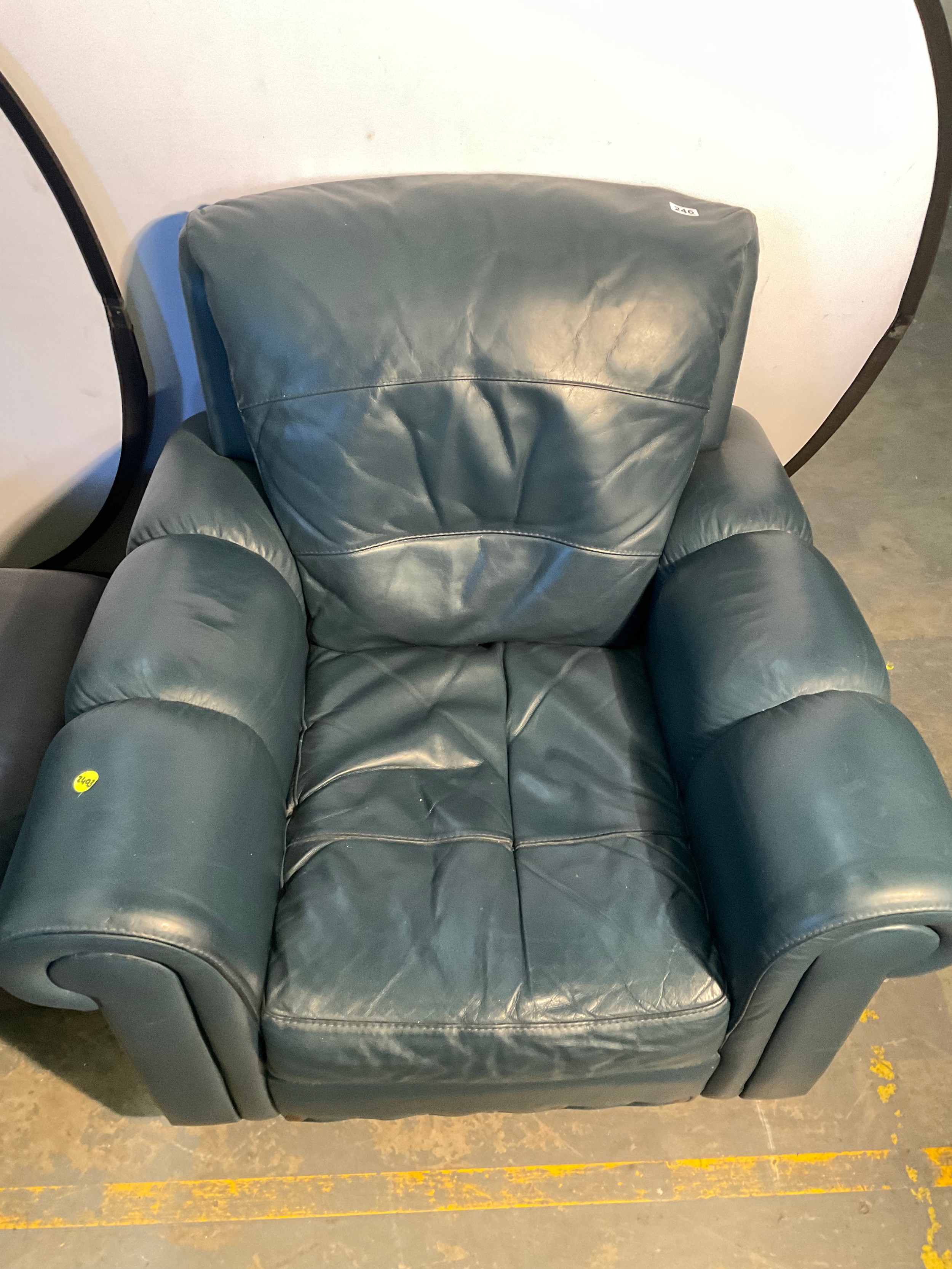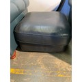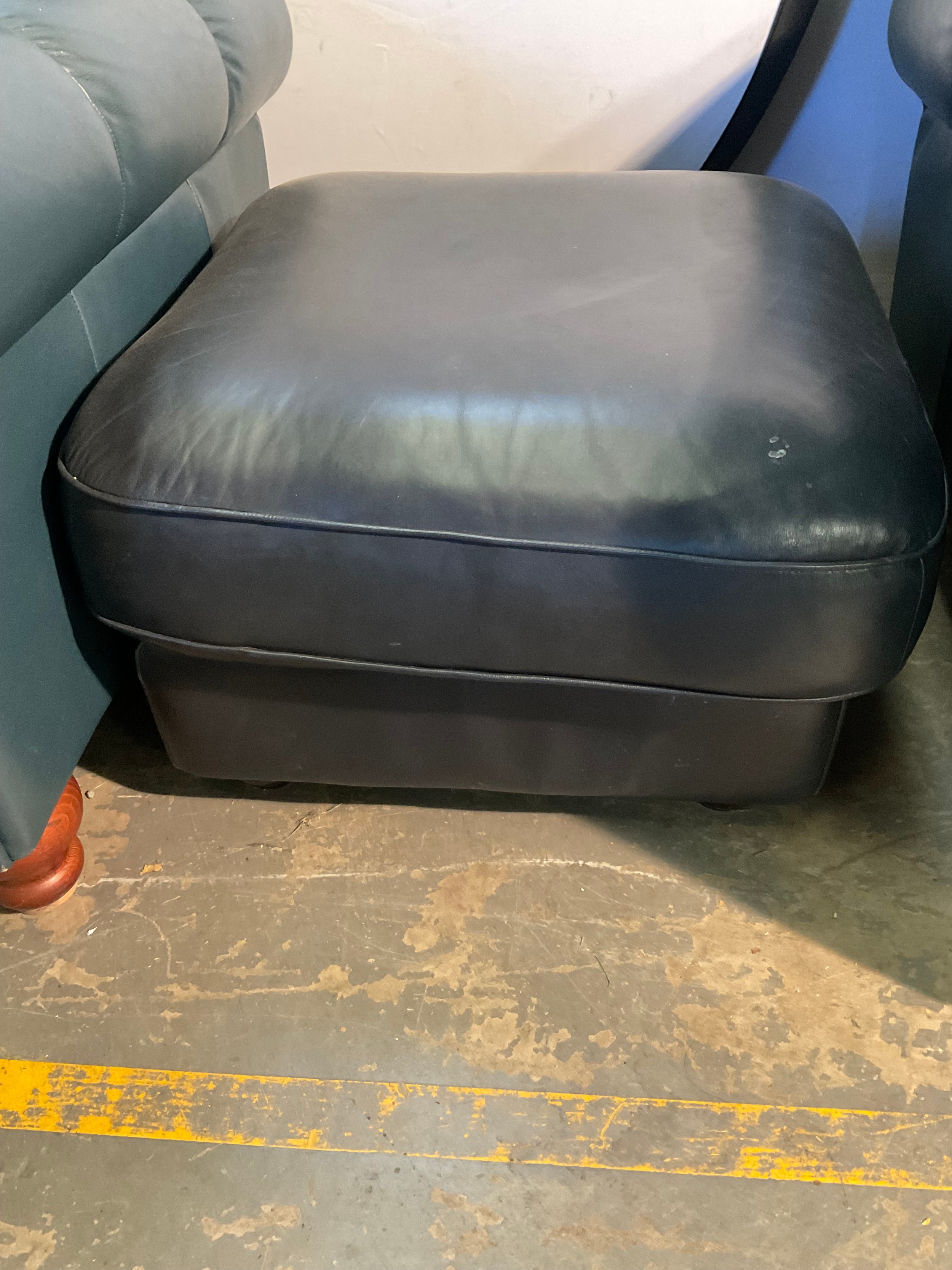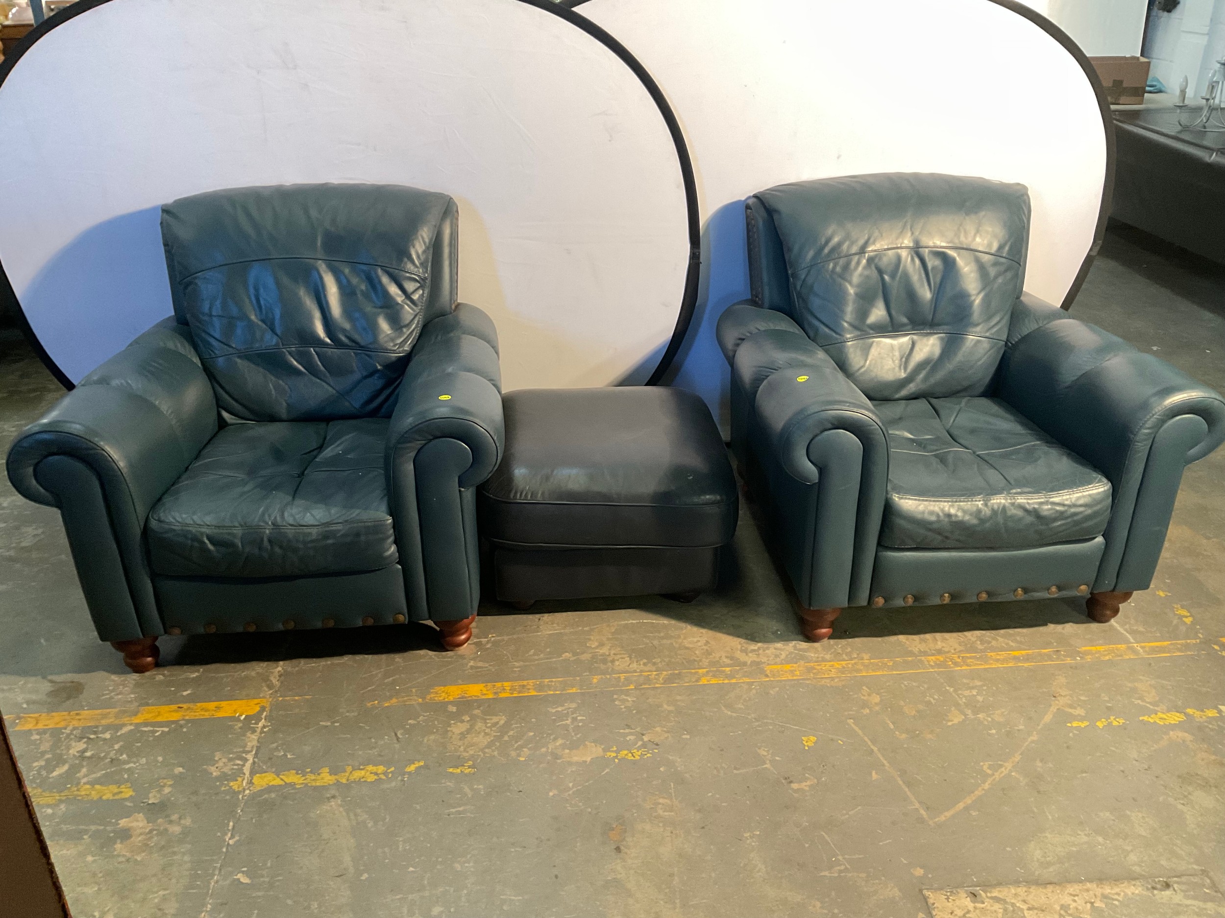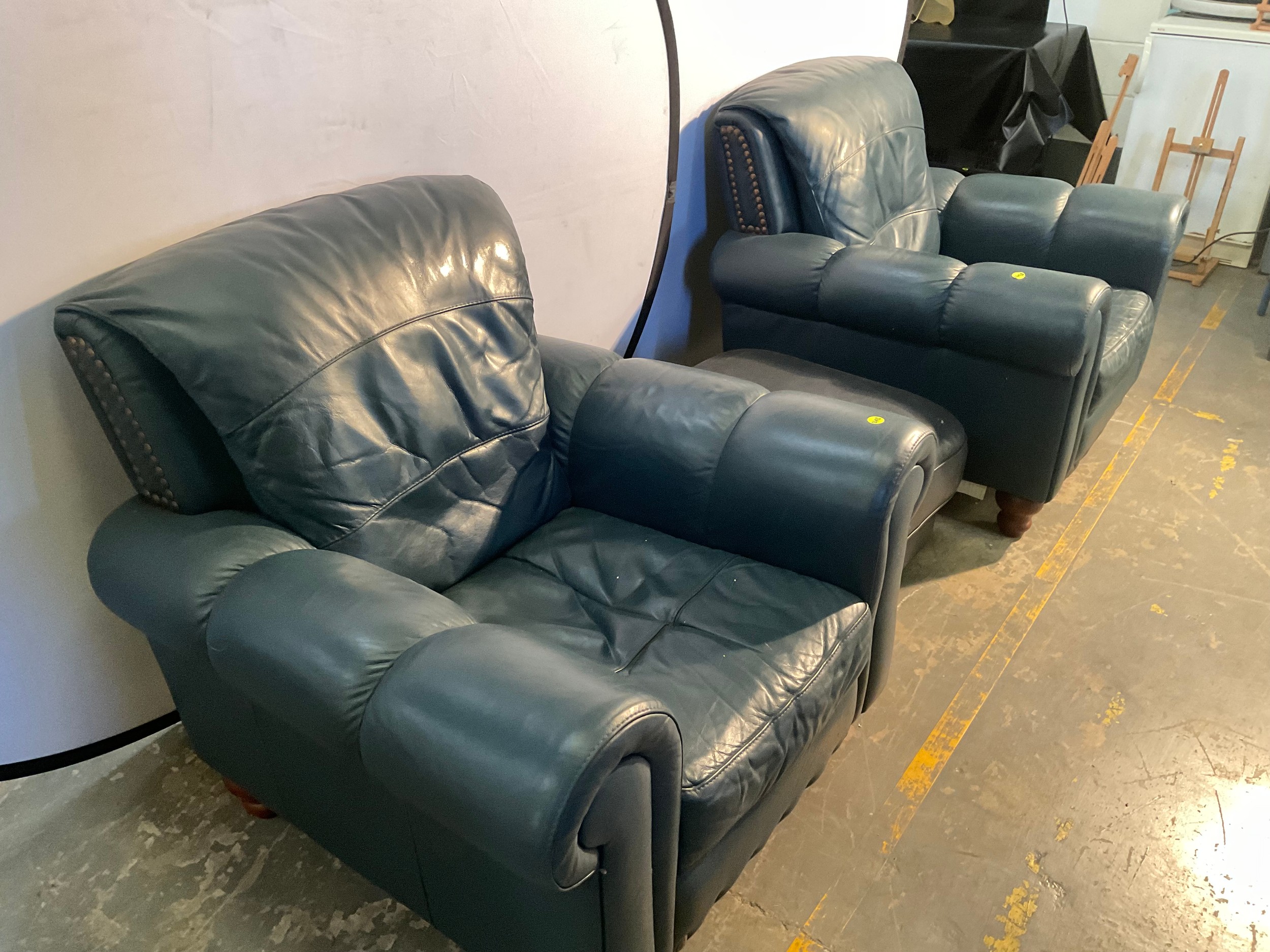 PAIR BLUE LEATHER ARMCHAIRS AND MATCHING FOOT STOOL