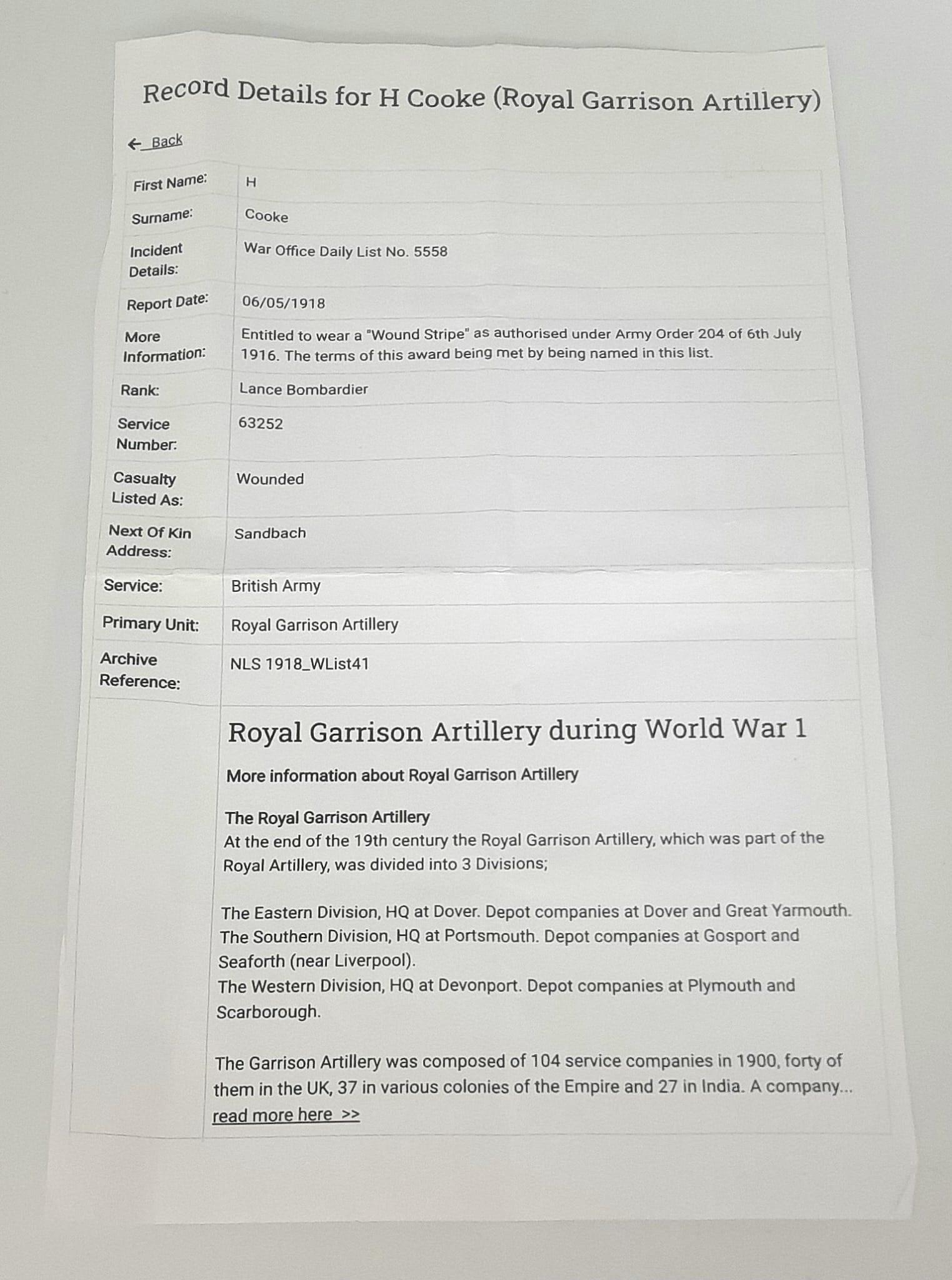 WW1 British Medal Duo, Wound Stripe and Photograph awarded to: 63252 Bombardier H. Cooke Royal