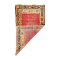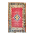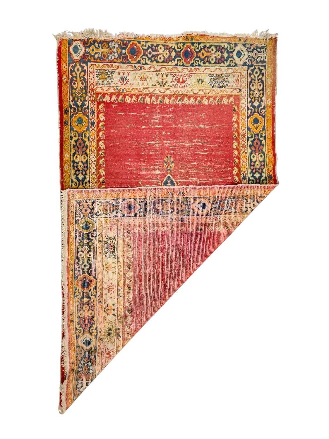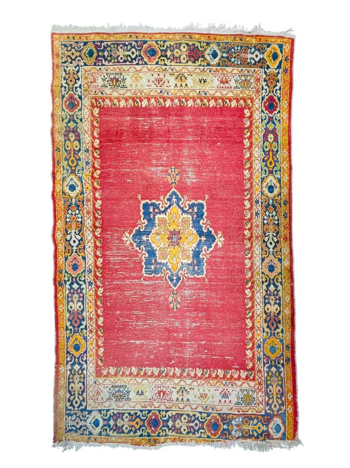 An antique Ushak rug. Late 19th century, the red field with one central medallion, within a navy and orange border, 204cm x 128cm excluding fringes.