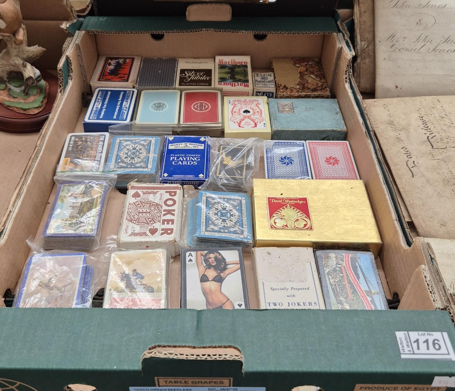 Box containing collectible playing cards including Marlboro and The Black Cat Greyhound Racing Game