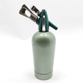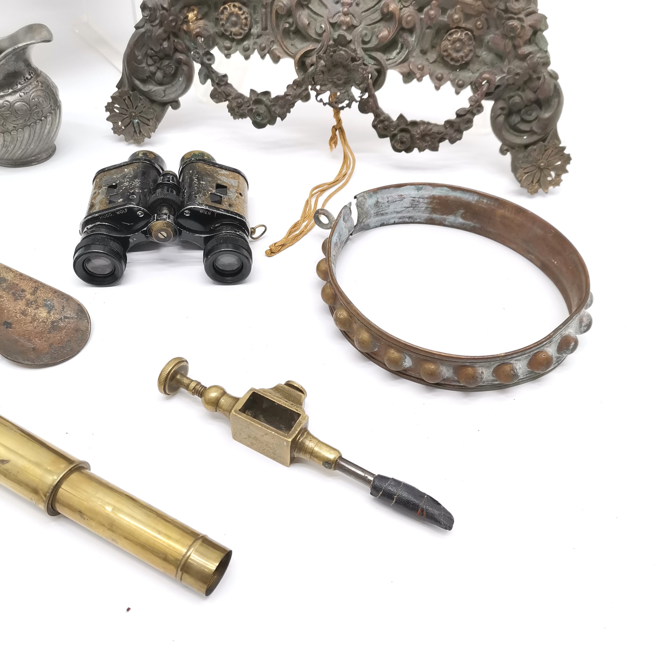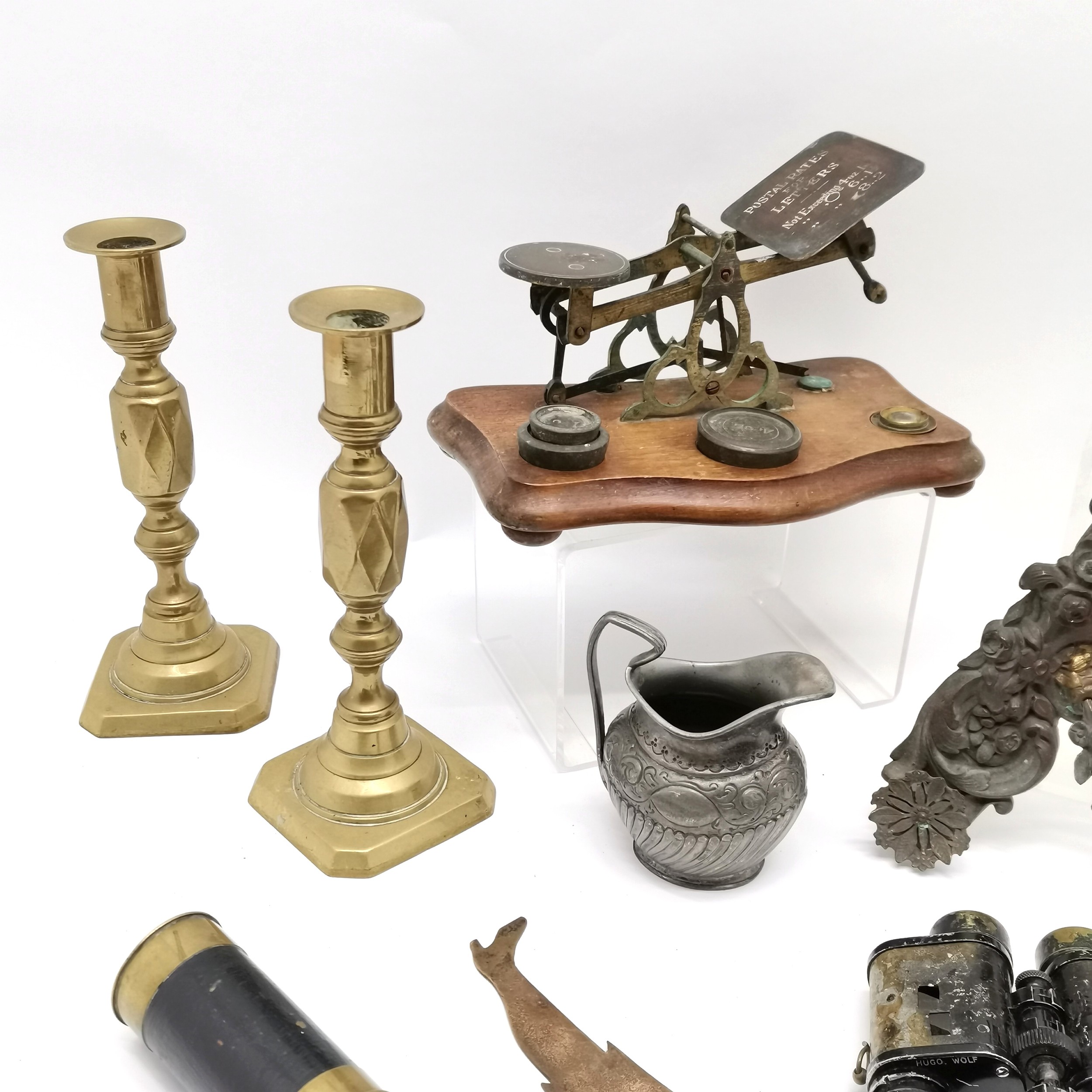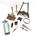 Qty of metalware inc antique leg shoehorn (18cm), part elaborate cast easel stand, candlesticks, soda syphon etc