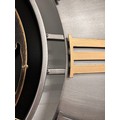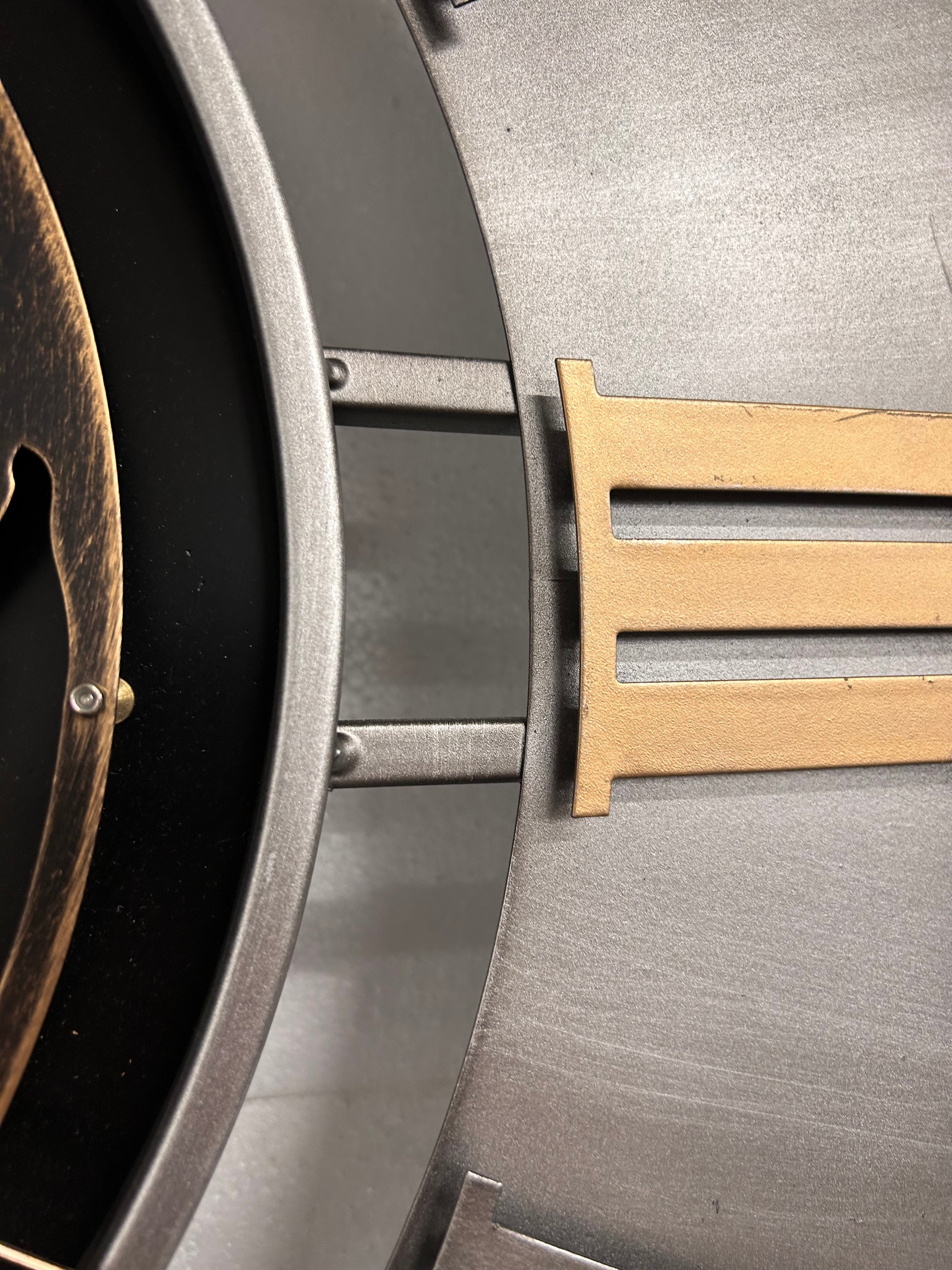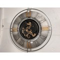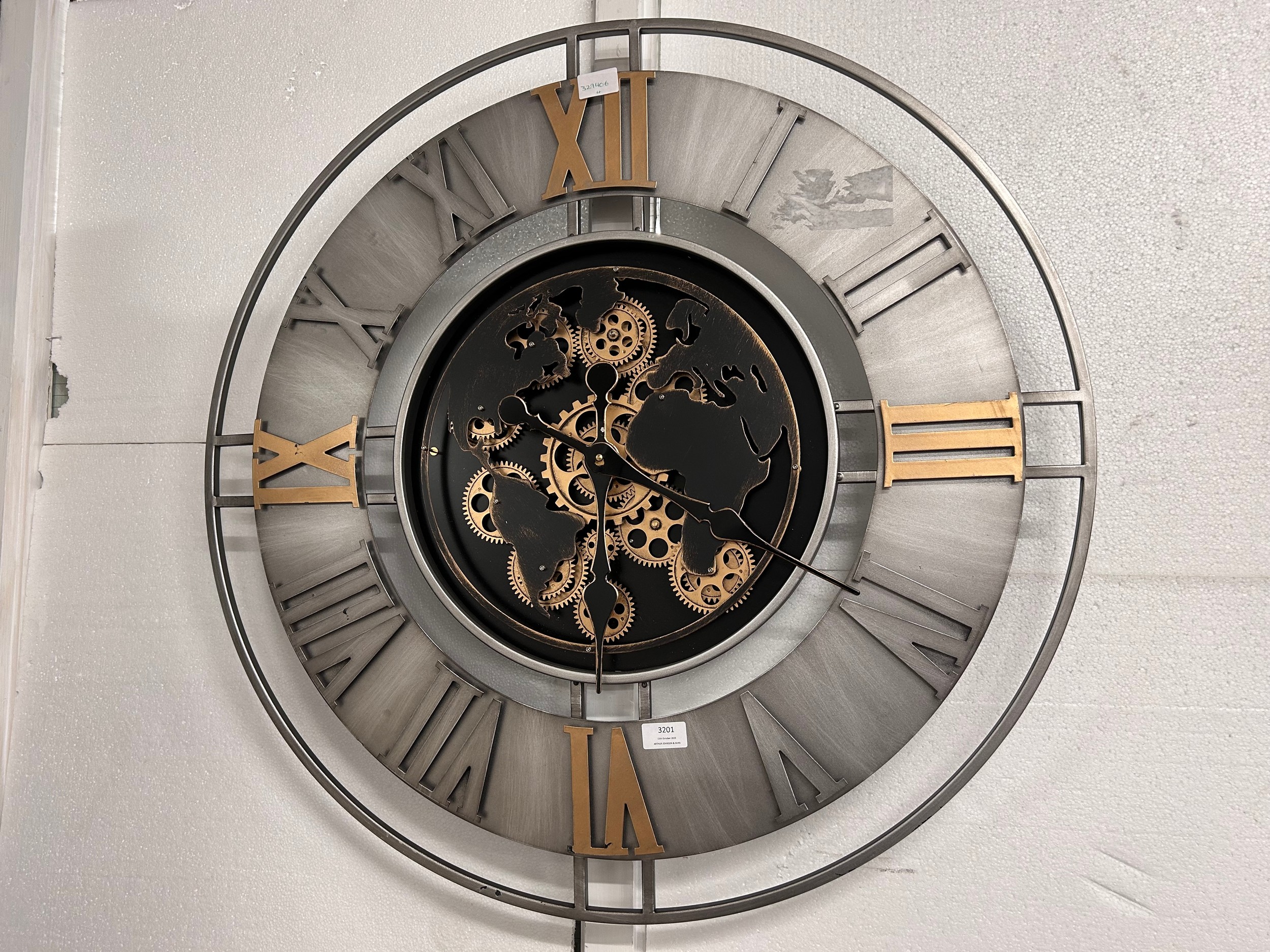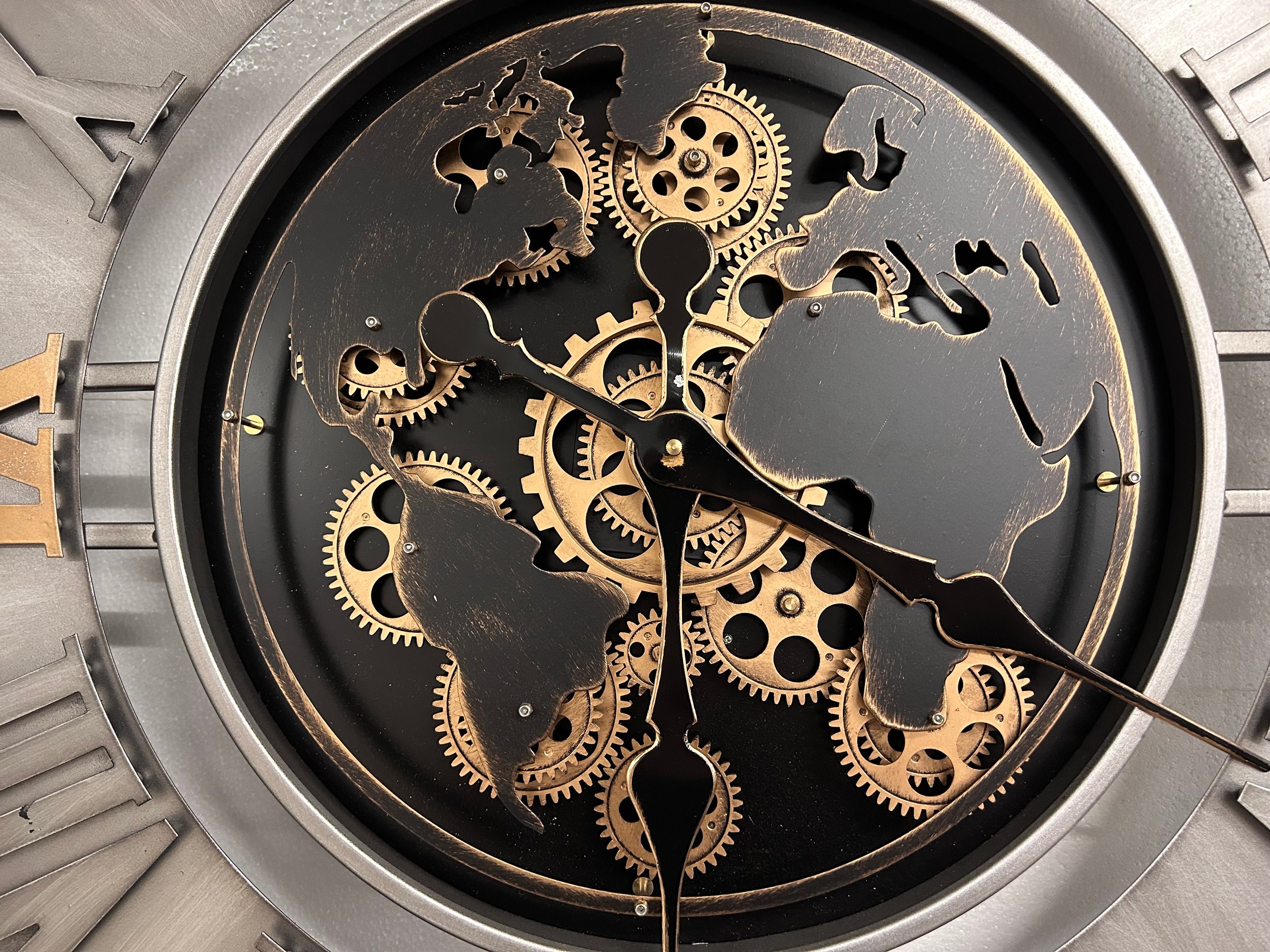 A large silver, black and gold world moving gear clock