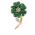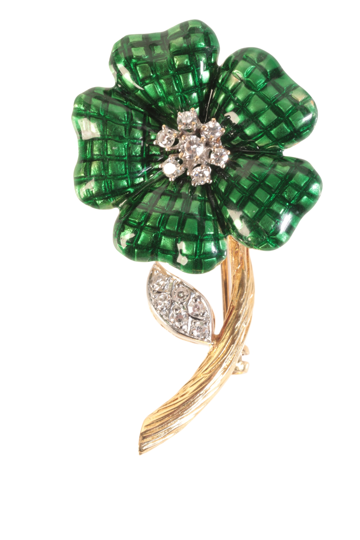in 18ct gold, circa 1970s, the petals set with green enamel over a geometric design, set with a cluster of round brilliant cut diamonds, the leaf set with further single cut diamonds, all totalling c.0.30 carats, to a textured stem, secured with a pin clasp, no assay marks, 4.8cm, (gross weight - c.14.4g)
