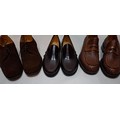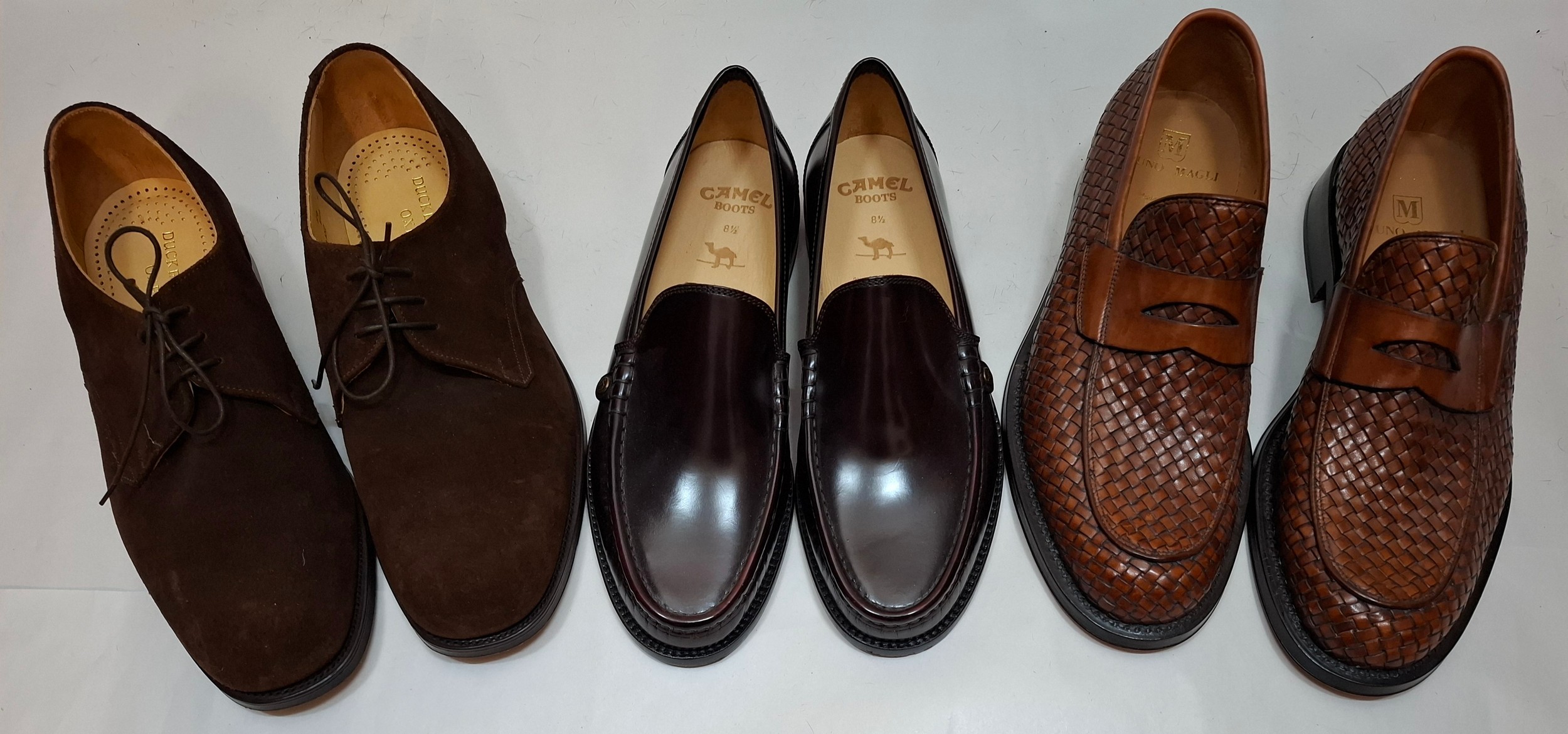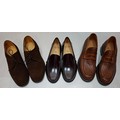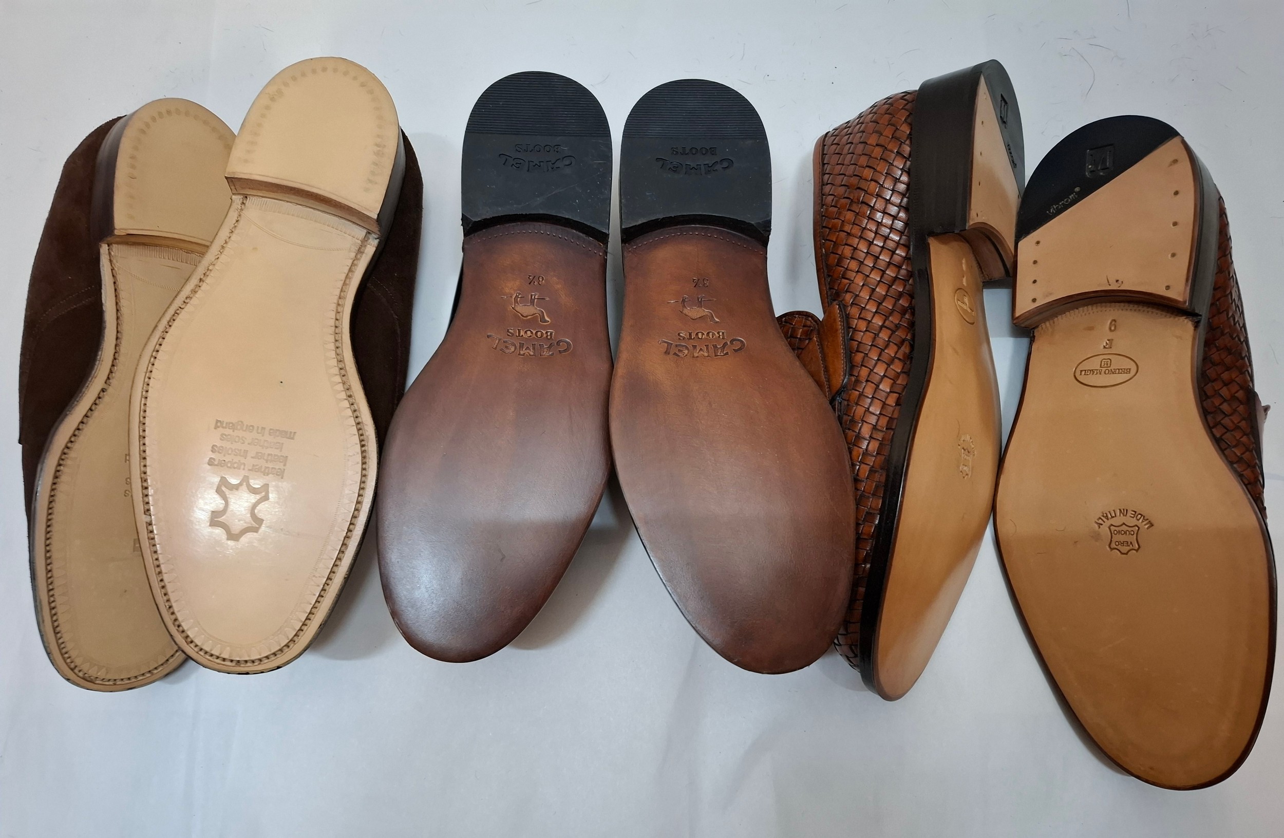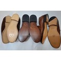 Three pairs of gents leather shoes, unworn and as new, to include Camel brown slip ons size 8.5F, Bruno Magli tan lattice design shoes size 9F and a pair of Ducker & Son brown suede lace-ups size 9E. Location: BWR