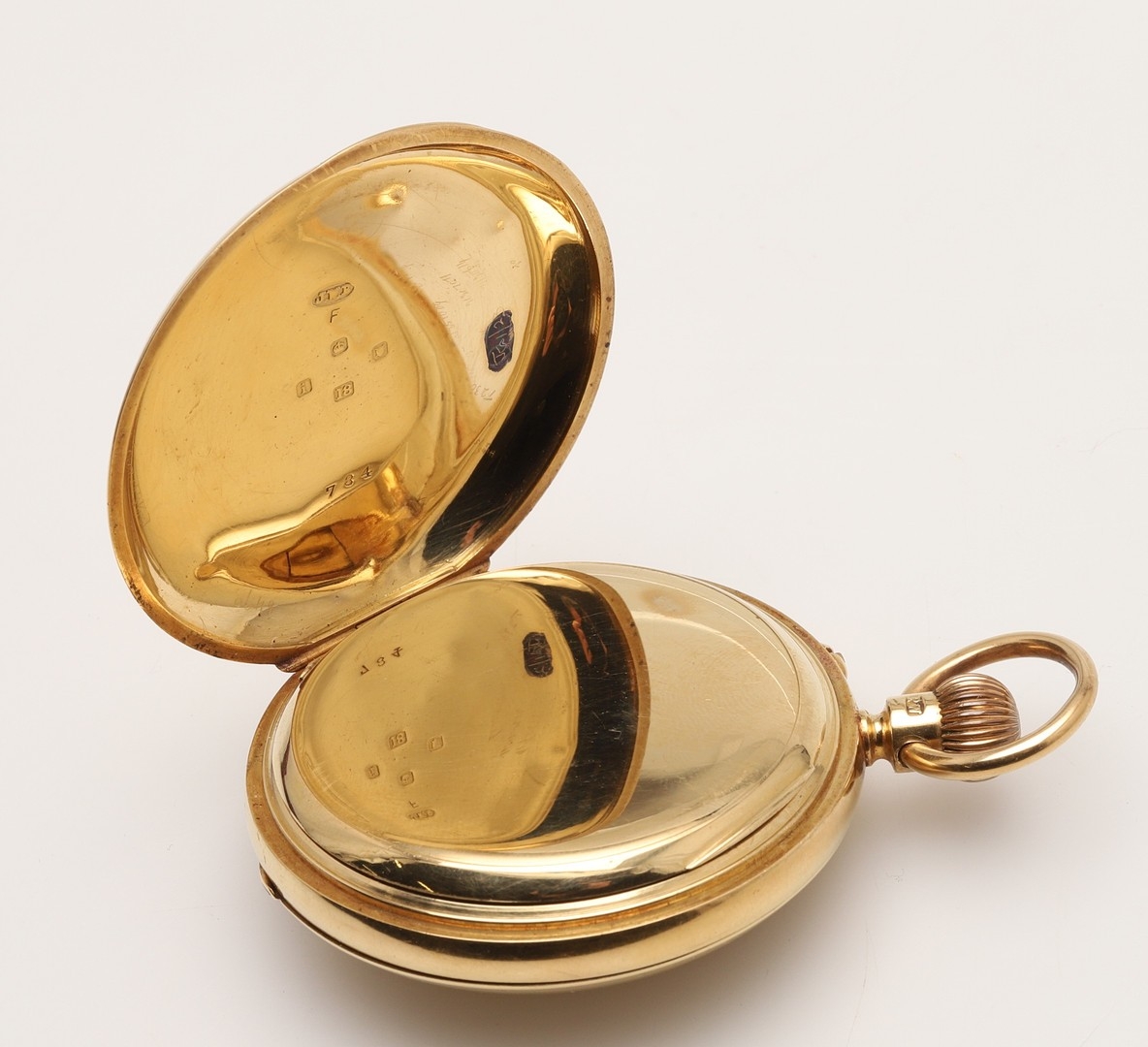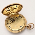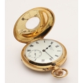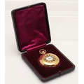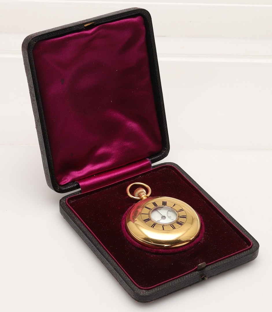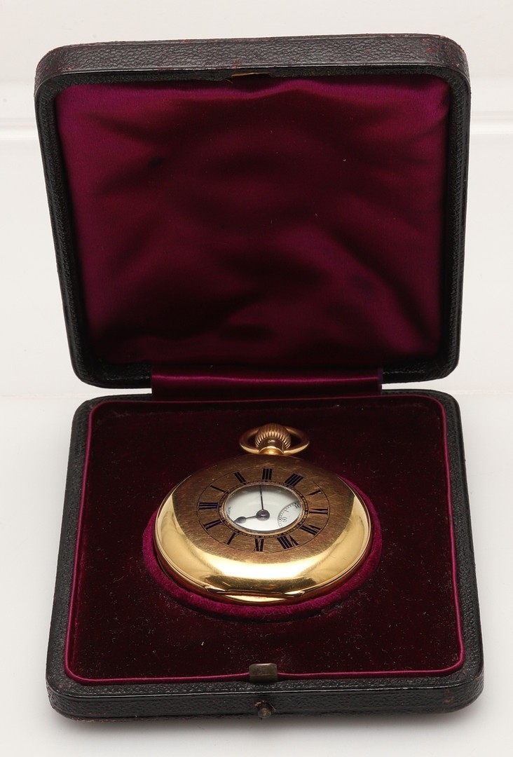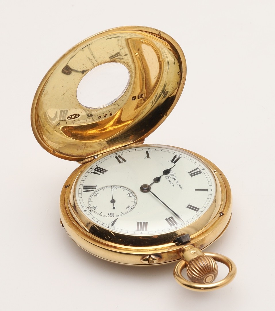AN 18CT GOLD HALF HUNTING CASED POCKET WATCH BY J.W. BENSON, LONDON. the signed white enamel dial with black Roman numerals and subsidiary seconds dial, hallmarked for London 1904, three quarter plate movement, inscribed with a crest to the back case, 50mm dia., 119.1 grams, in fitted case.