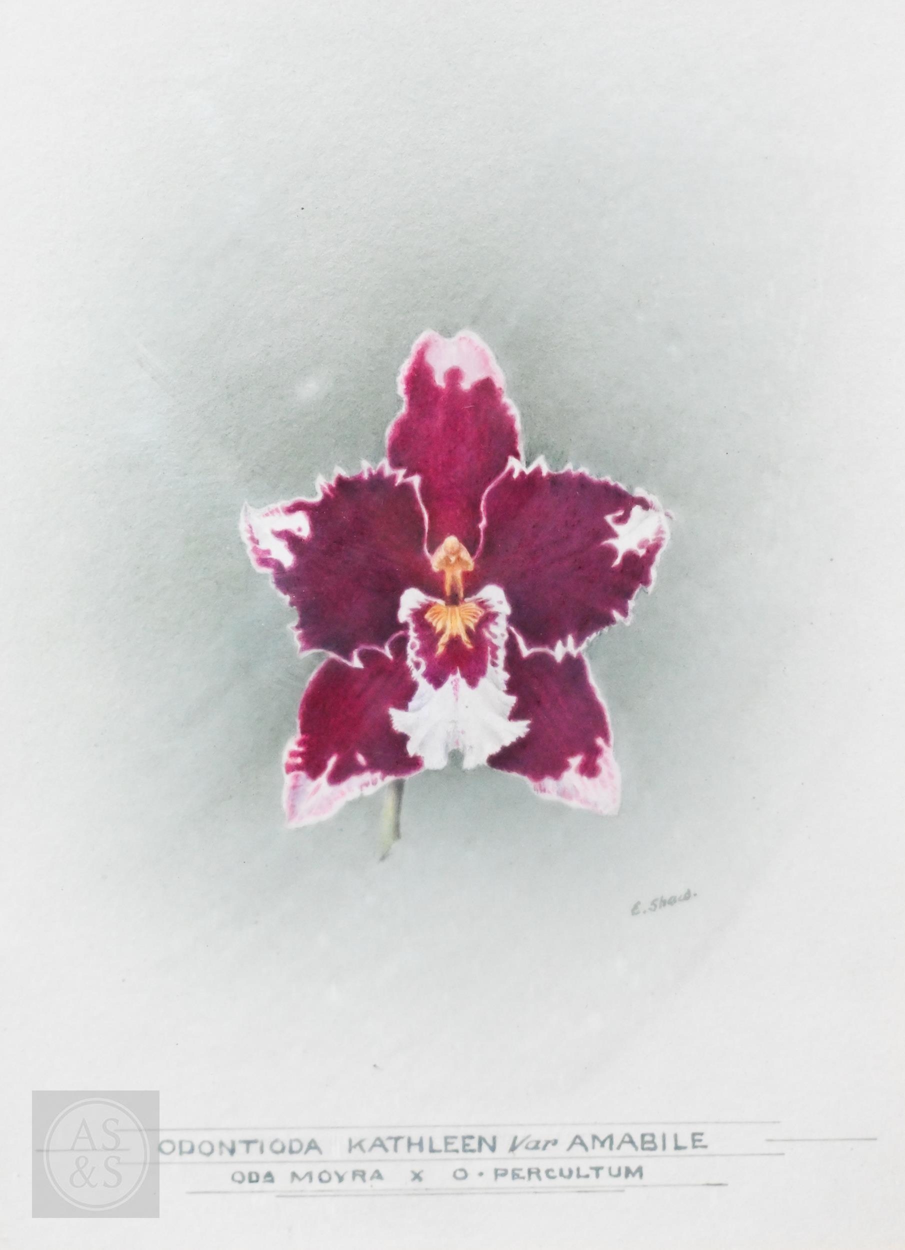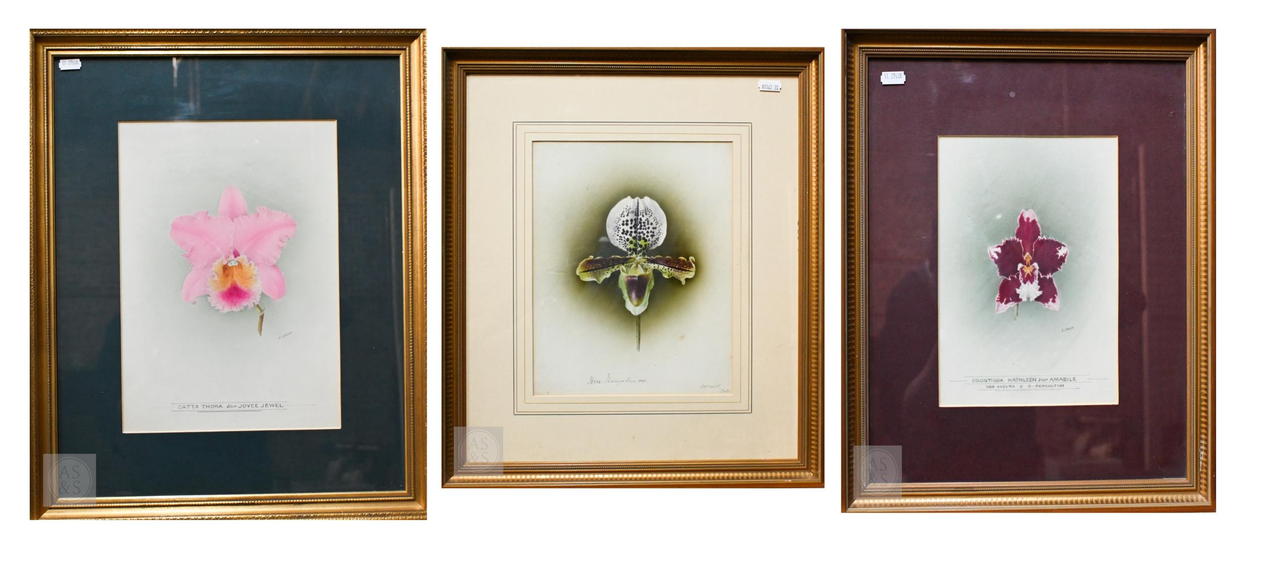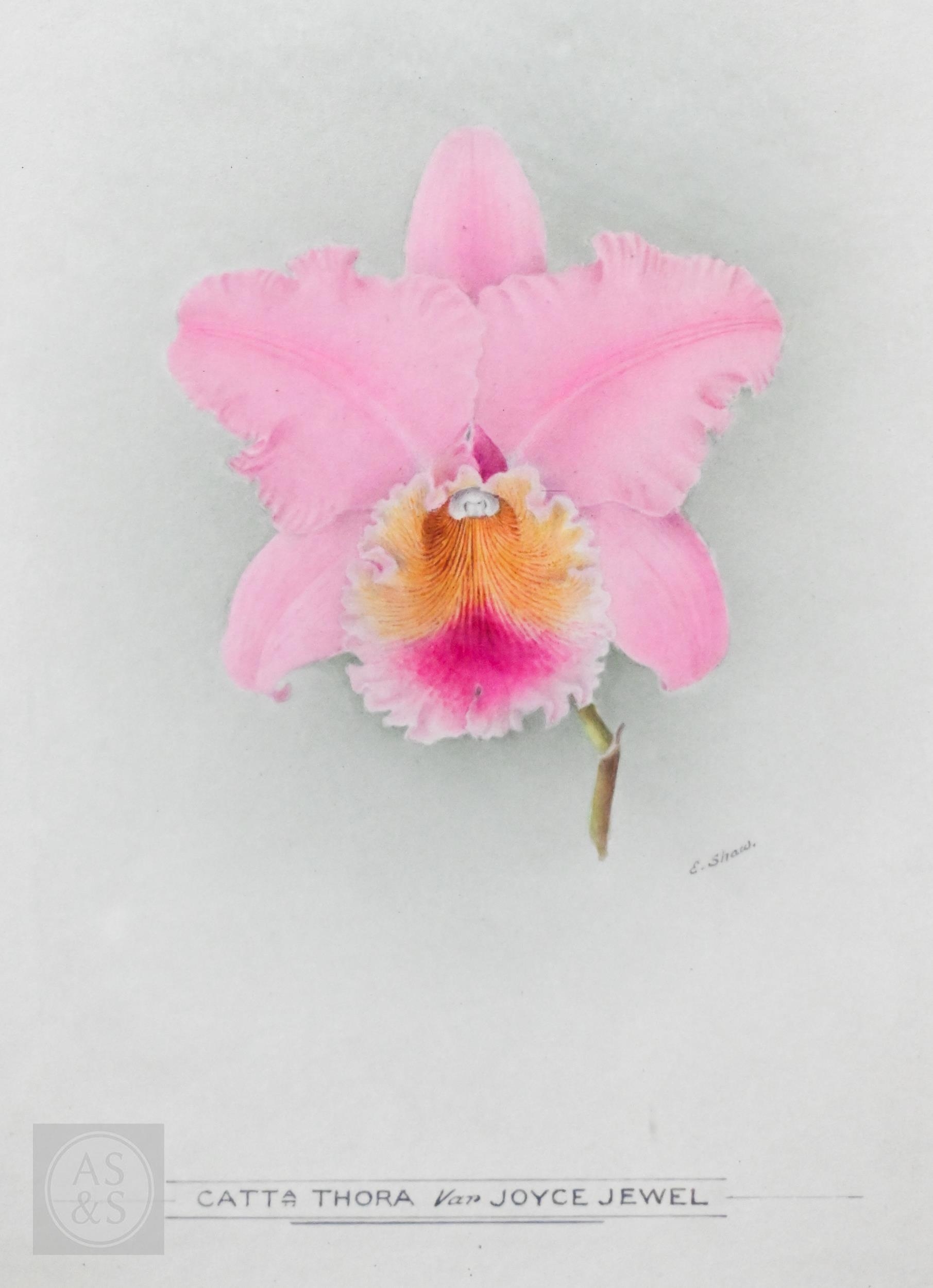 E Shaw - Two botanical RHS watercolour studies of orchids, signed, 34 x 24 cm and 24 x 18 cm to/w La Mont - a watercolour orchid study, 27 x 21 cm (3)
