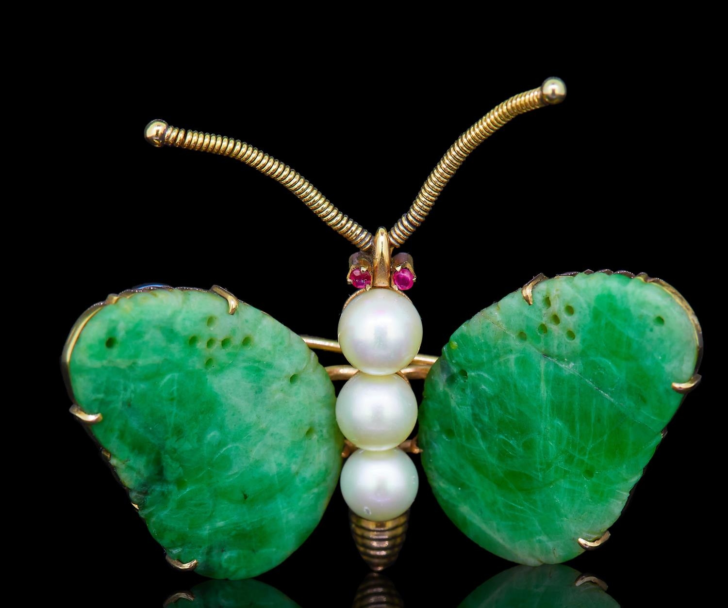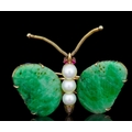 JADE, PEARL AND RUBY BUTTERFLY BROOCH, the wings eash set with a carved green jade. the body set with 3 pearls and ruby eye accents. The antenna of spring wire design. W. 4.7 cm. 13.4 grams.