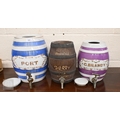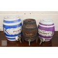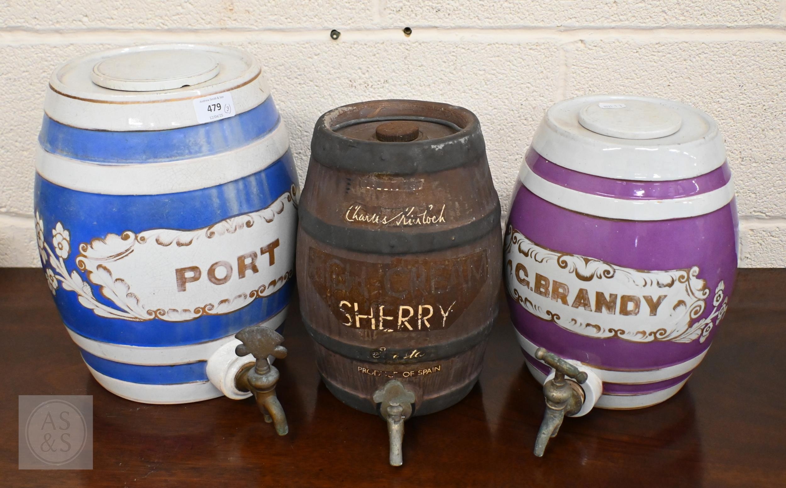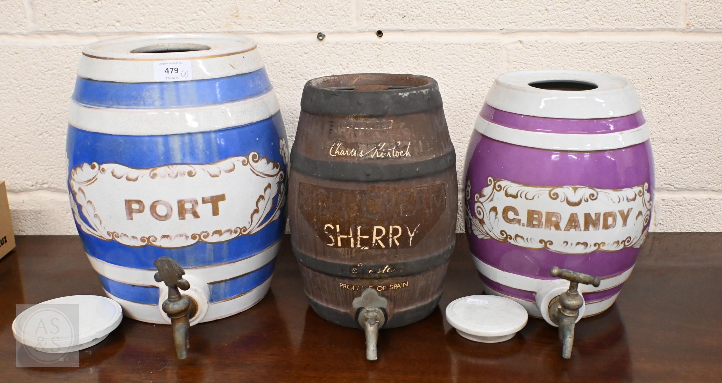 Three pottery barrels with brass spigots, for Port, G Brandy & Charles Kinlock Sherry