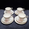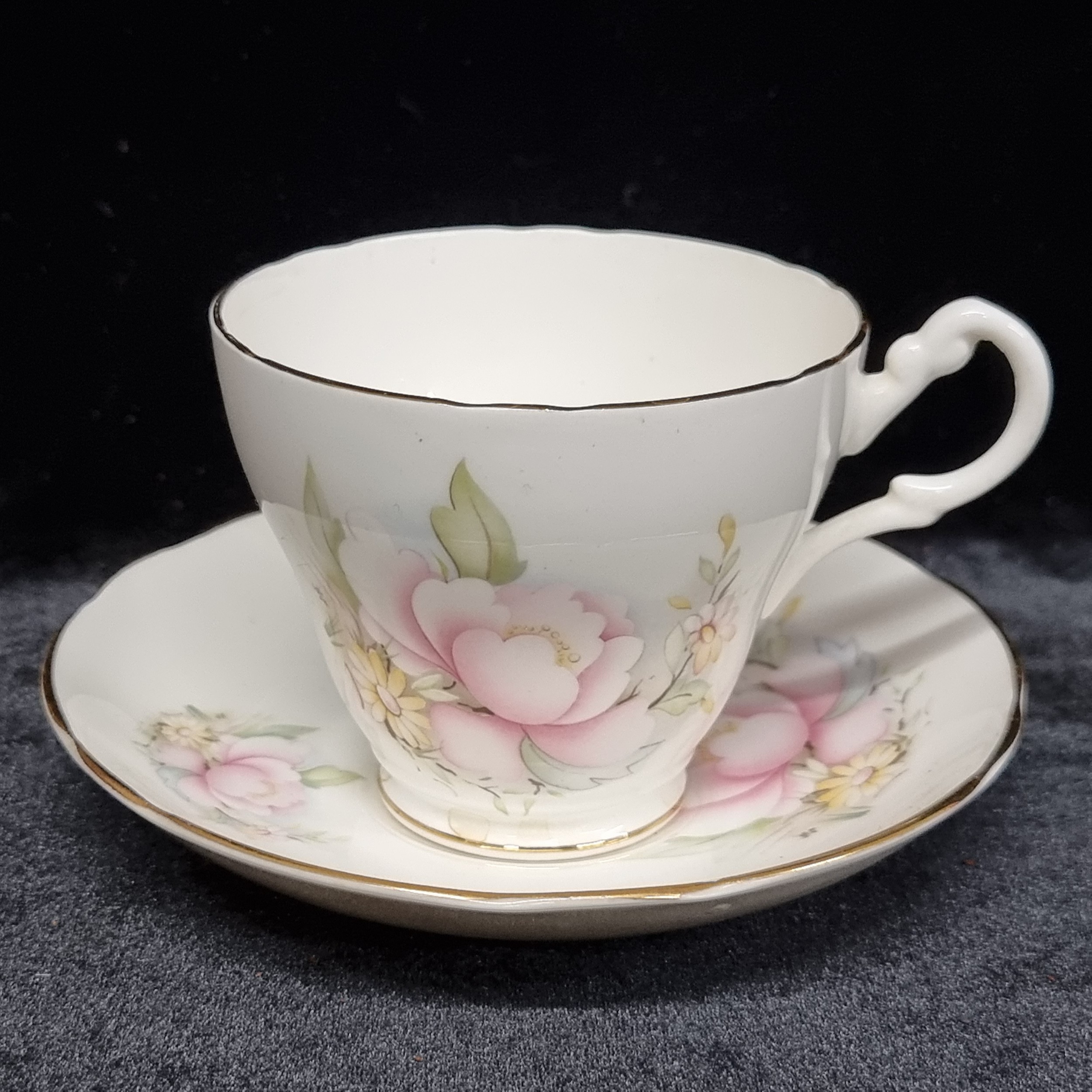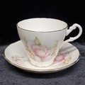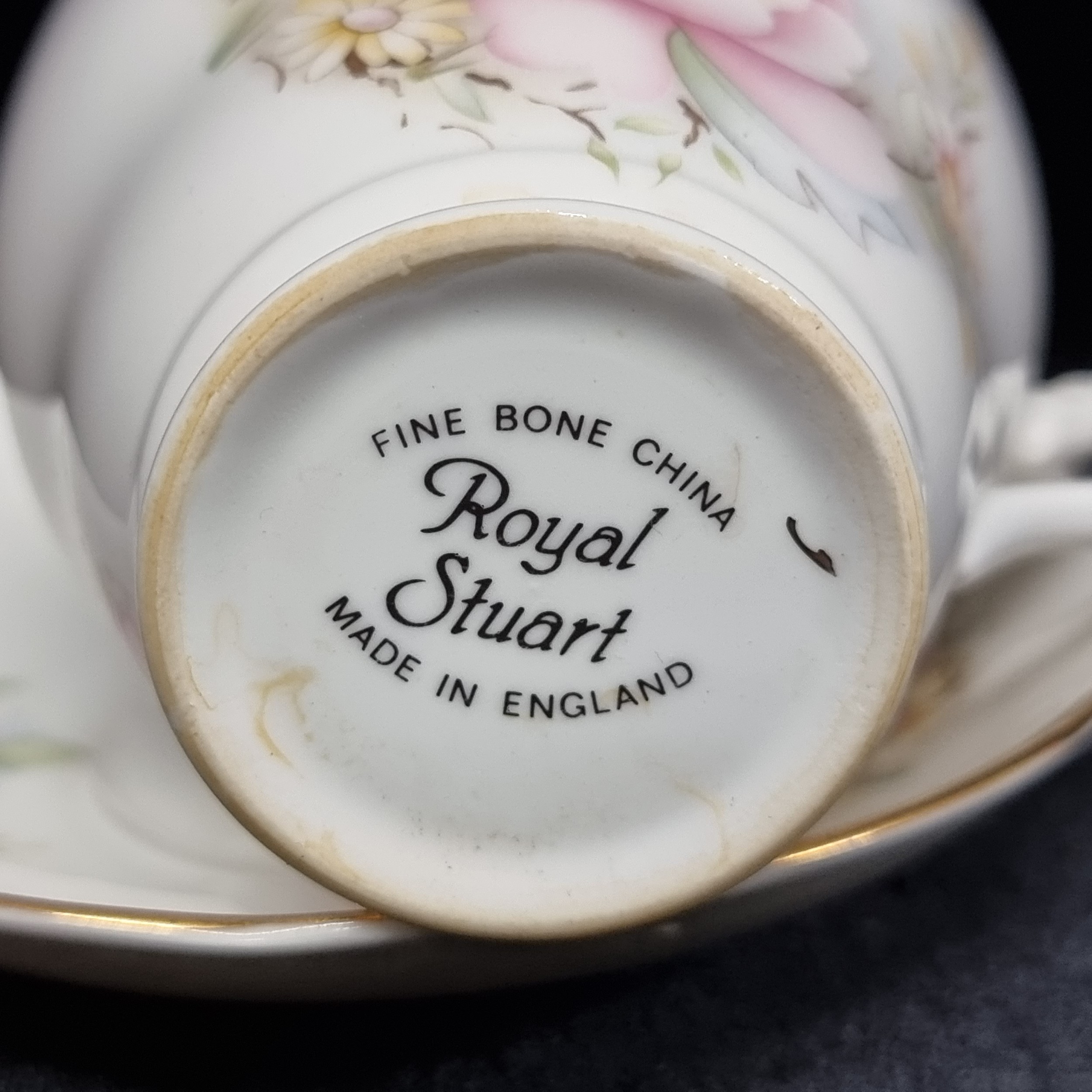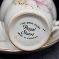 12 piece 1950s Royal Stuart fine bone china part tea set with the "Pink Magnolia" pattern and a gilded gold edging. Made in England and in great condition.