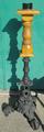 Candle Holder on cast metal base with twin fish head entwined stem, part reeded collared centre on tripod supports with baluster turned wooden top section