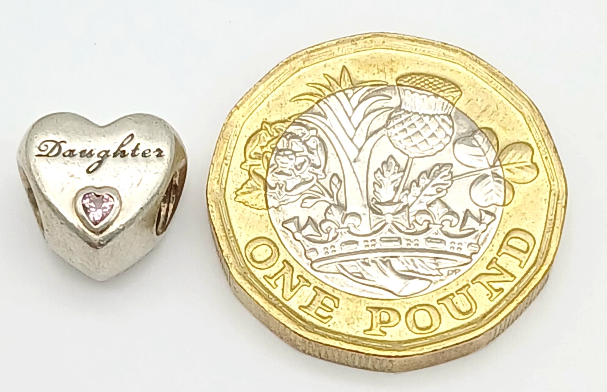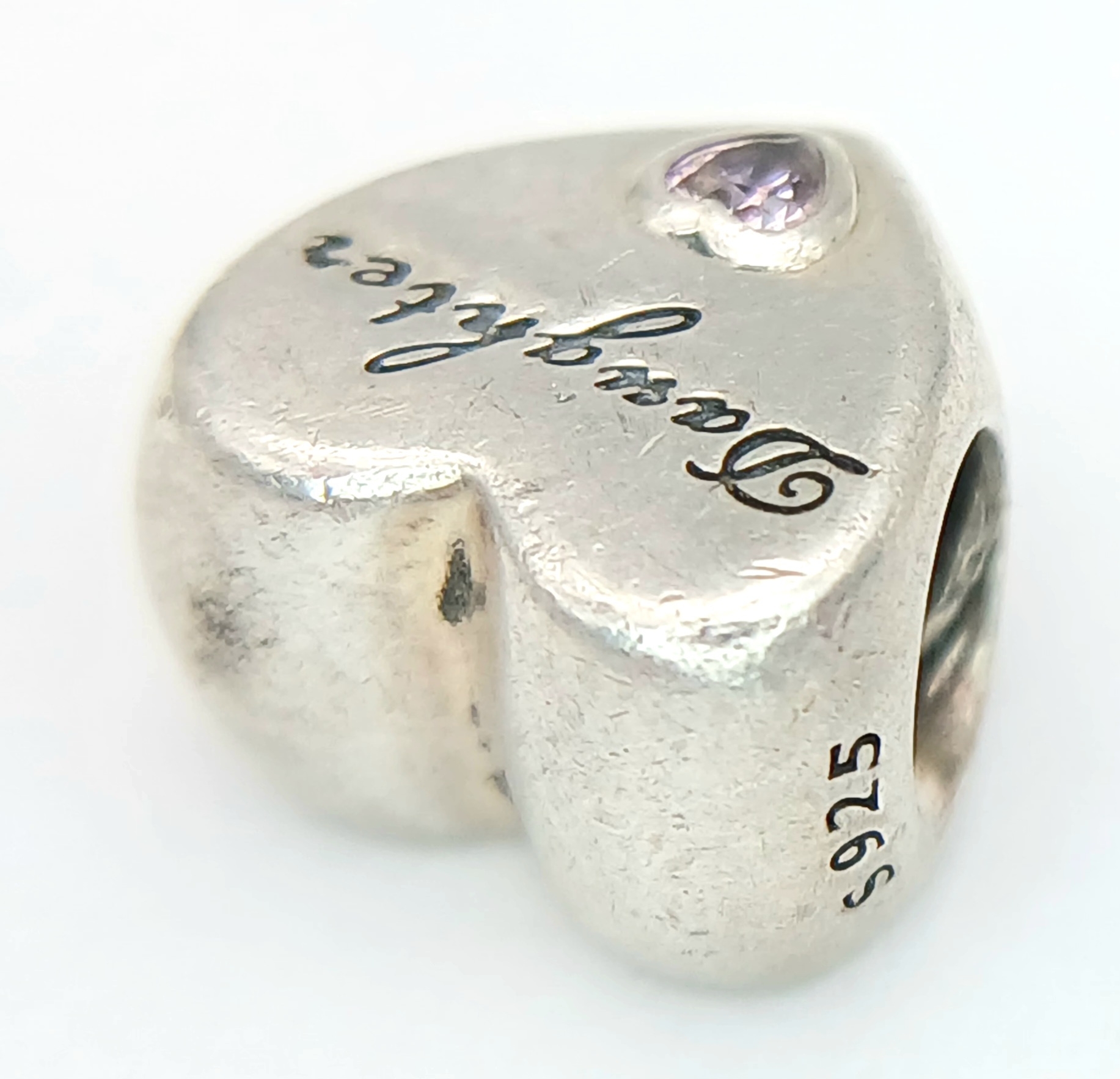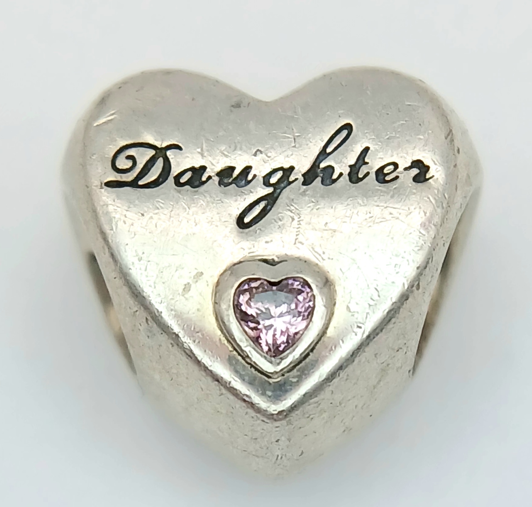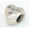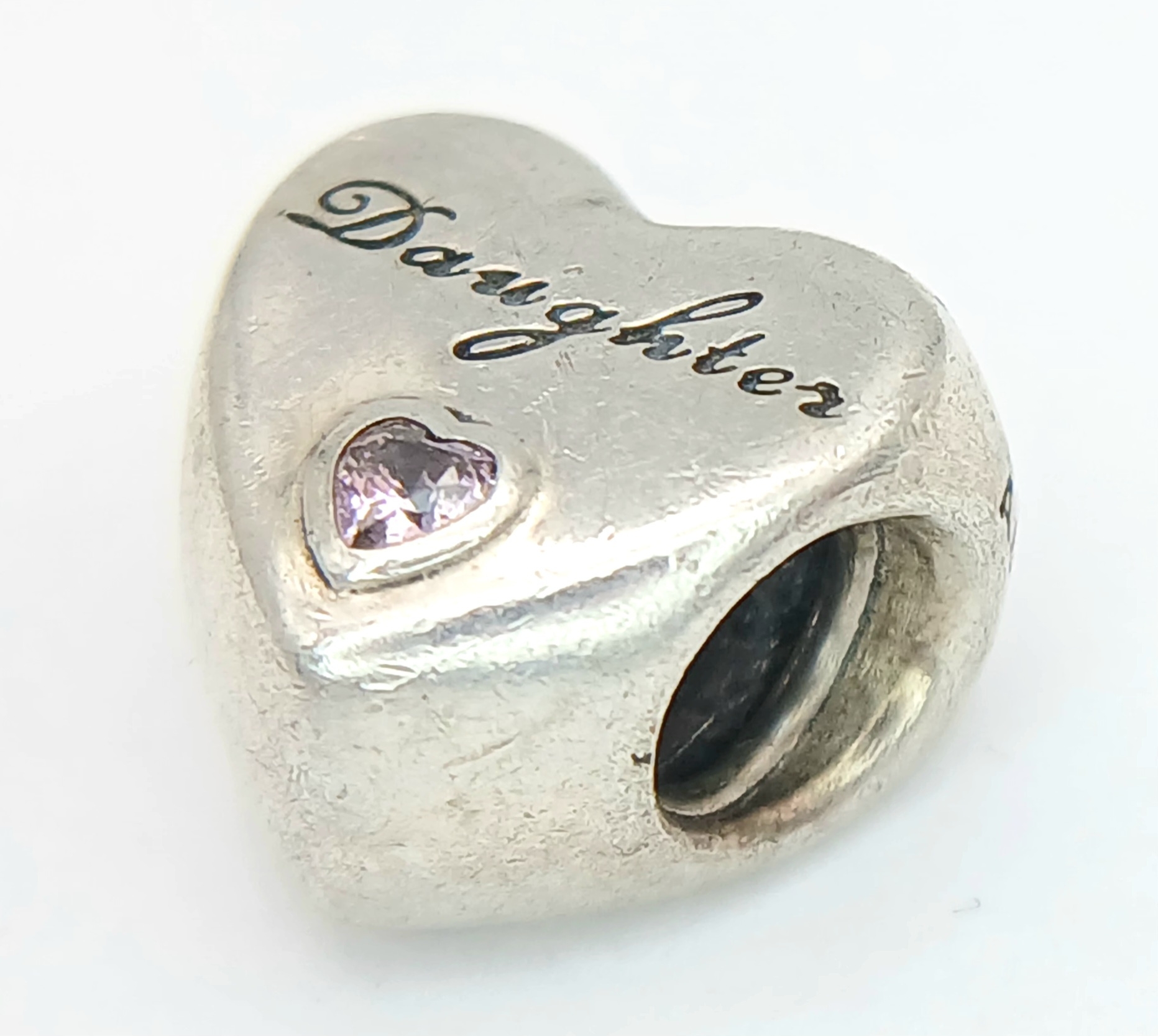 A PANDORA STERLING SILVER HEART STONE SET DAUGHTER CHARM 3.7G. Ref: SC 7099