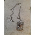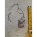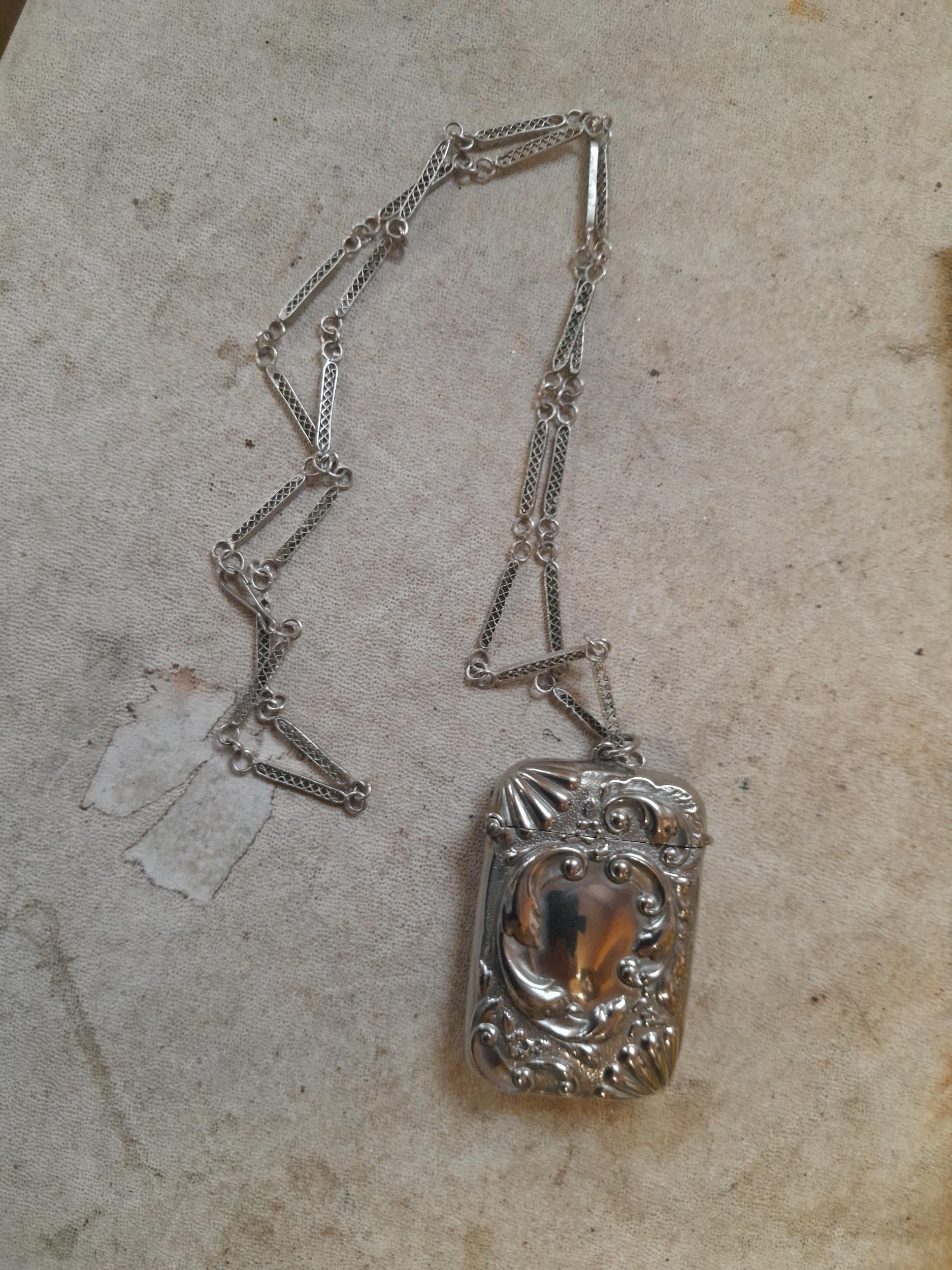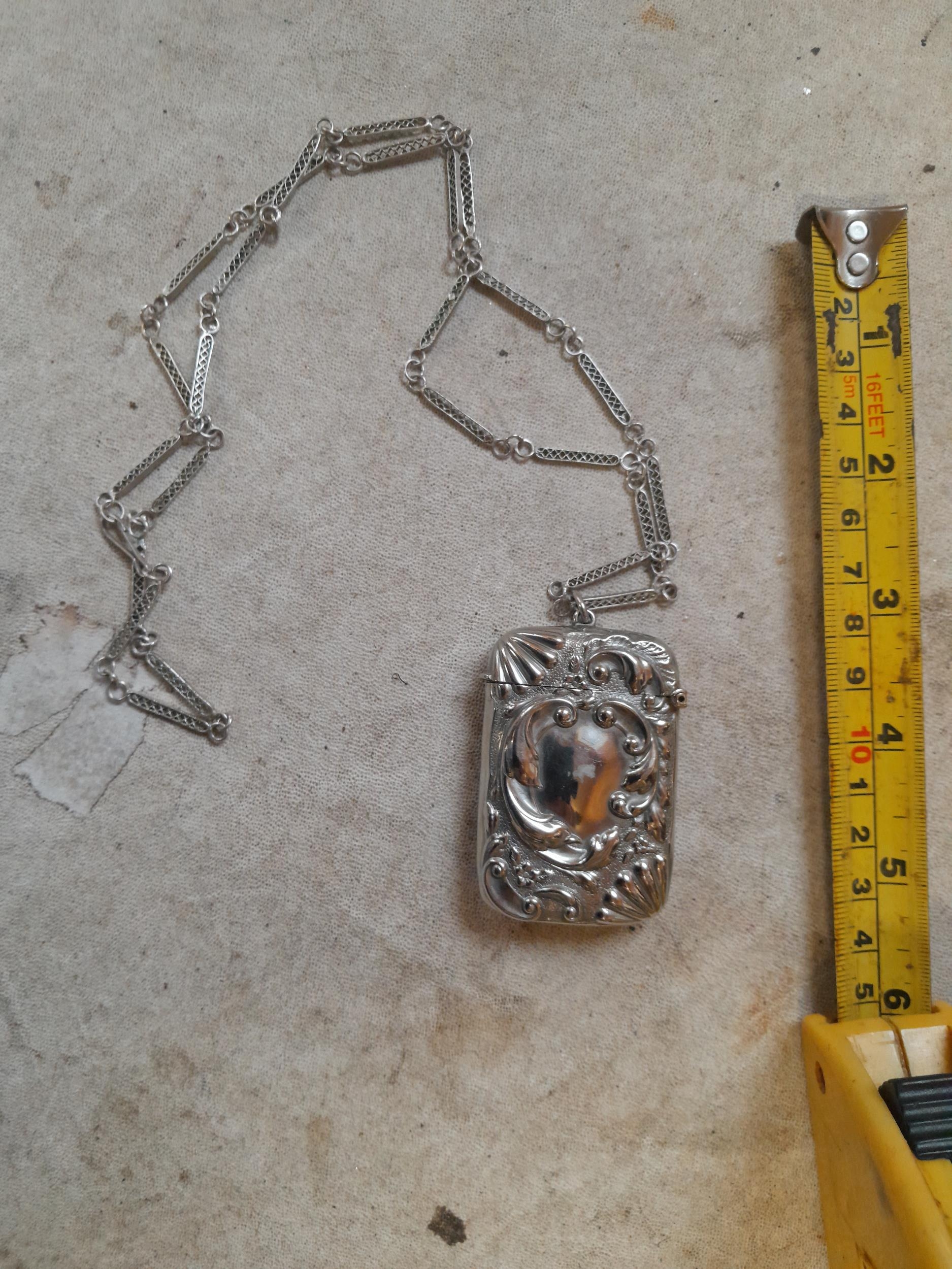 Low grade silver filigree work chain and vesta case