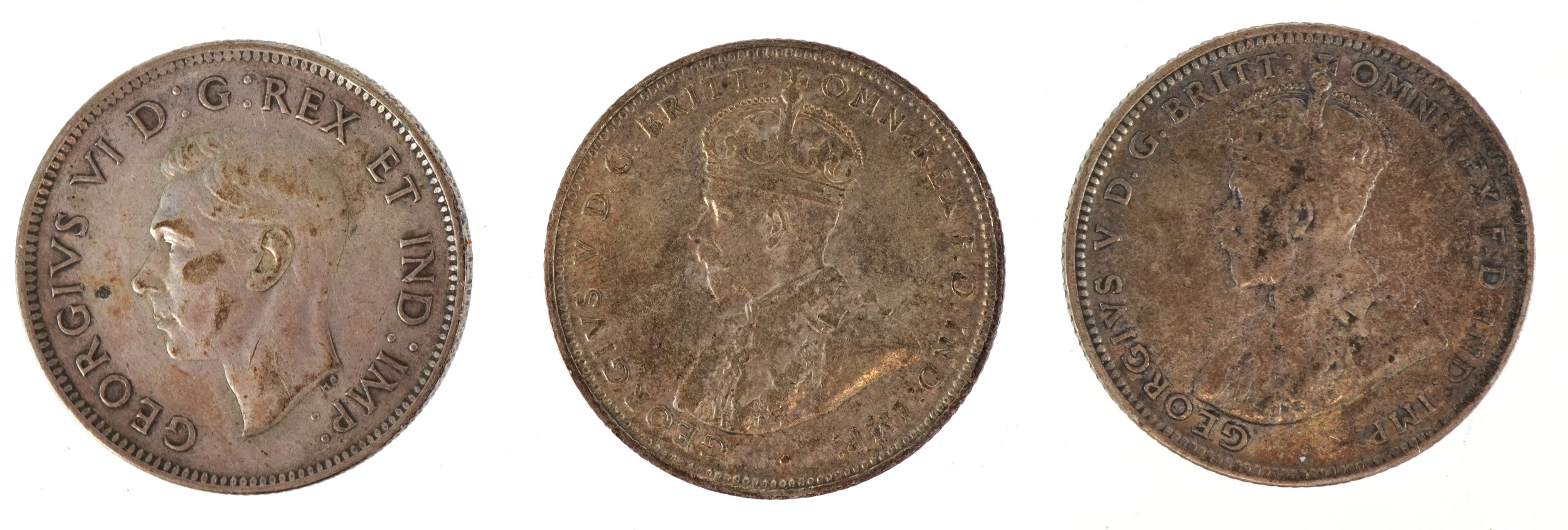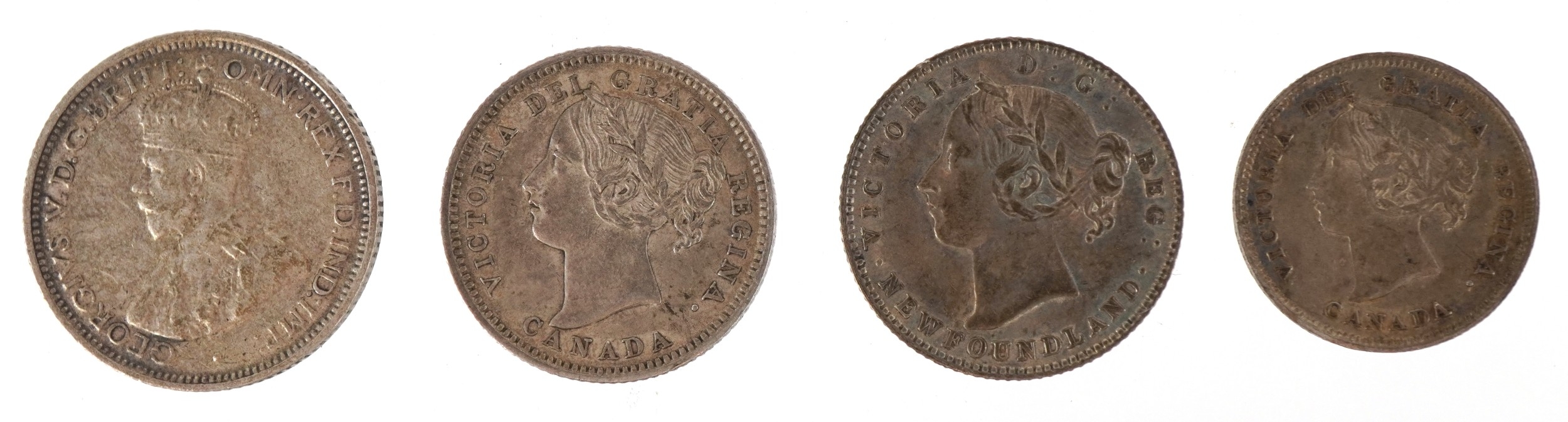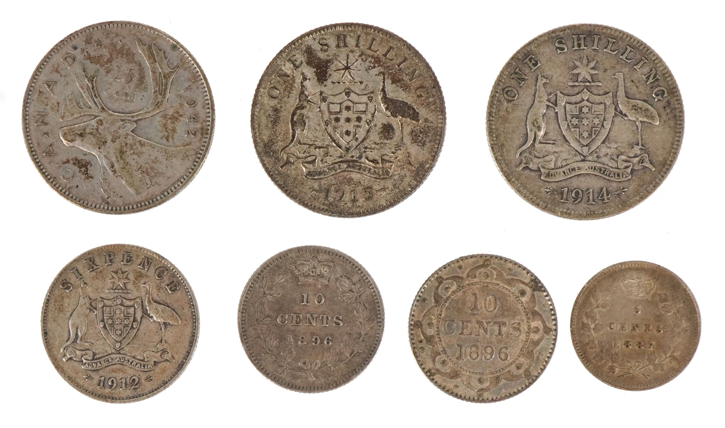 Seven Commonwealth 19th century and later silver coins comprising two Australian silver shillings dated 1914 and 1915, a 1912 sixpence, a Canadian 1942 twenty five cents, an 1896 ten cents and an 1887 five cent together with an 1896 Newfoundland ten cents.