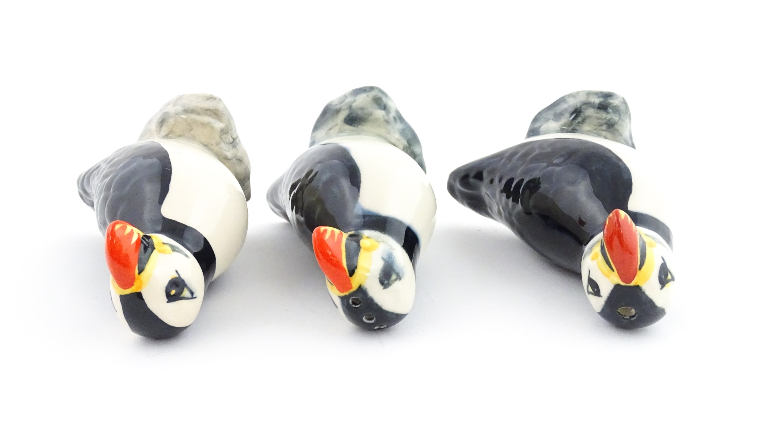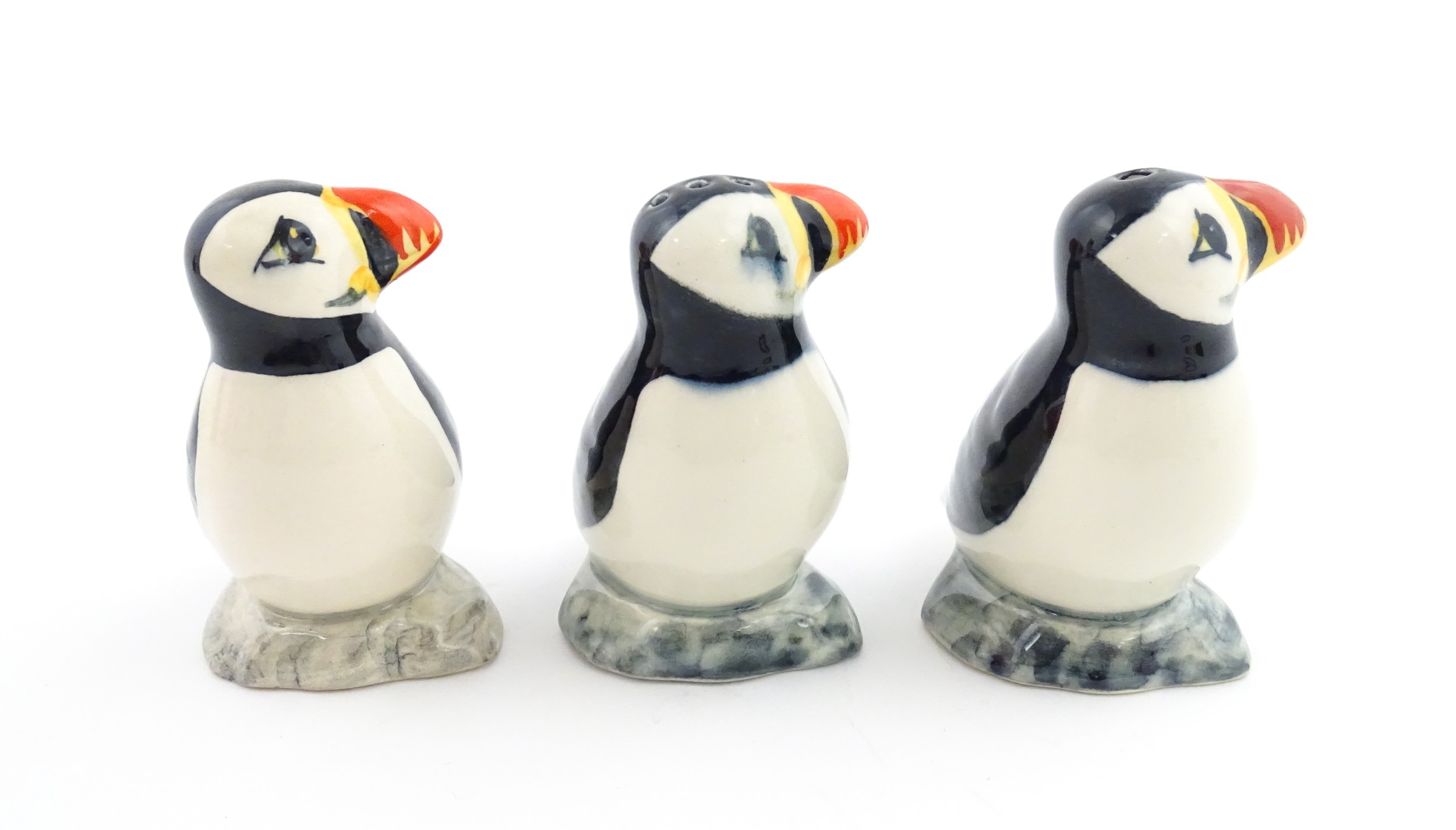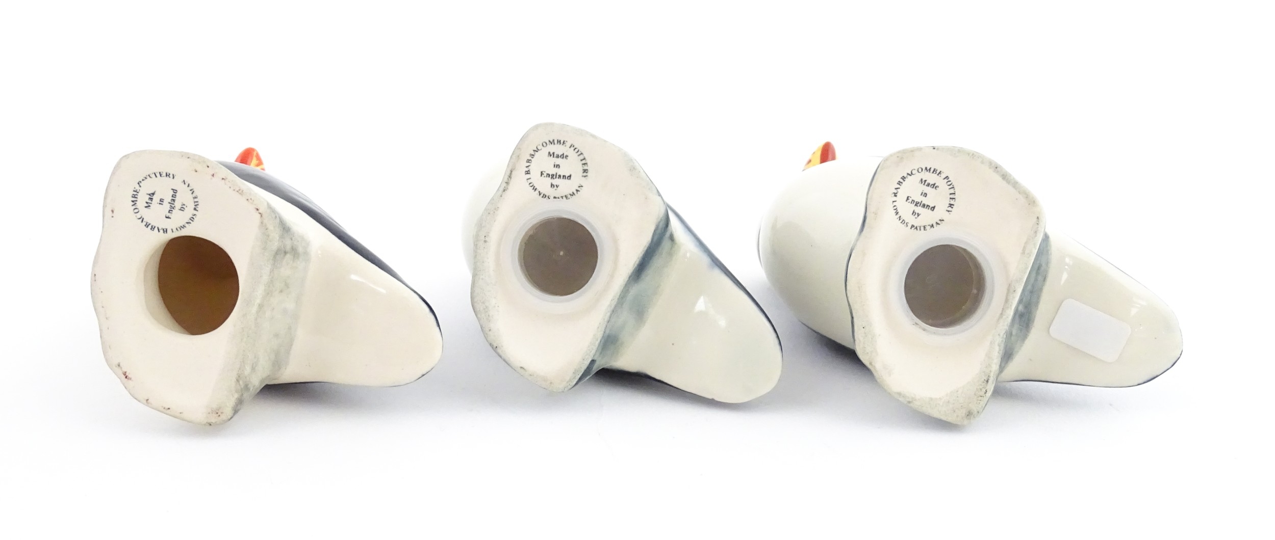 Three Babbacombe Pottery cruets modelled as Puffins. Marked under. Approx. 3 1/4" high (3)