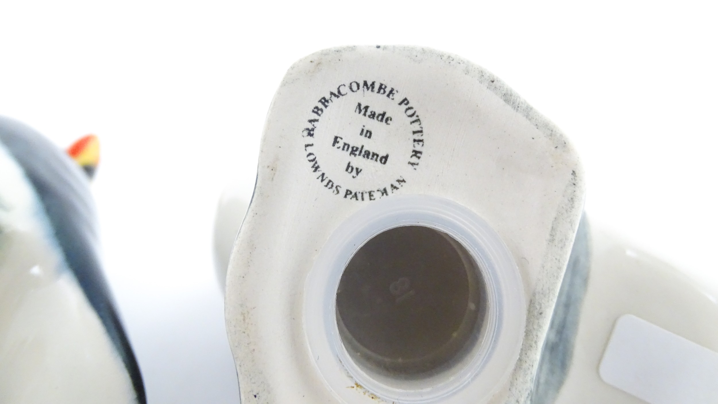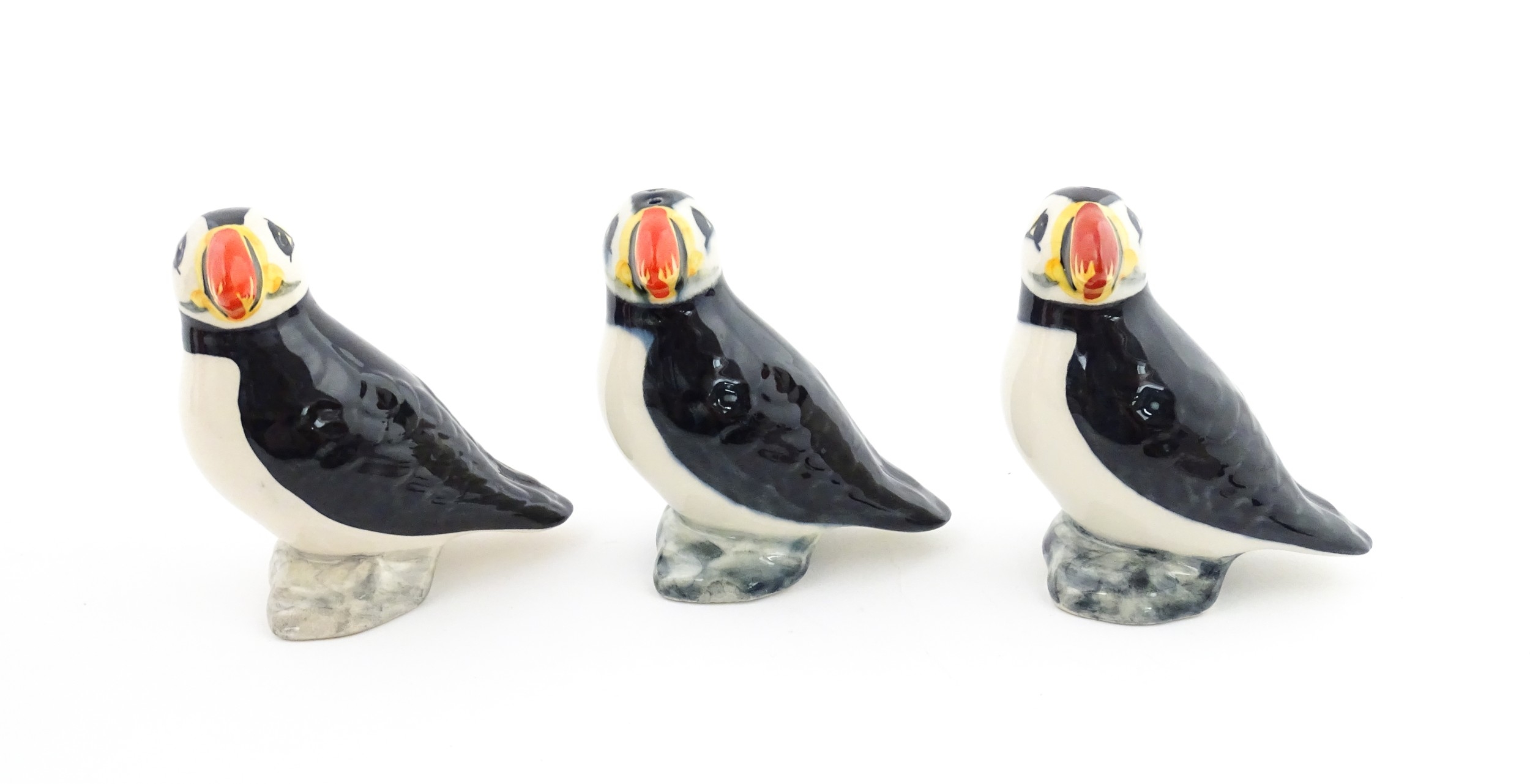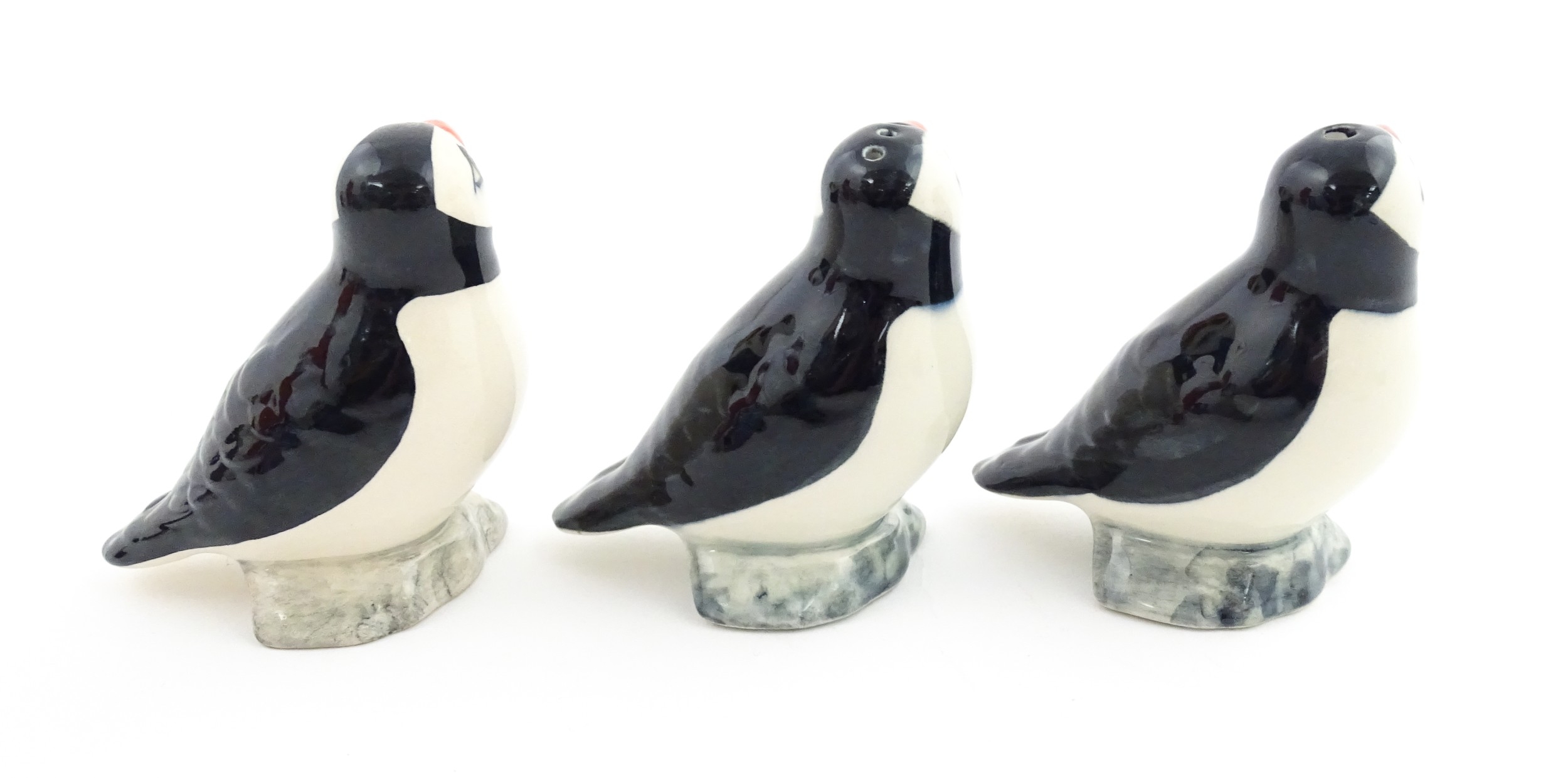 Three Babbacombe Pottery cruets modelled as Puffins. Marked under. Approx. 3 1/4" high (3)