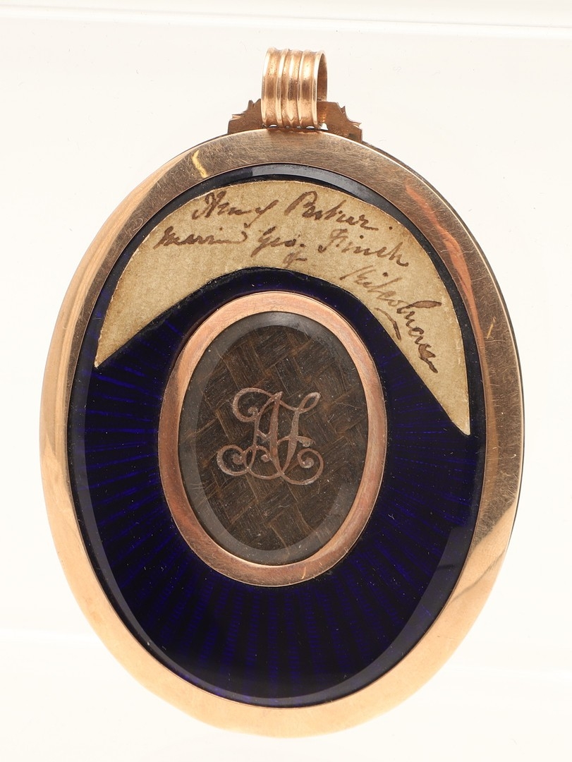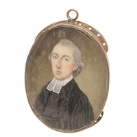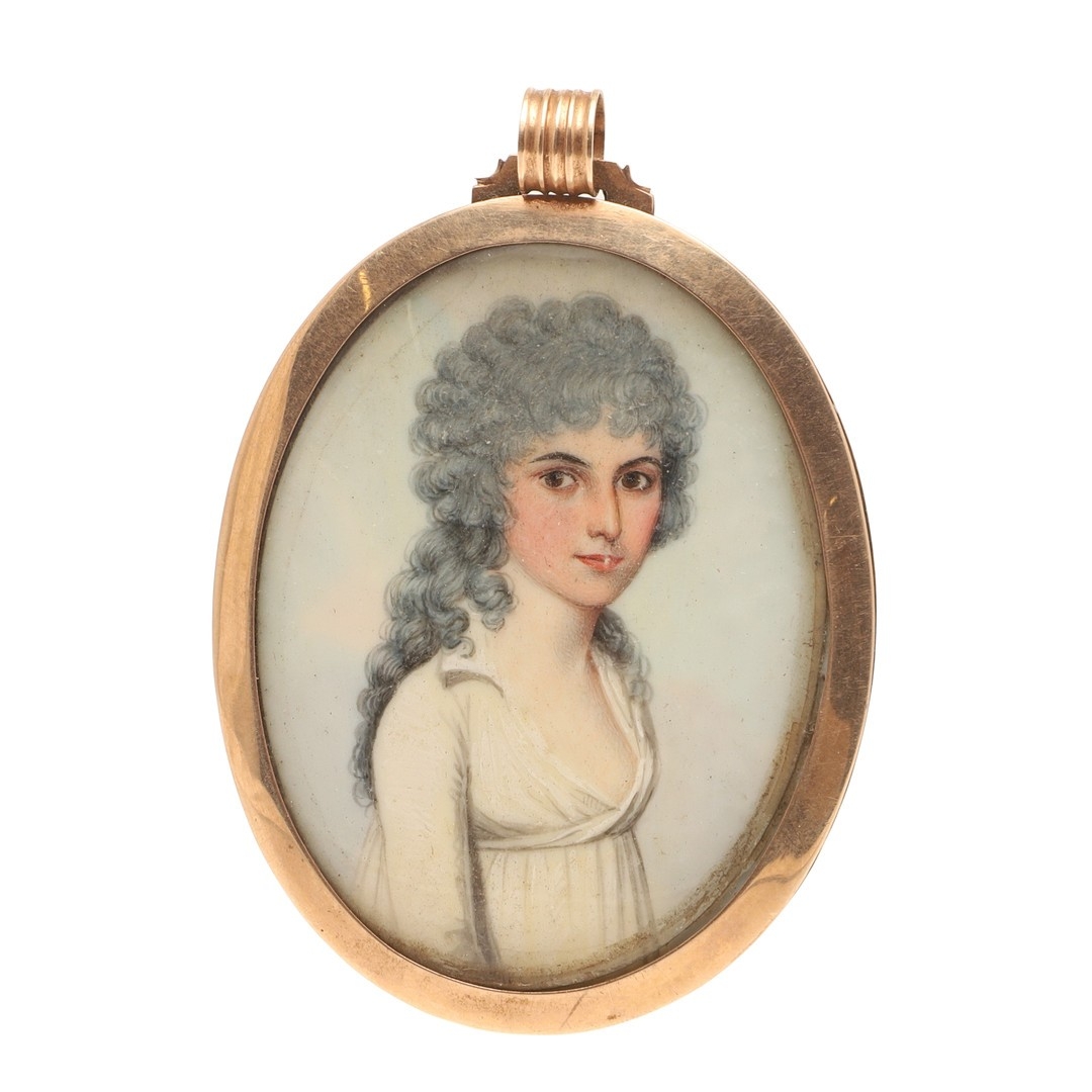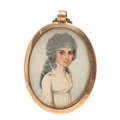 FREDERICK BUCK (IRISH 1771 - C. 1840). Miniature portrait of a young lady with grey powered hair wearing a white dress. Half length. On ivory. 6cm x 4.5cm. In gold frame, the reverse with hair work panel in blue eglomise border. Ivory Submission Reference: RW28QAYW.