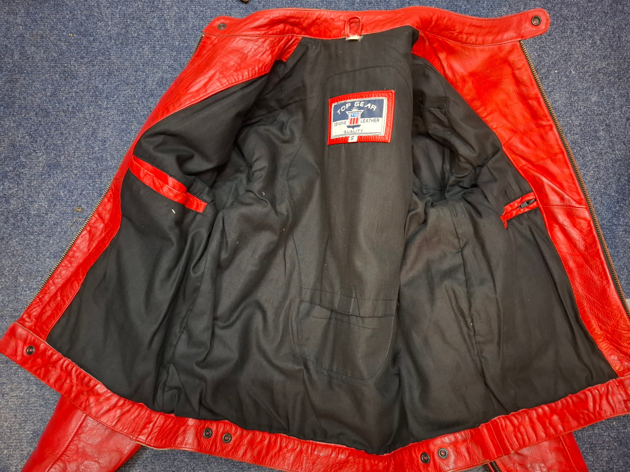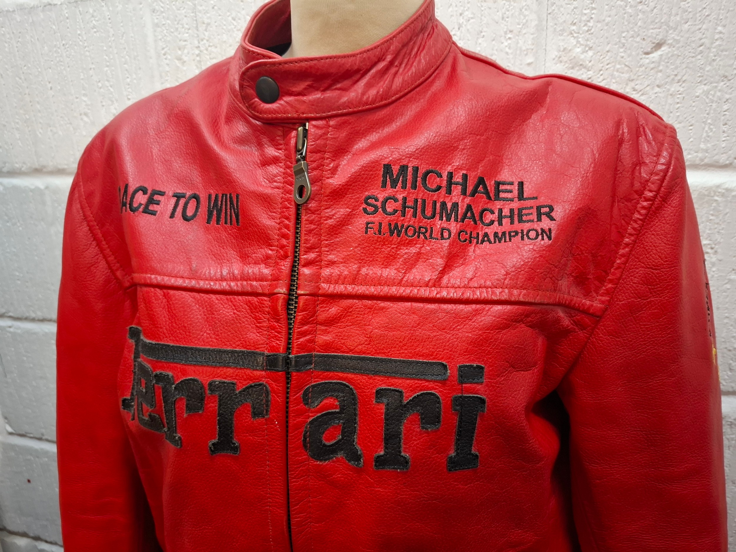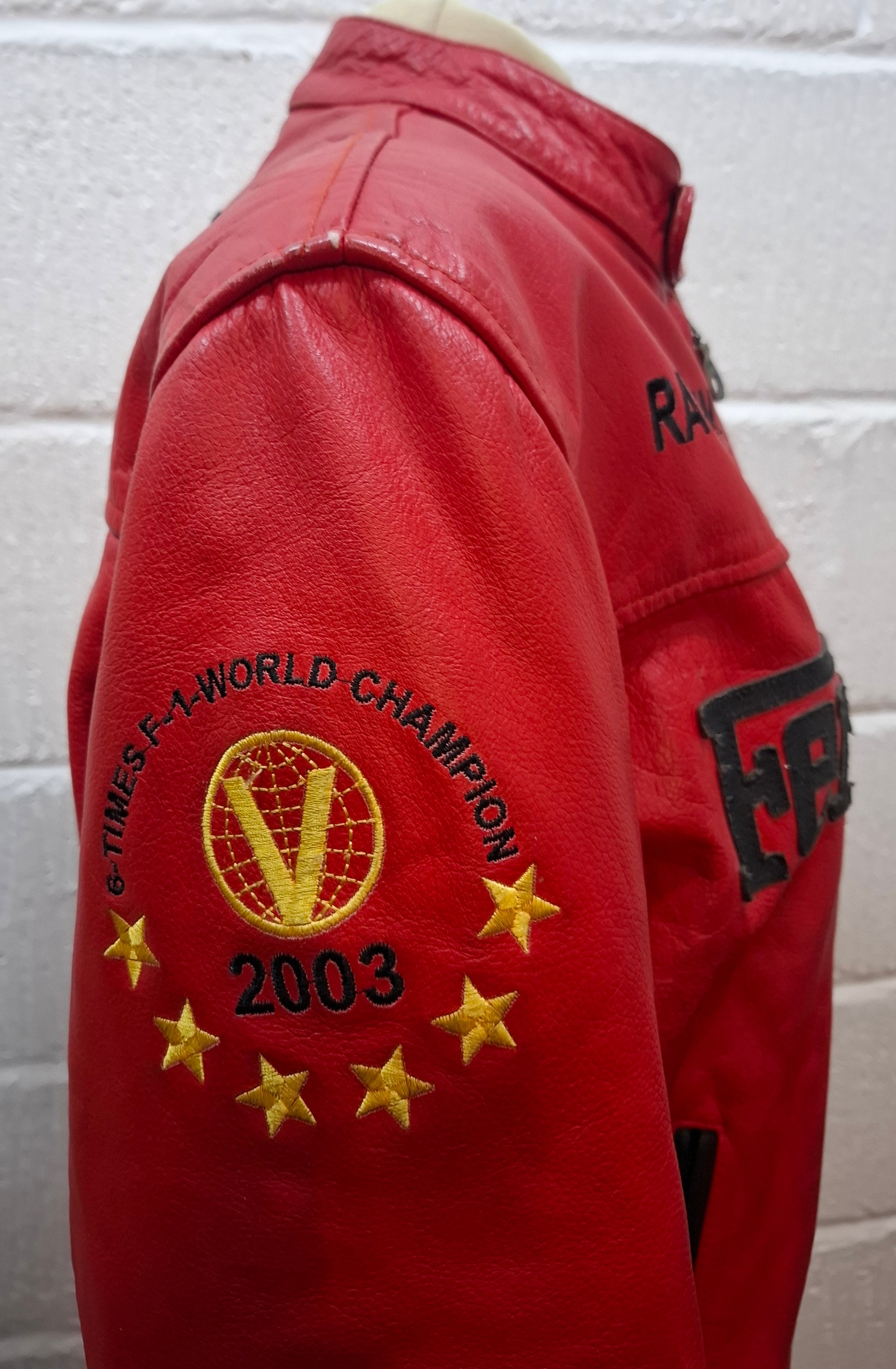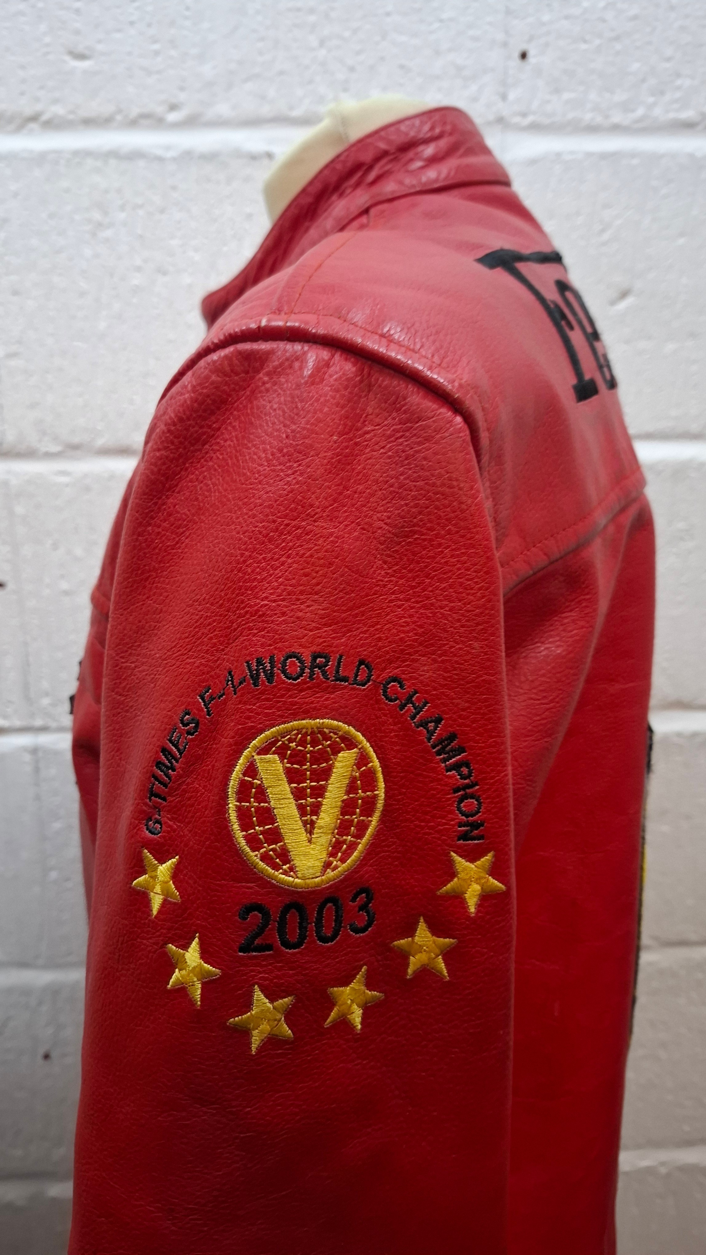 A Top Gear red leather Ferrari racing jacket having Michael Schumacher F1 World Champion in writing to the left collar and Race to Win to the right collar, 2 front black zips, 2 internal pockets, embroidery to the top of the sleeves and the date 2003 and Ferrari logo to the back, size small, approx 36/38" chest