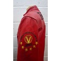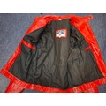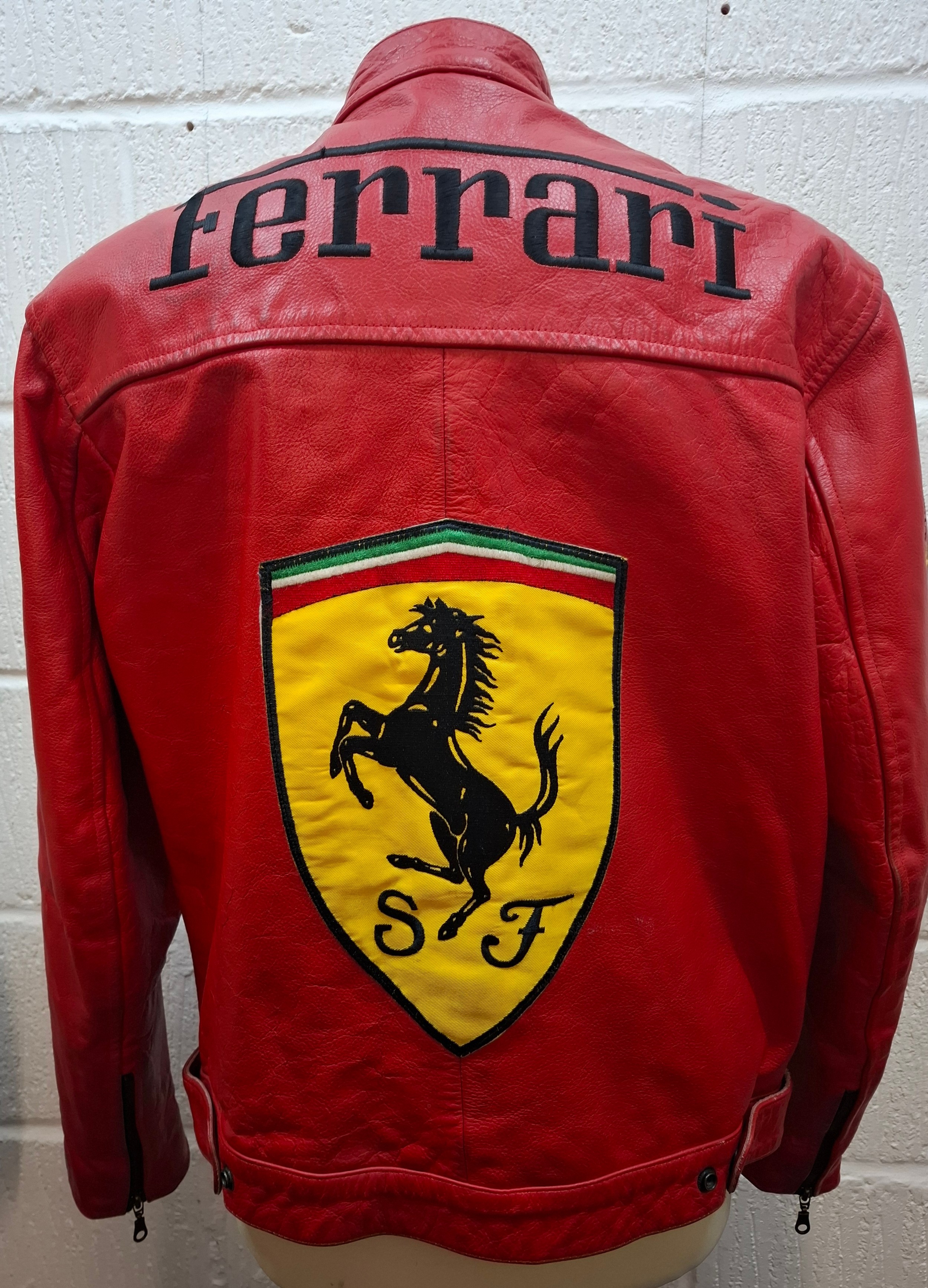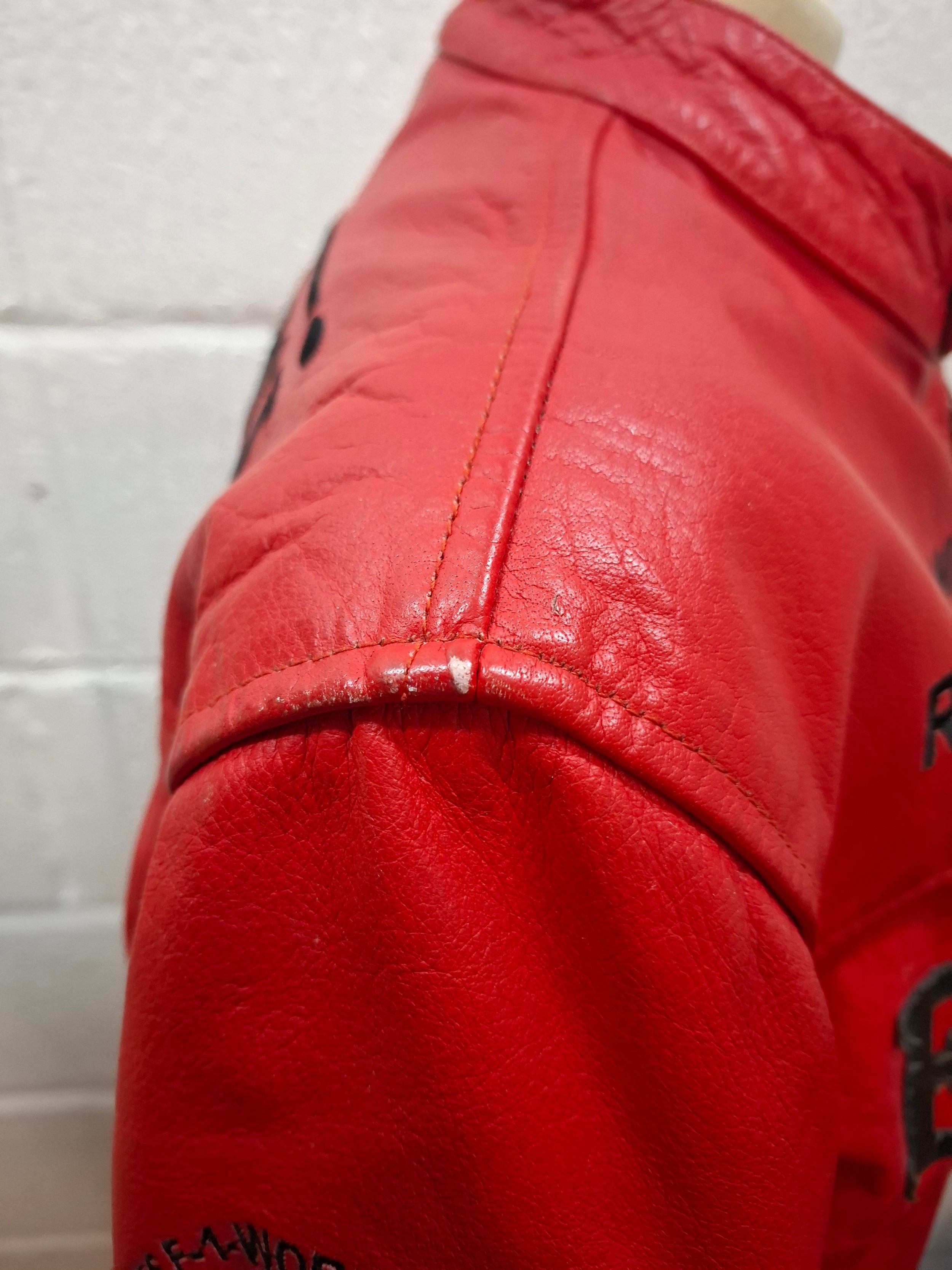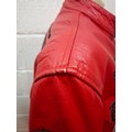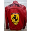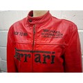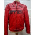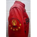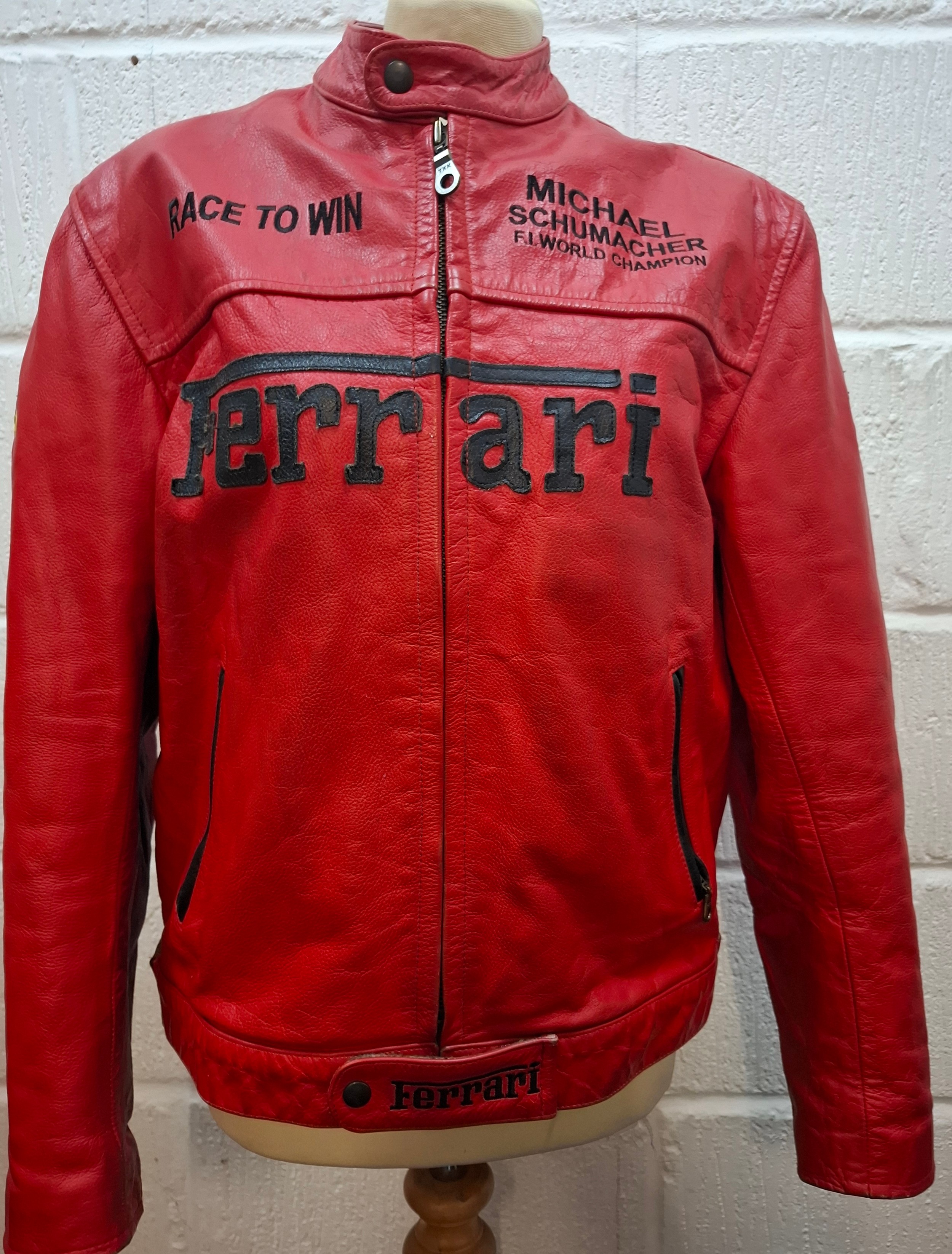 A Top Gear red leather Ferrari racing jacket having Michael Schumacher F1 World Champion in writing to the left collar and Race to Win to the right collar, 2 front black zips, 2 internal pockets, embroidery to the top of the sleeves and the date 2003 and Ferrari logo to the back, size small, approx 36/38" chest