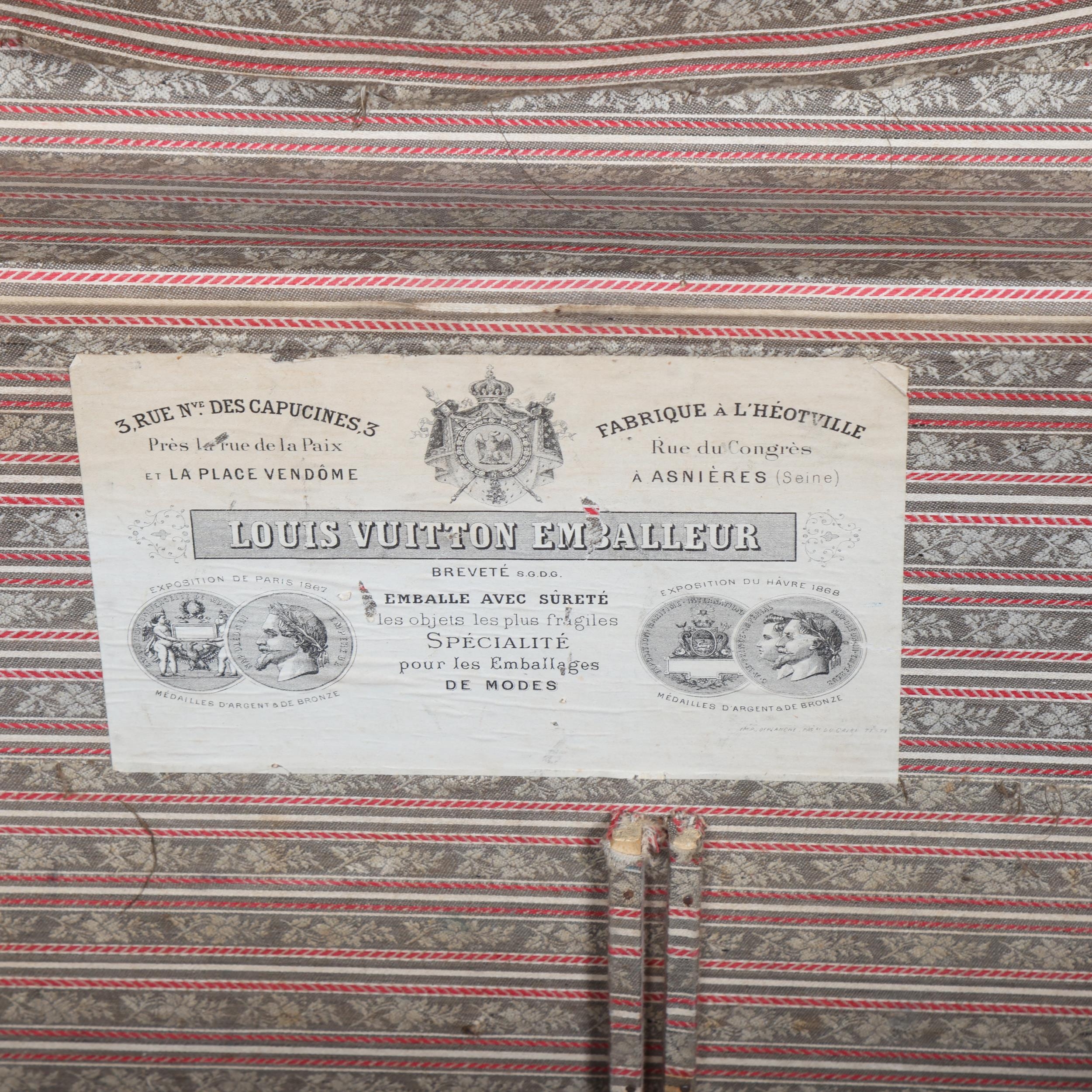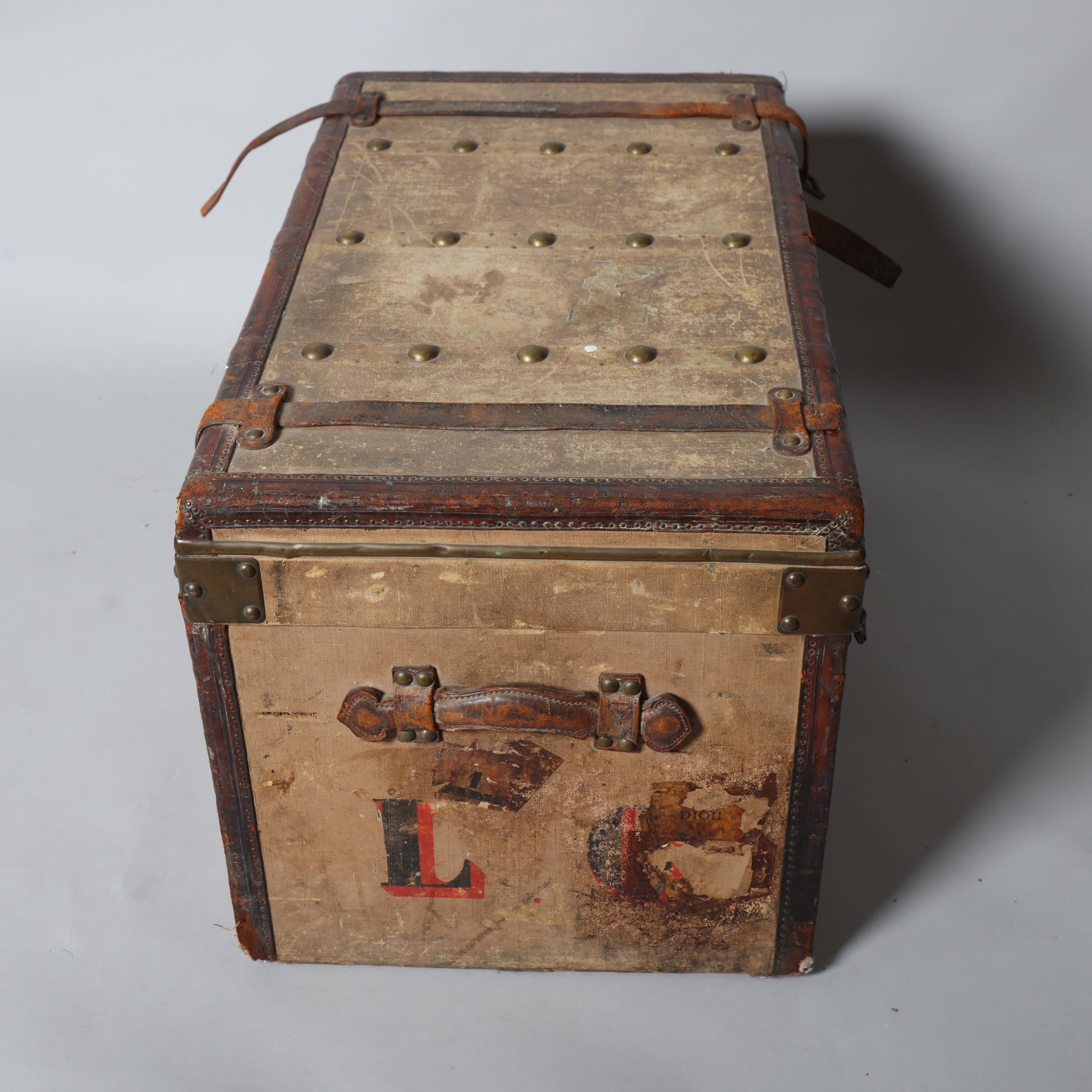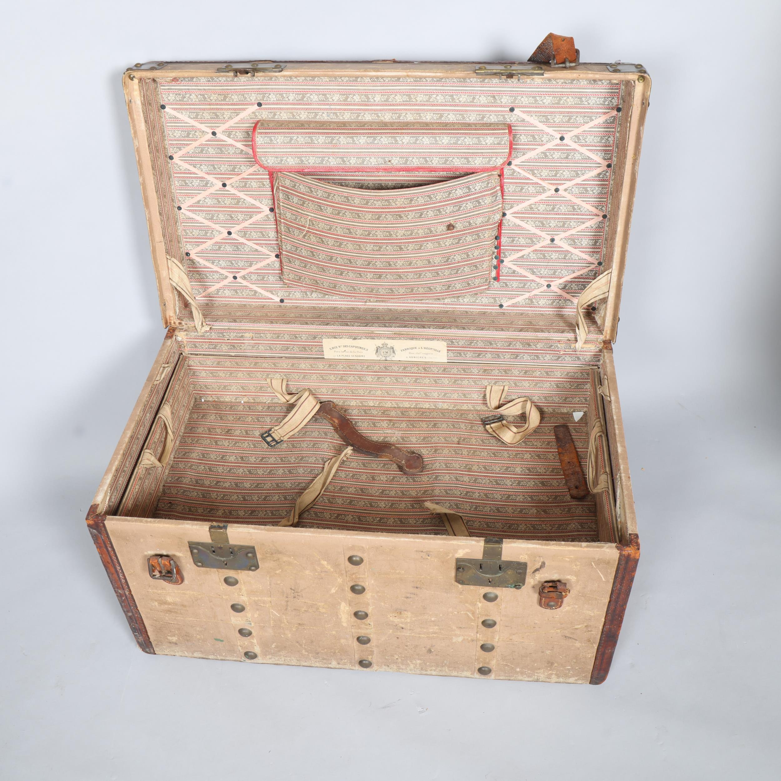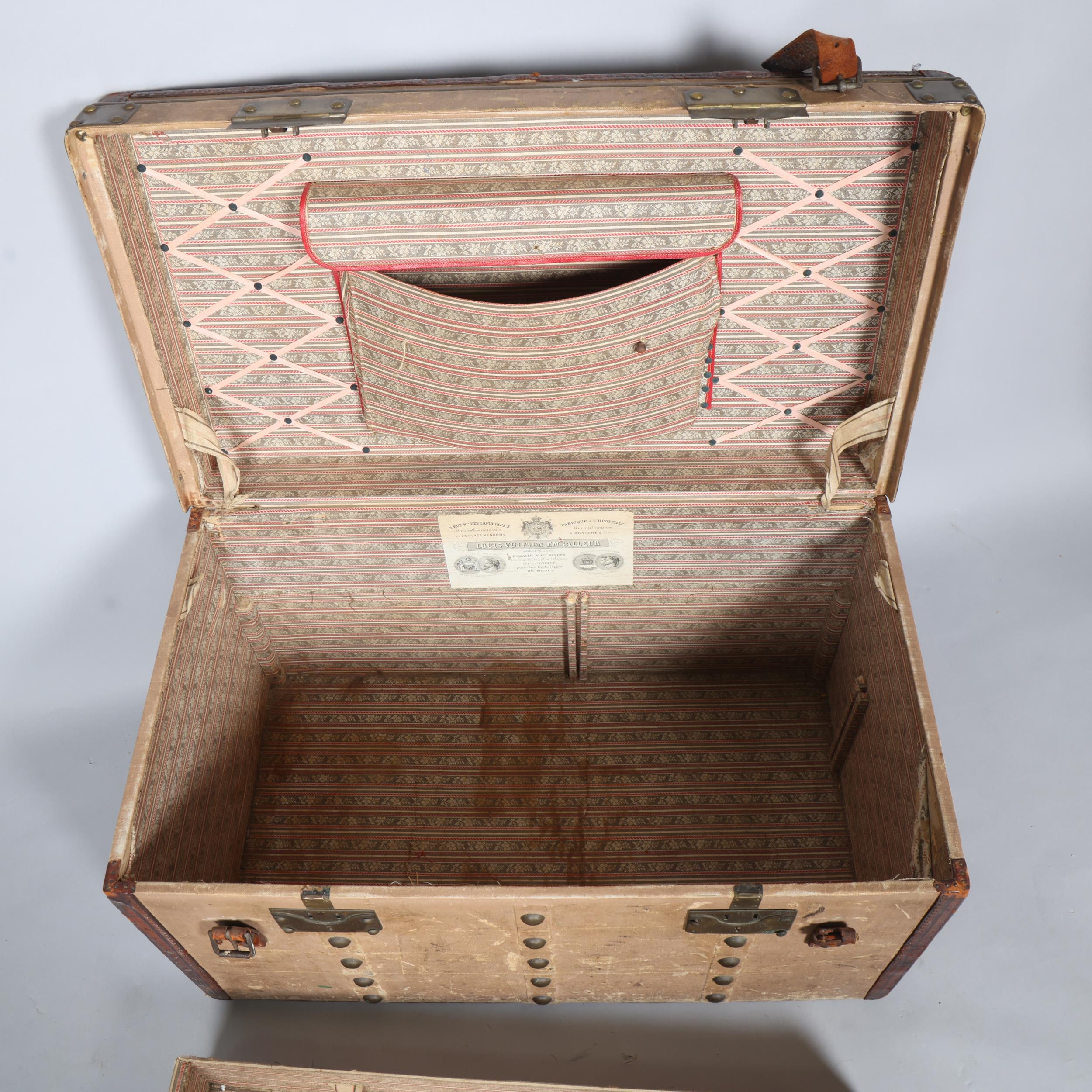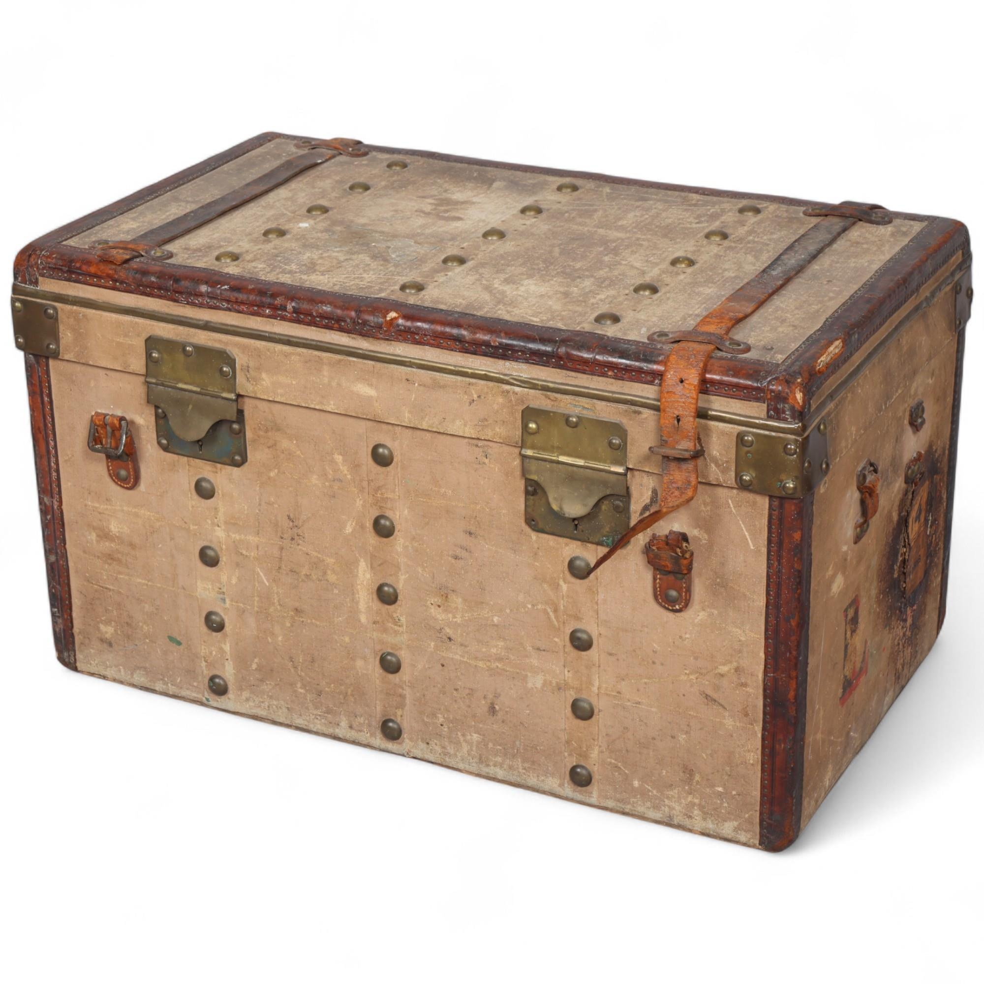 LOUIS VUITTON - a Vintage leather-bound Gris Trianon coated canvas steamer trunk, brass furniture with original Louis Vuitton Emballeur label inside and removeable tray, 75cm x 43cm, height 43cm