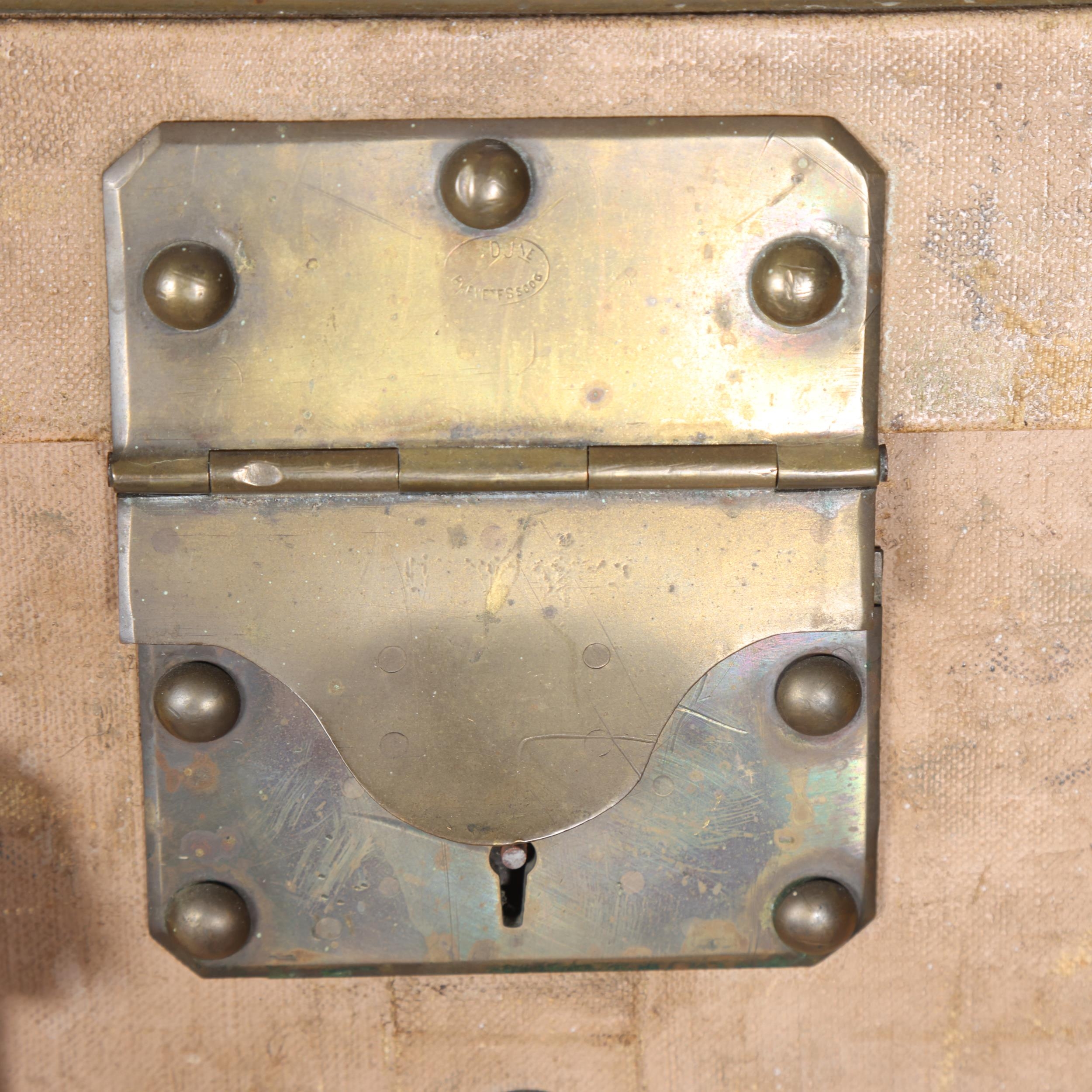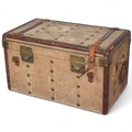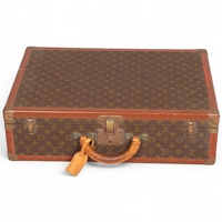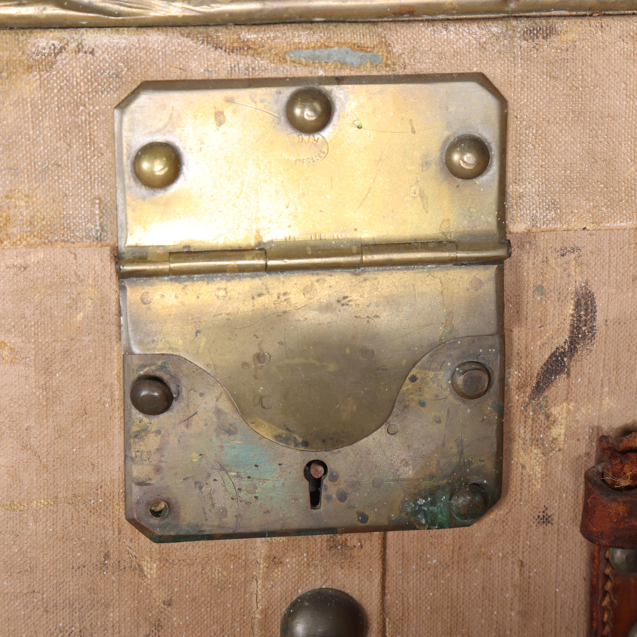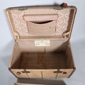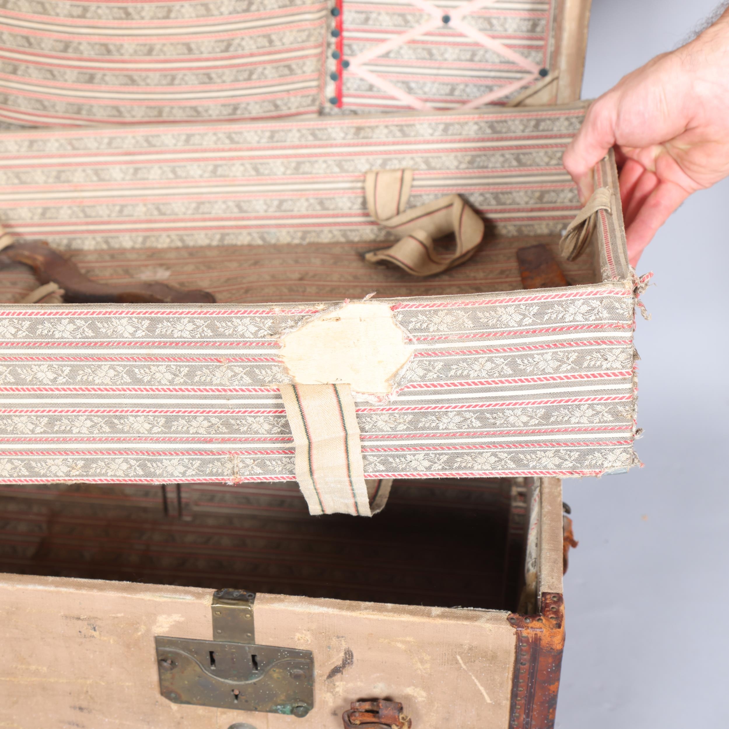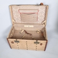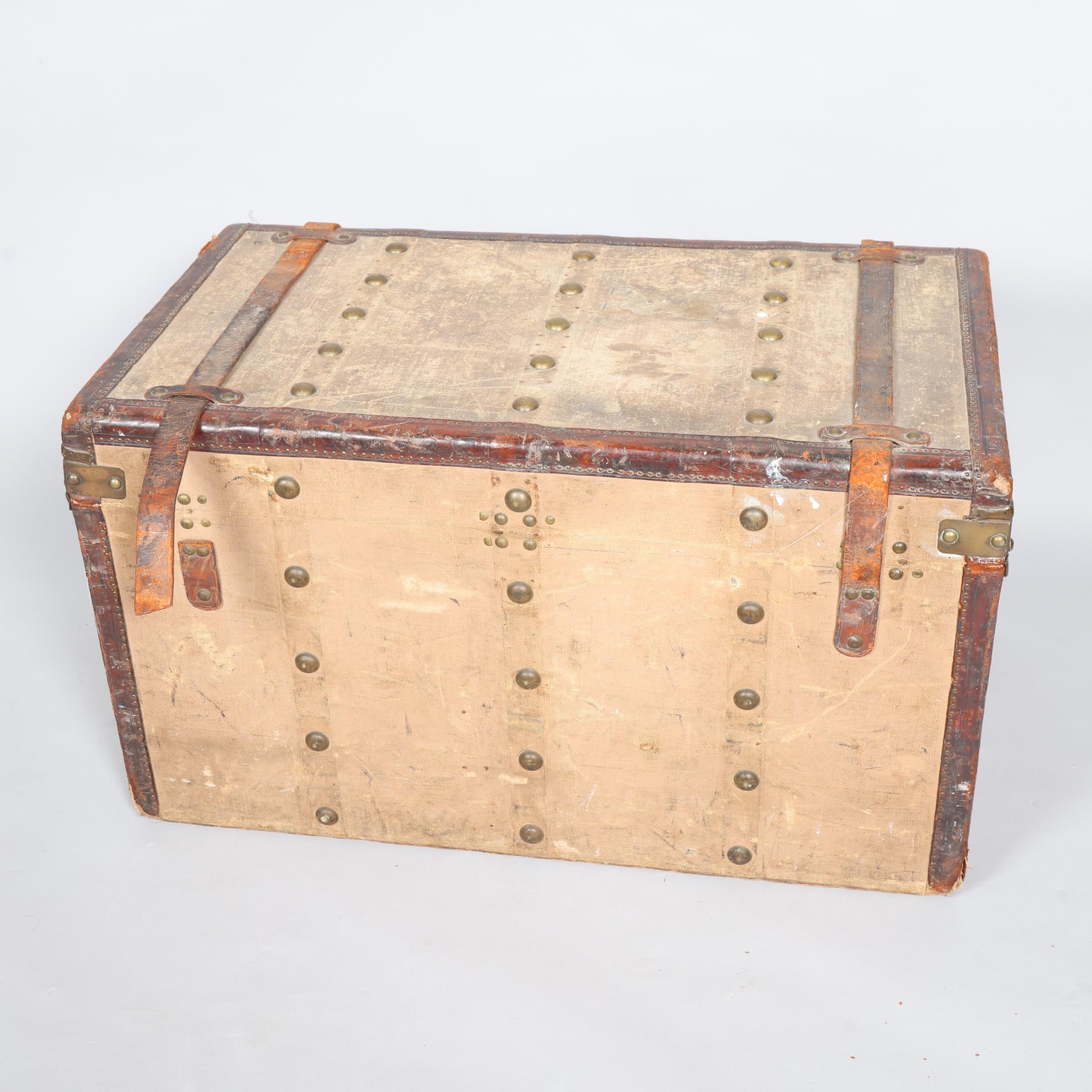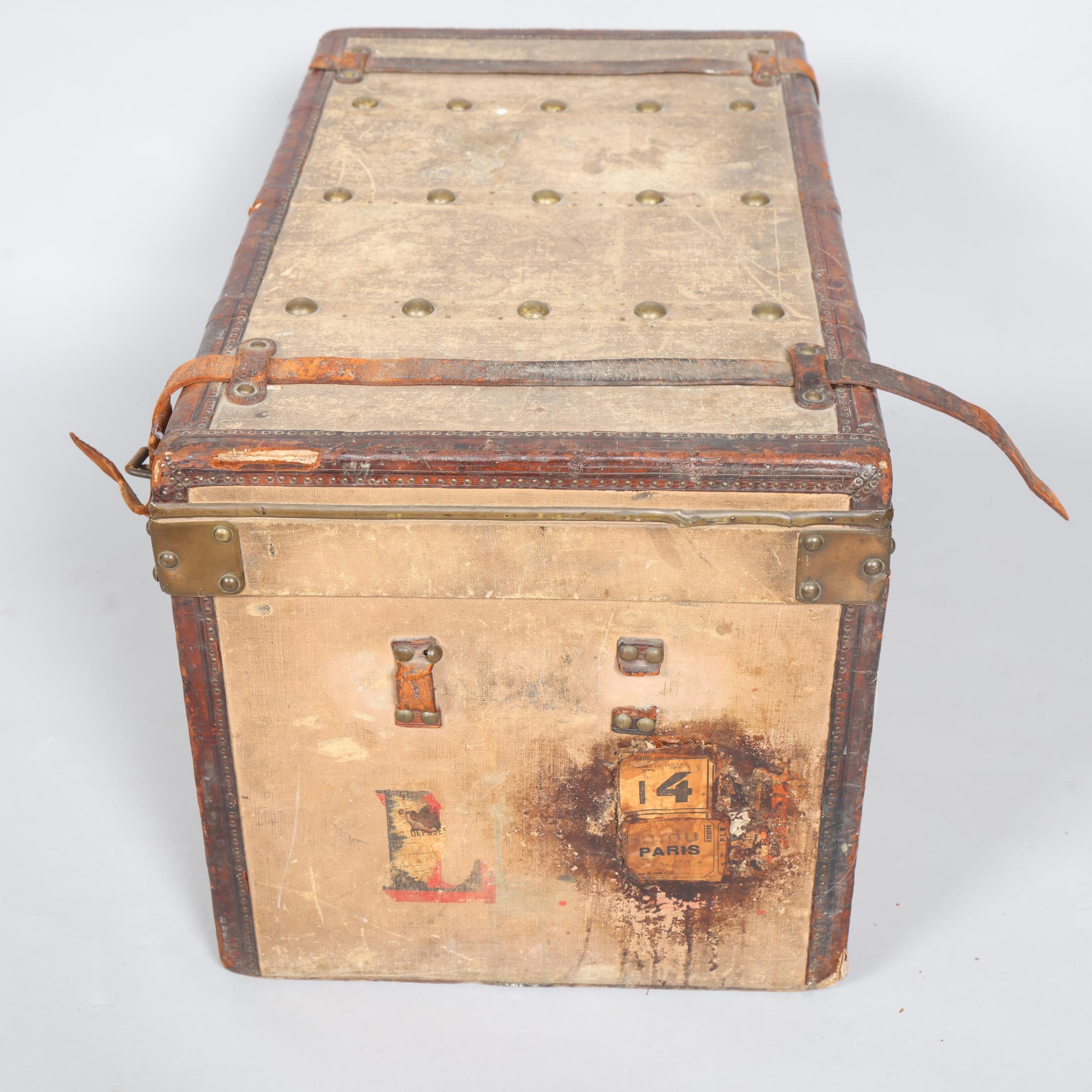 LOUIS VUITTON - a Vintage leather-bound Gris Trianon coated canvas steamer trunk, brass furniture with original Louis Vuitton Emballeur label inside and removeable tray, 75cm x 43cm, height 43cm