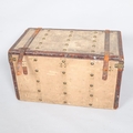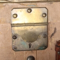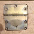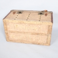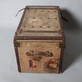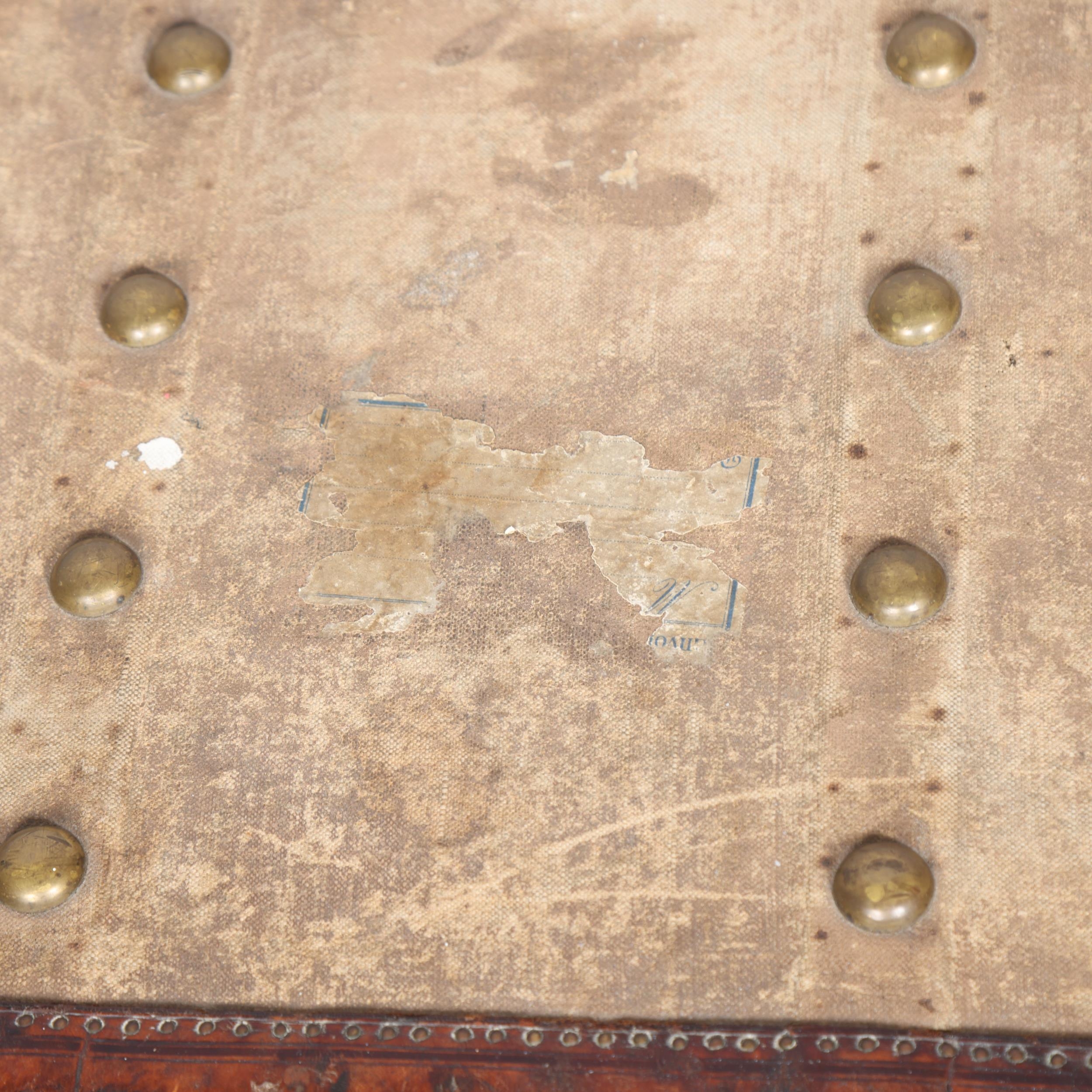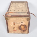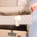 1 leather handle is detached but present, both leather straps on the lid are broken, general wear on the leather edges, remnants of old labels