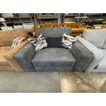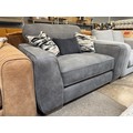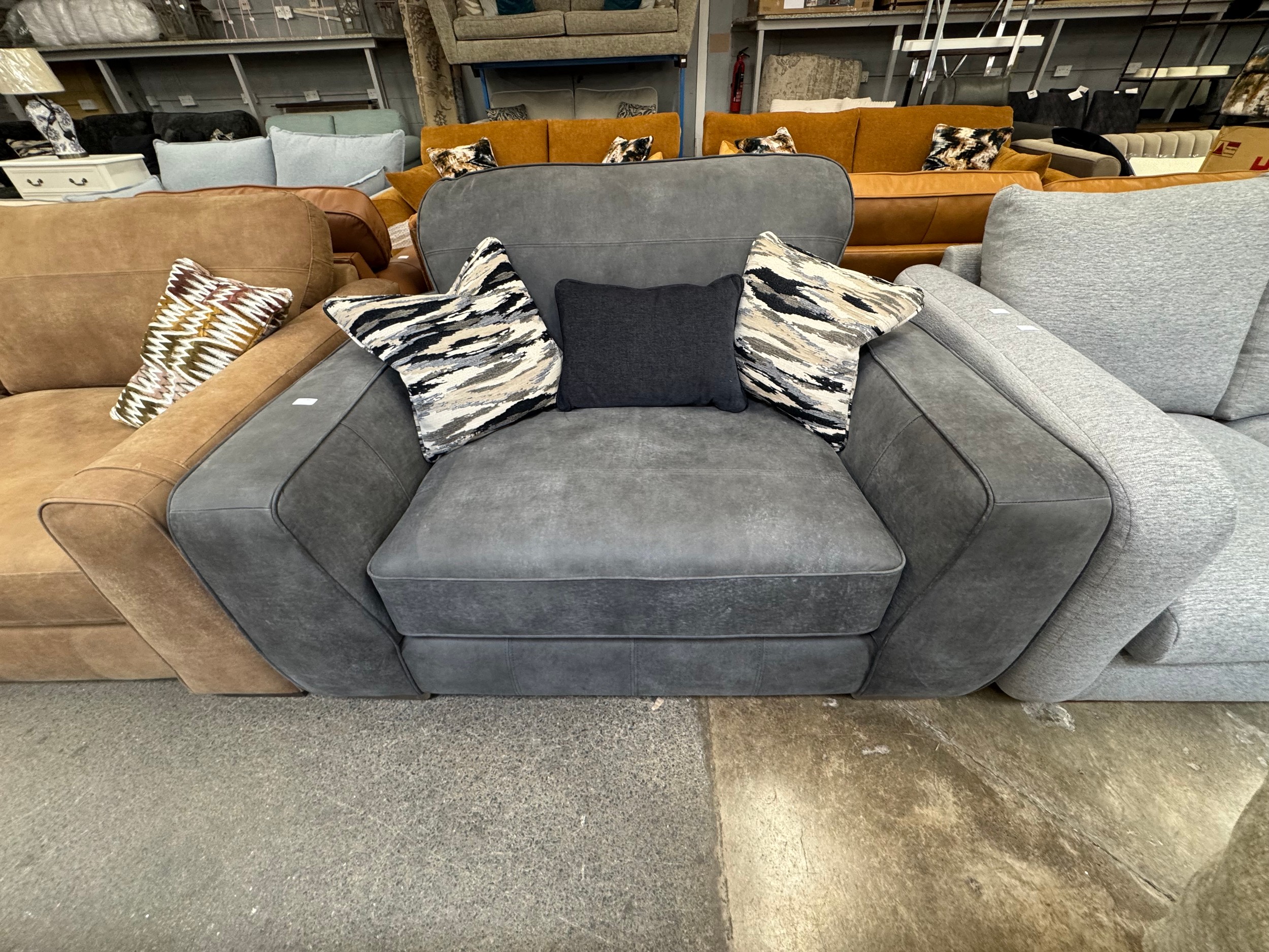 A slate grey leather love seat