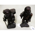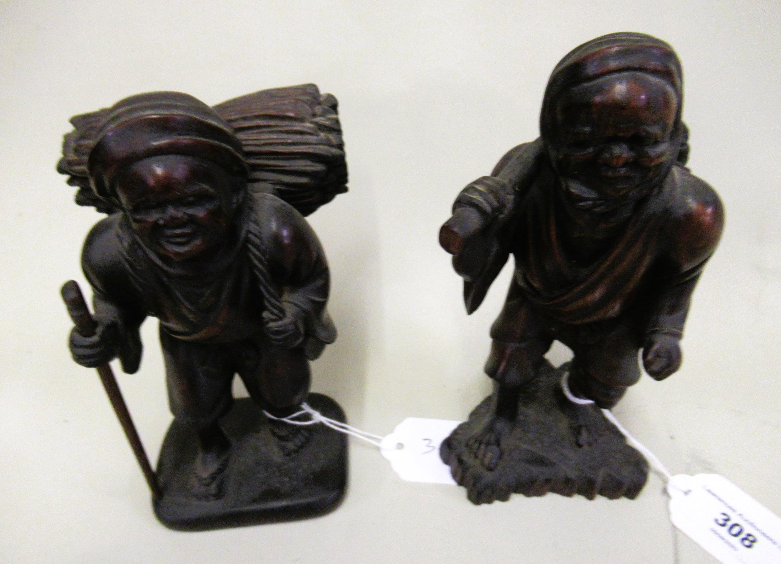 Pair of South East Asian carved wooden figures of agricultural workers, having character marks to base, 17cm high approximately each