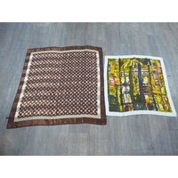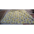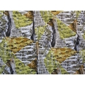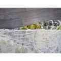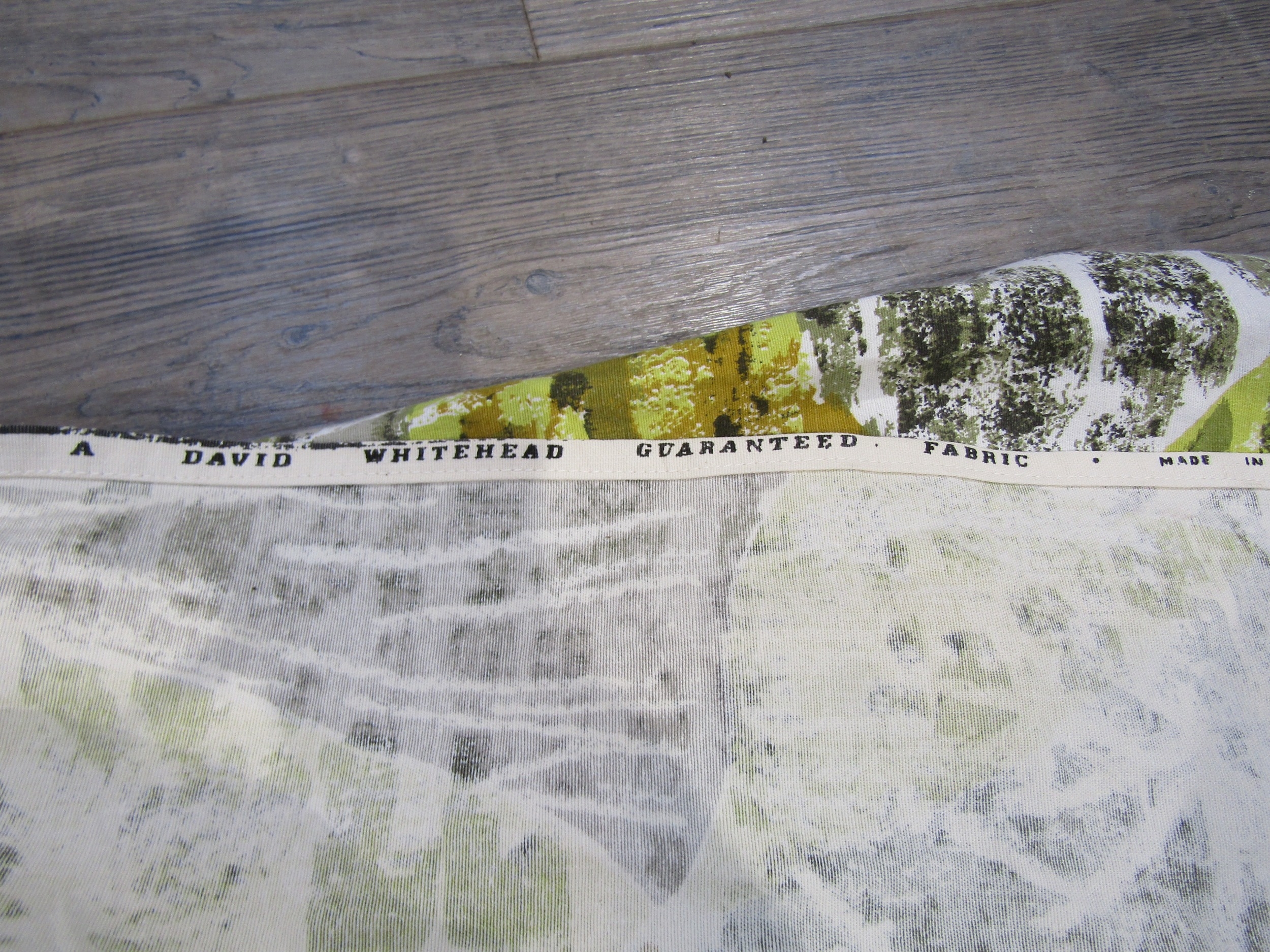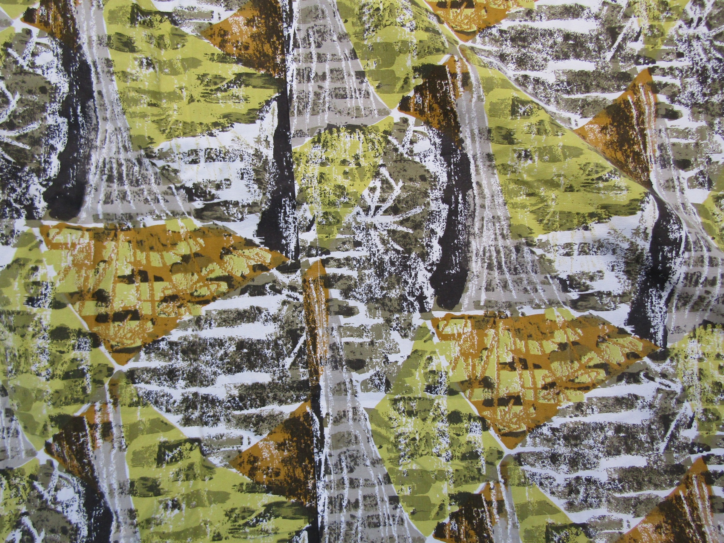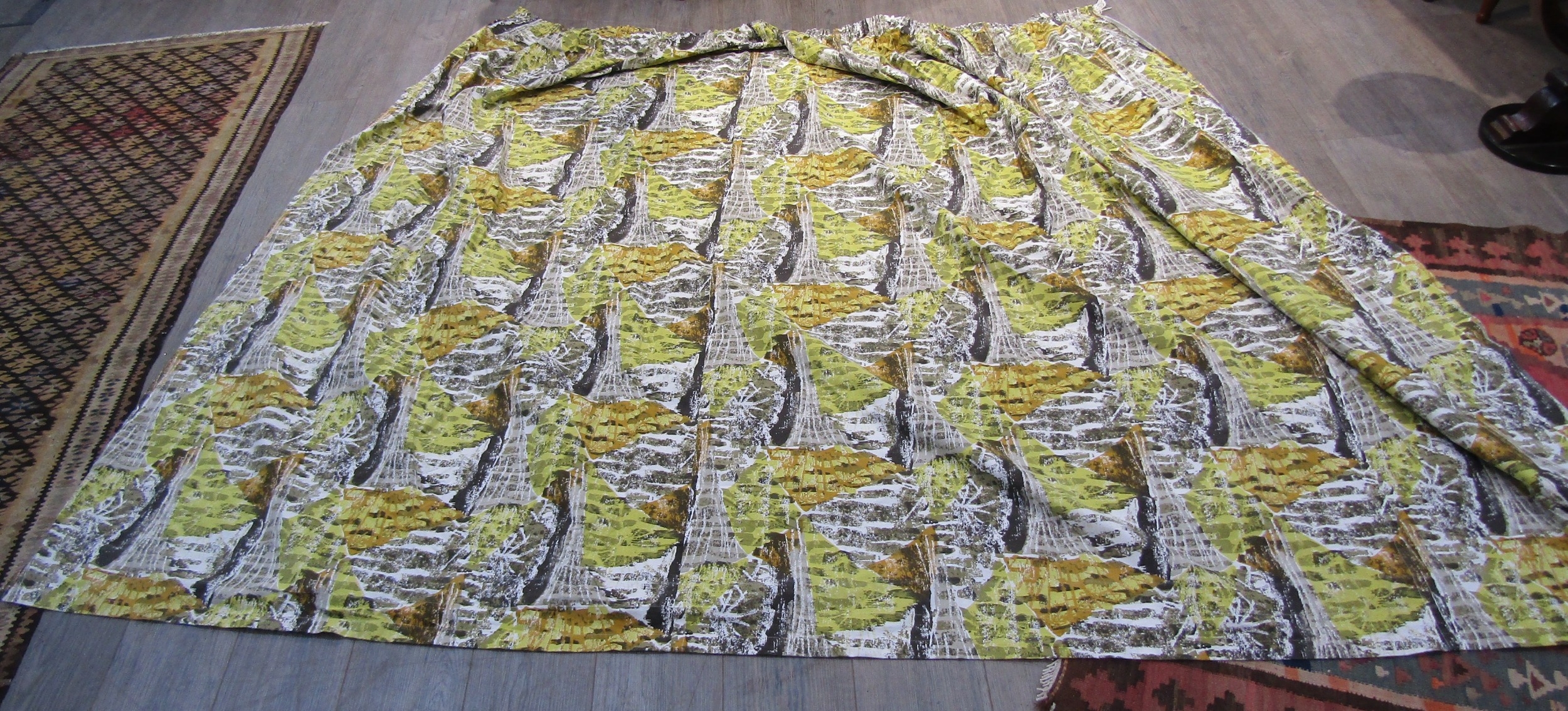 A David Whitehead fabric curtain panel with abstract design in white, ochre, black and green colours. Approx 187cm drop x 270cm wide