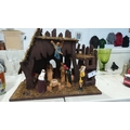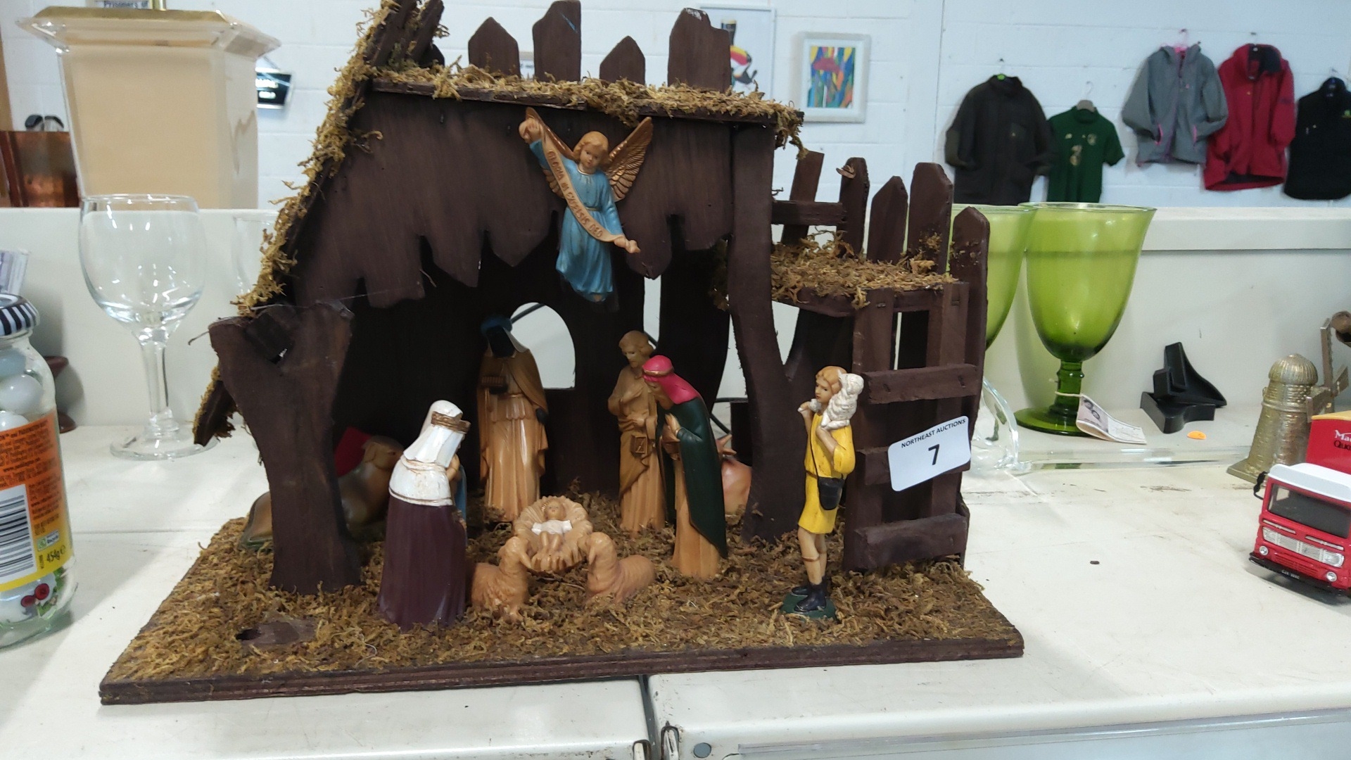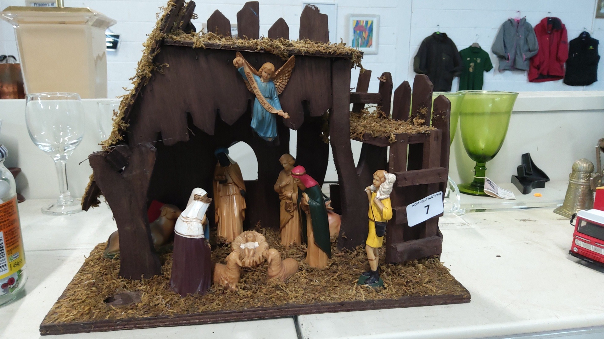 Nativity crèche with wooden stable, moss roof and painted resin figures of Holy Family, Magi, shepherd, angel and animals.
