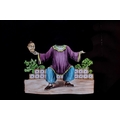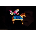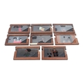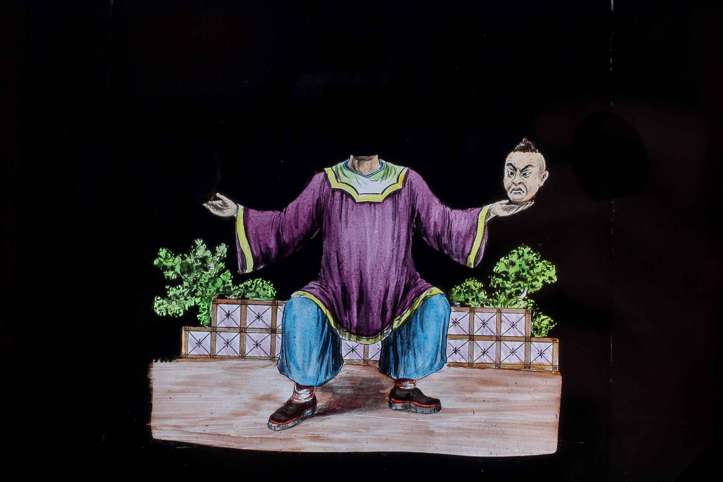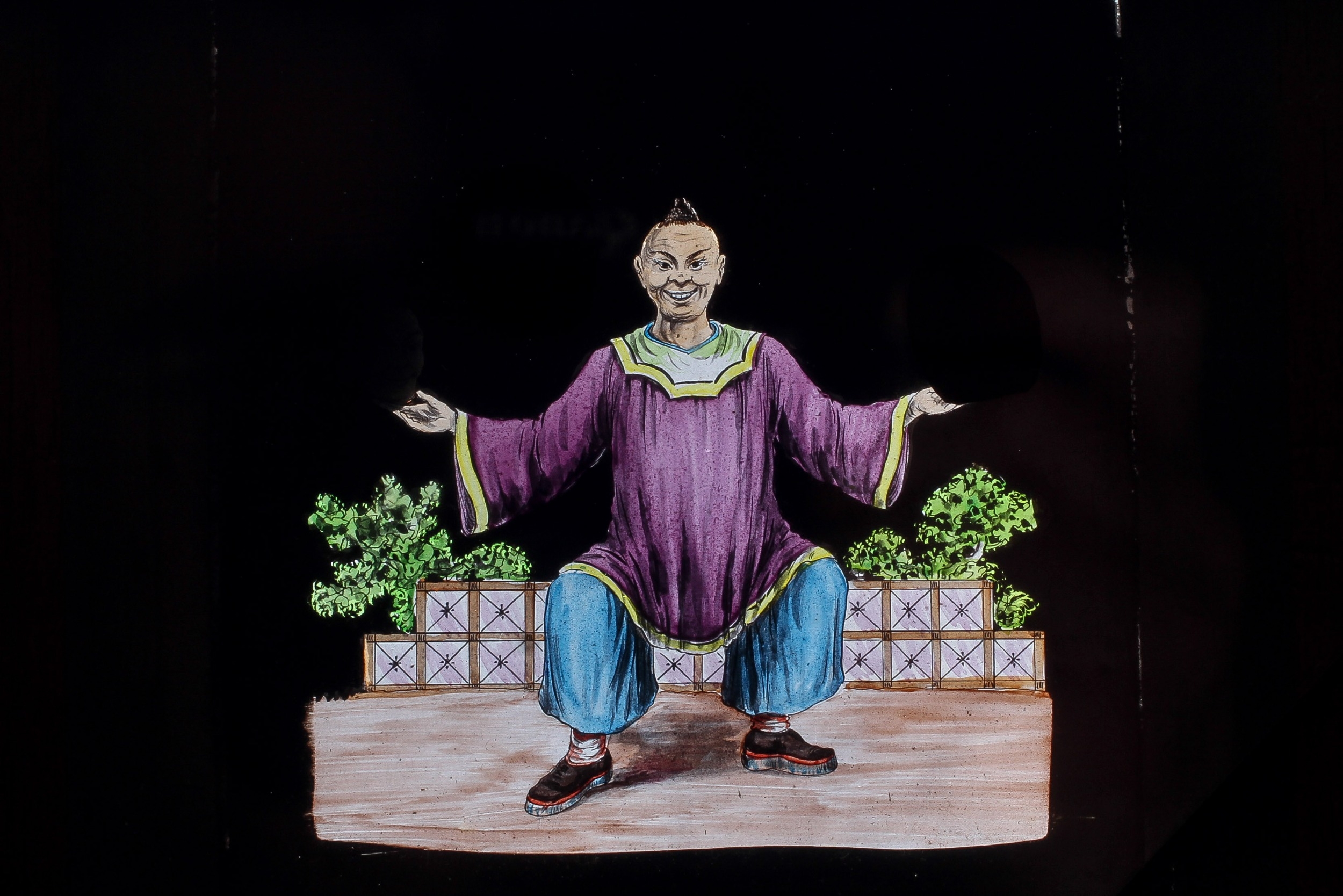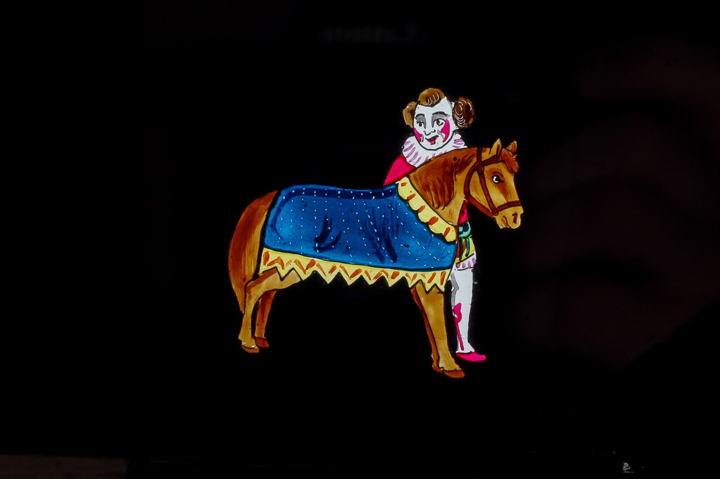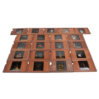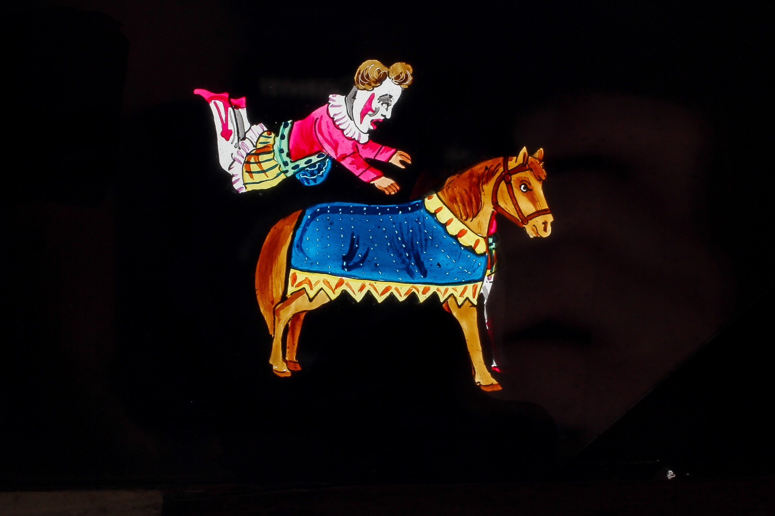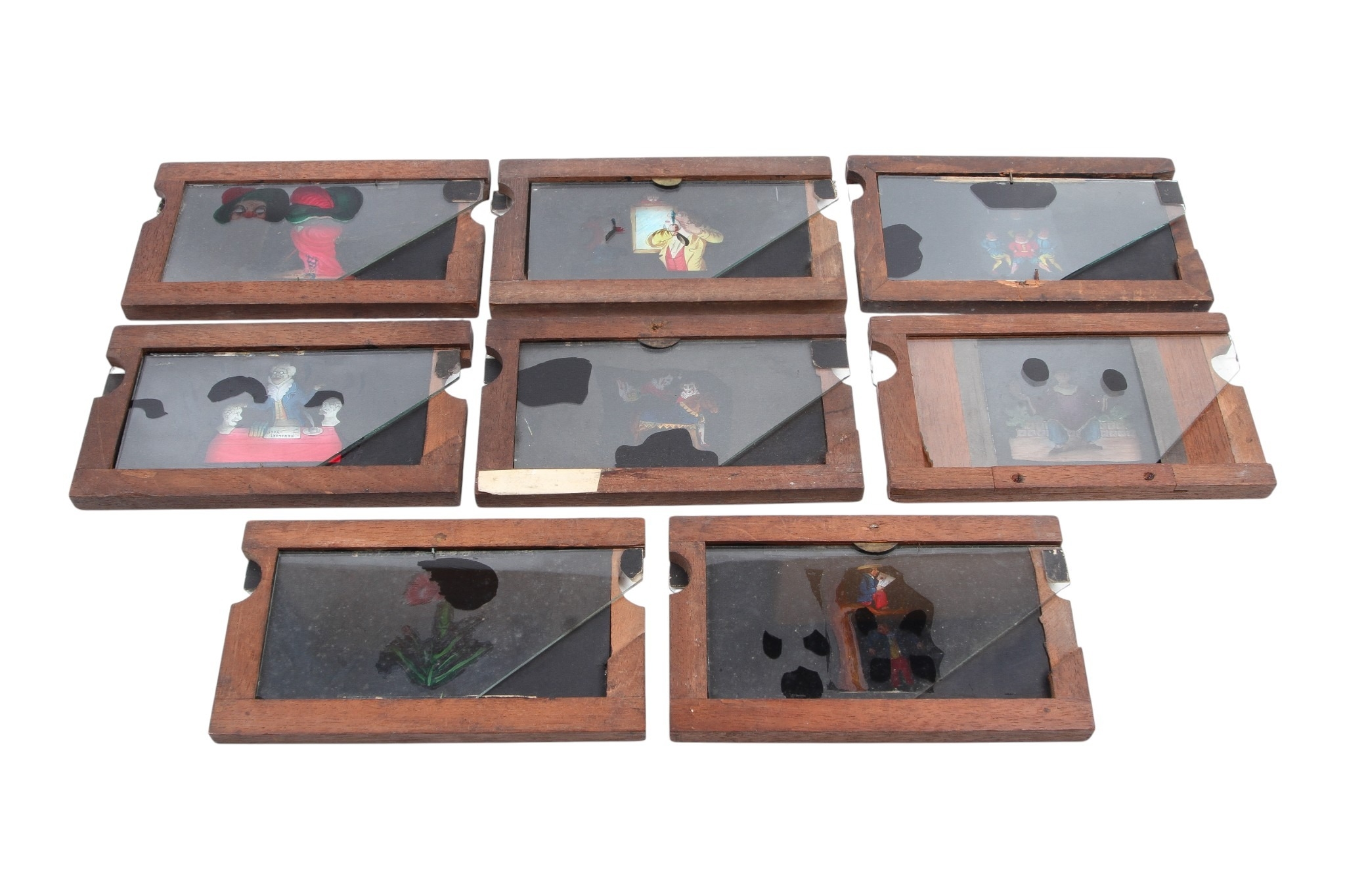 Eight wood-framed hand-coloured double-slipper animated moving Magic Lantern Slides. Two stamped 'Newton', others unbranded. Examples include a man shaving in a mirror held by a monkey before the monkey starts shaving too, a man falling from a tree banch and becoming caught swinging by his jacket, a man jumping on a horse before falling off, and more.