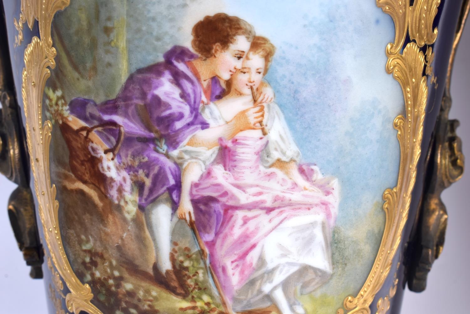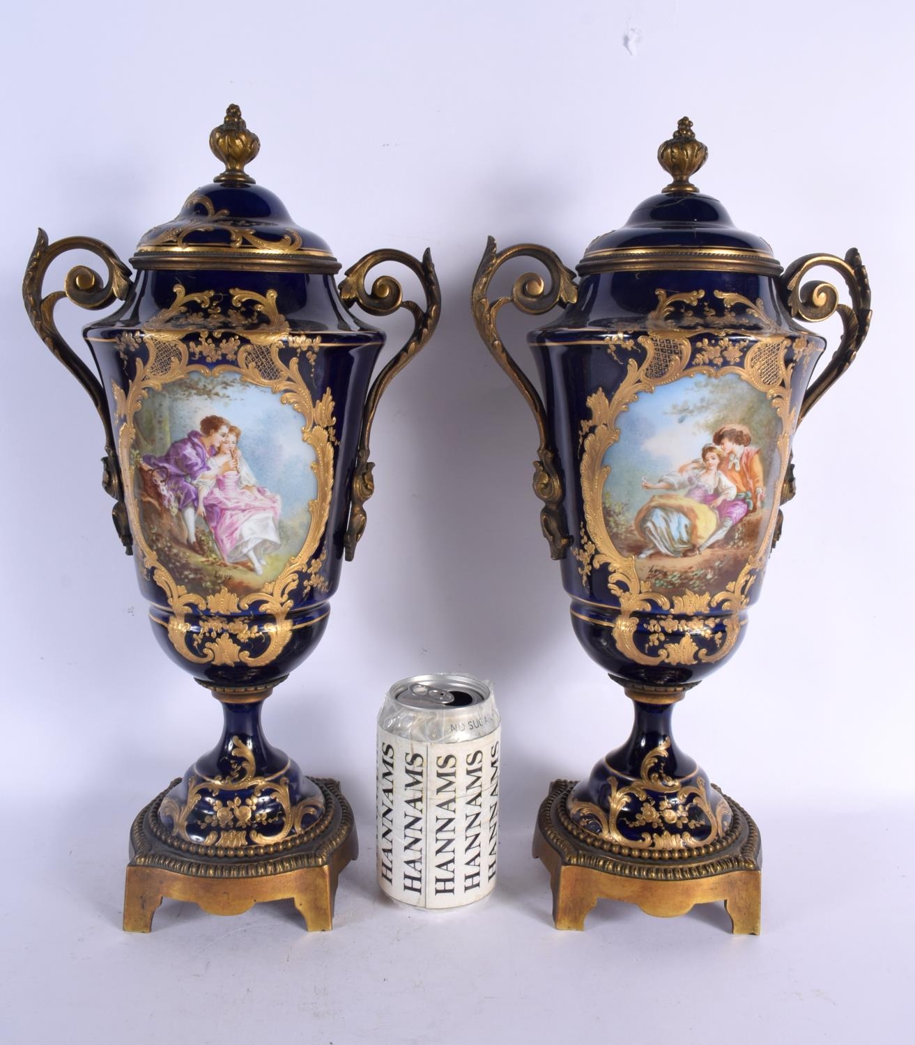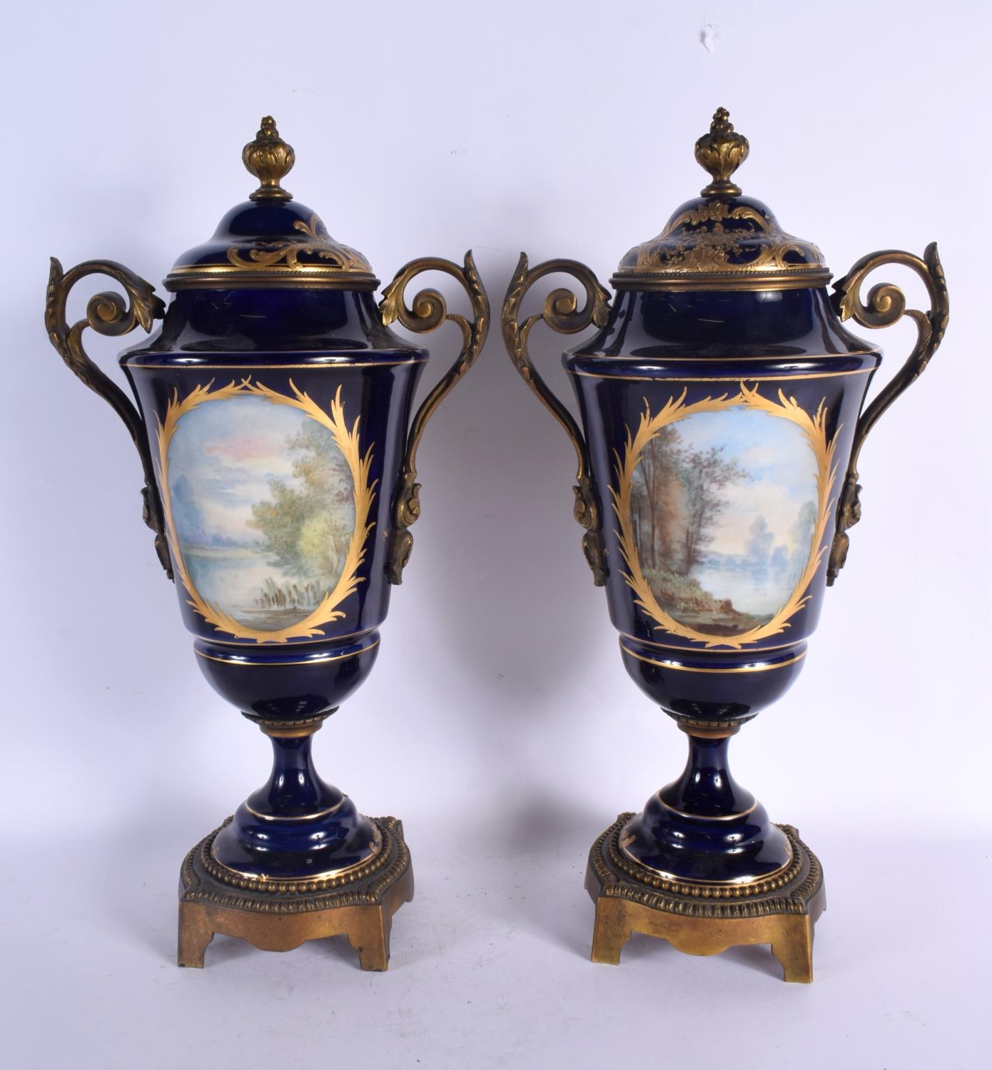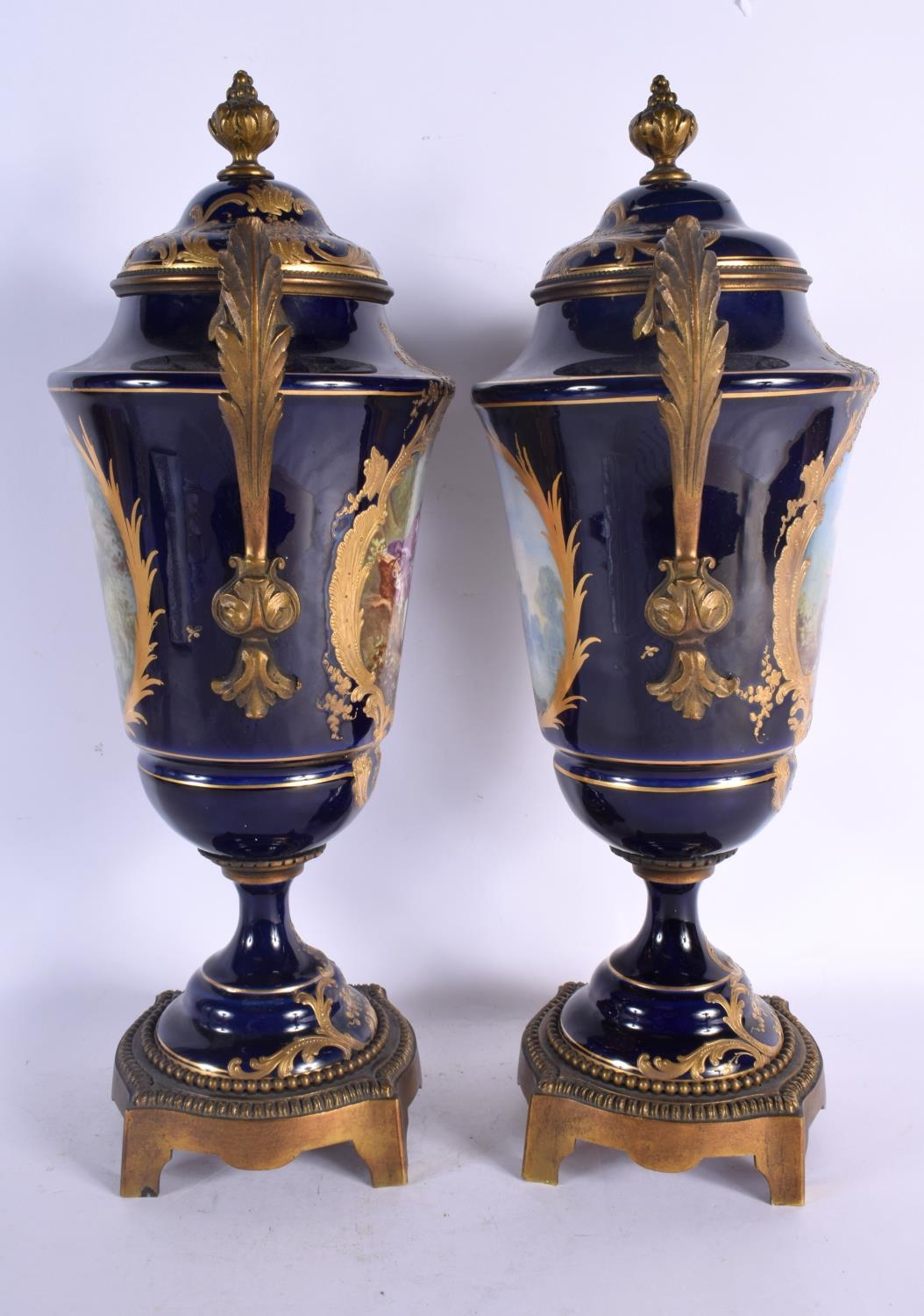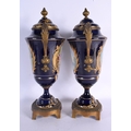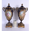 A LARGE PAIR OF 19TH CENTURY FRENCH SEVRES PORCELAIN VASES AND COVERS painted with figures in landscapes. 42 cm x 18 cm.