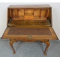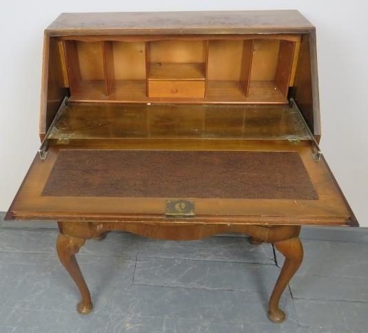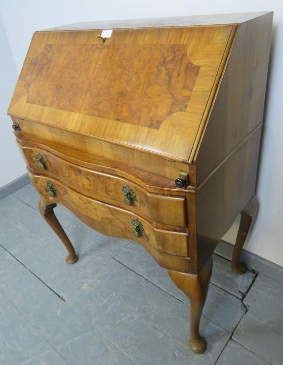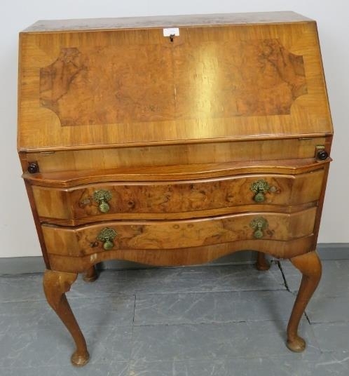 A 1920s burr walnut serpentine fronted bureau, with fitted interior, over two long drawers, on cabriole supports. With trade label ‘Grange Furniture of Middlesex’.