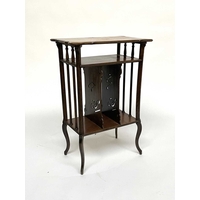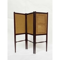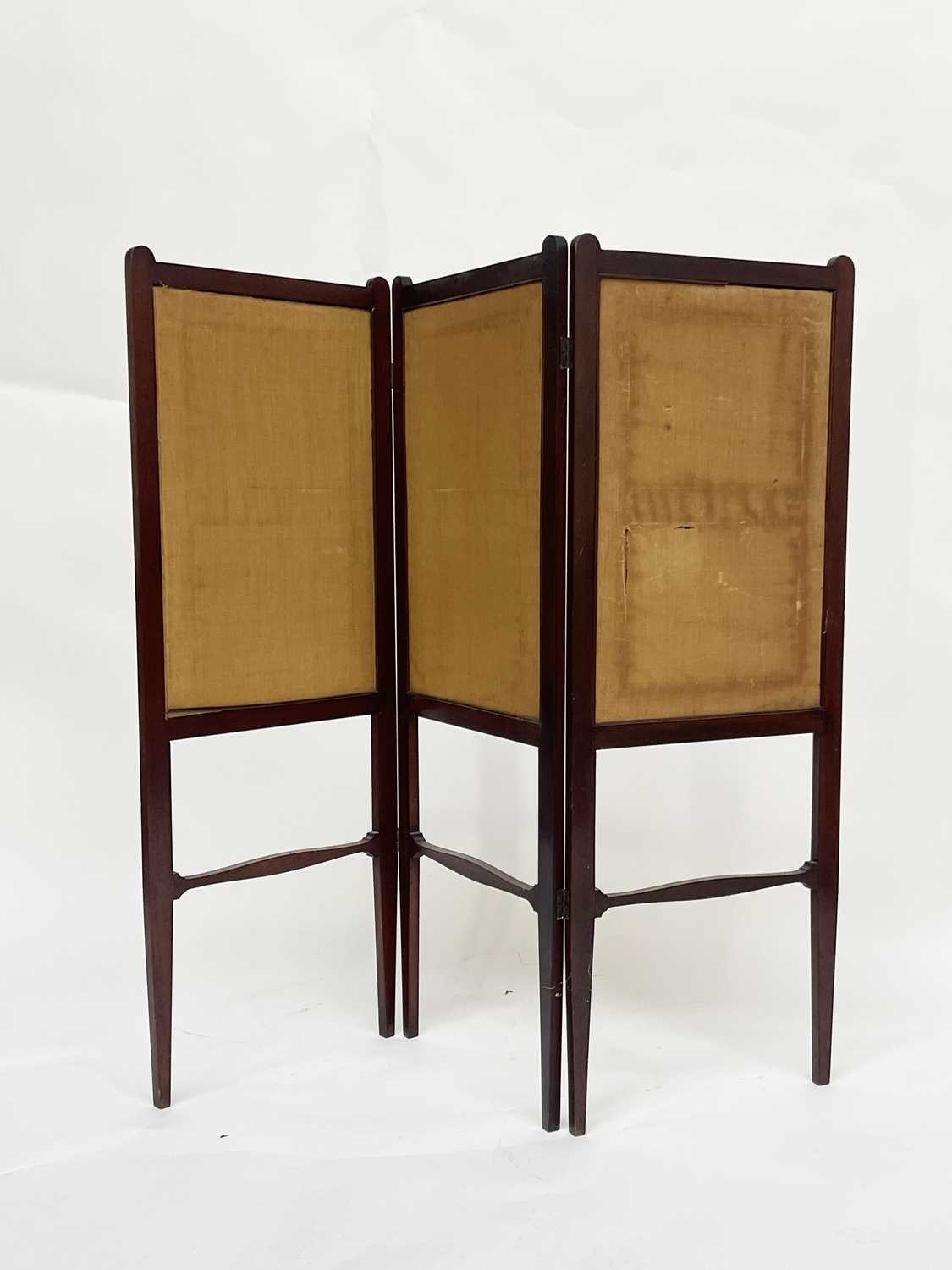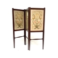 An Arts and Crafts walnut embroidered three fold screen, probably Morris and Co., in the style of George Walton, the foliate panels within frames on tapered legs united by shaped stretchers, 116cm high, 129cm wide