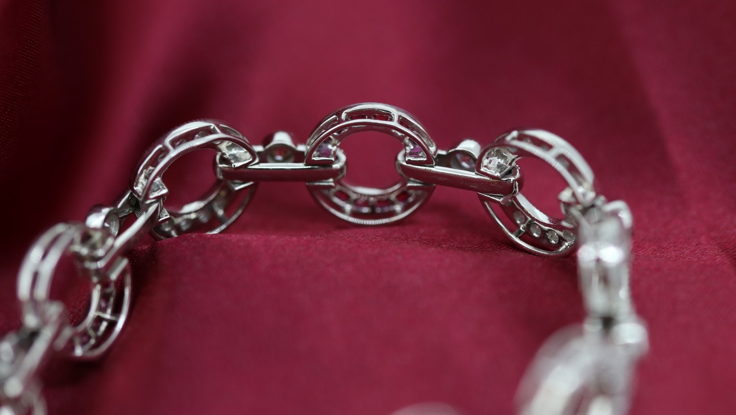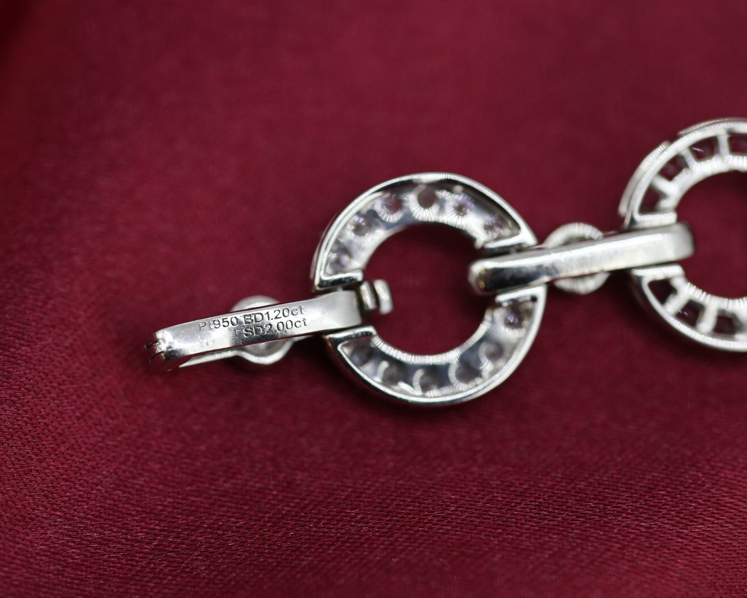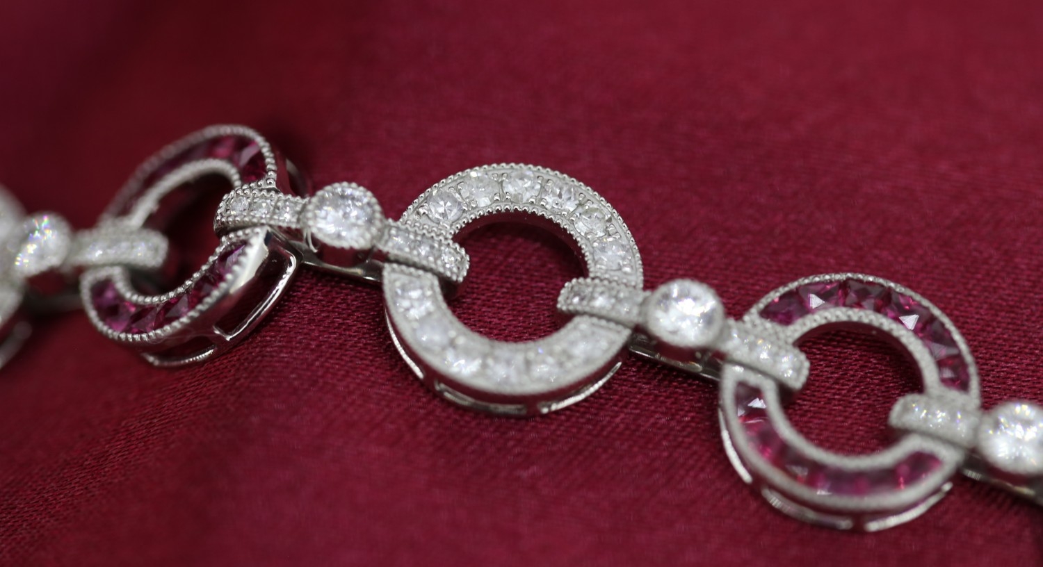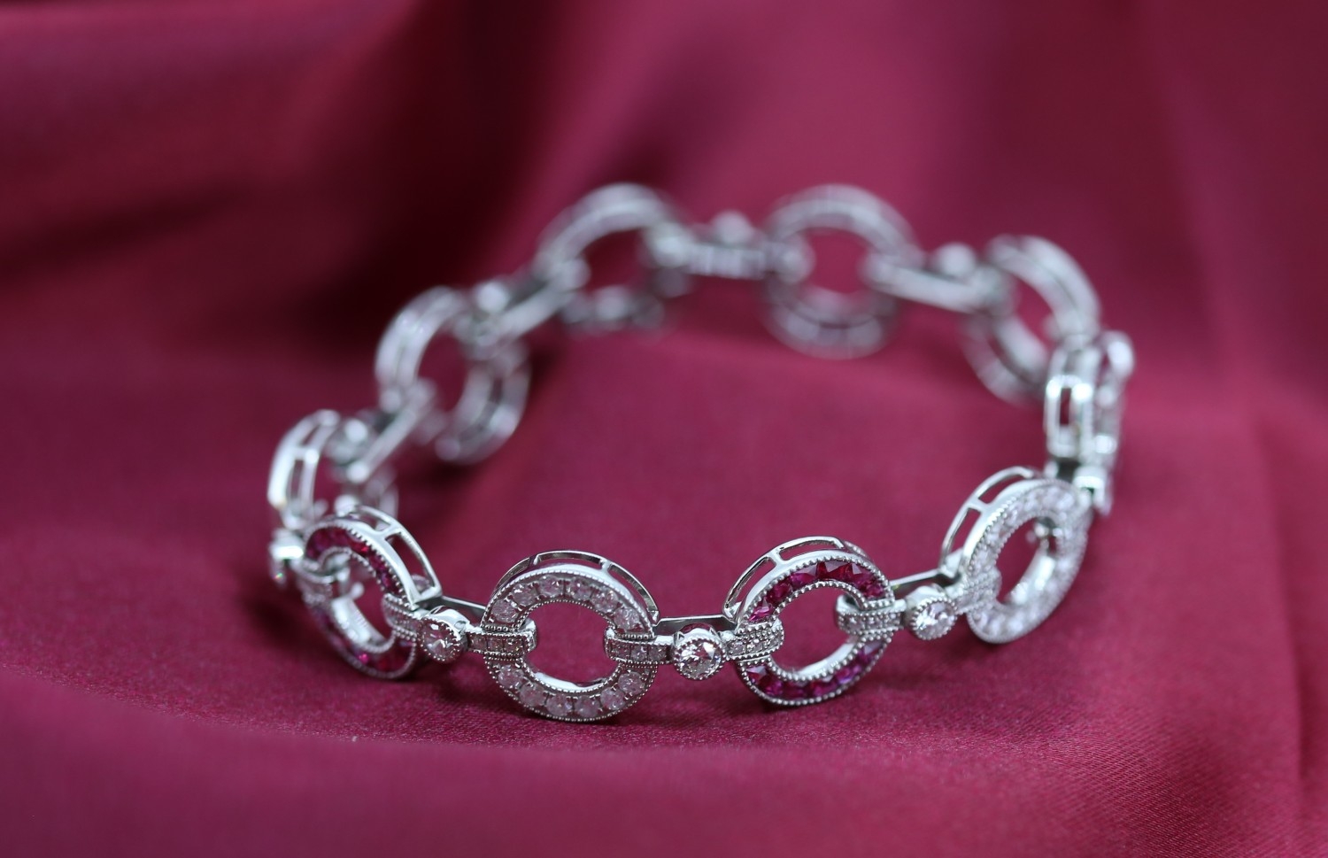 Attractively Detailed Diamond and Ruby Set Circular Fancy Link Bracelet Mounted in Platinum Total Diamond Carat Weight 2ct Total Ruby Carat Weight 1.2ct 18cm Long