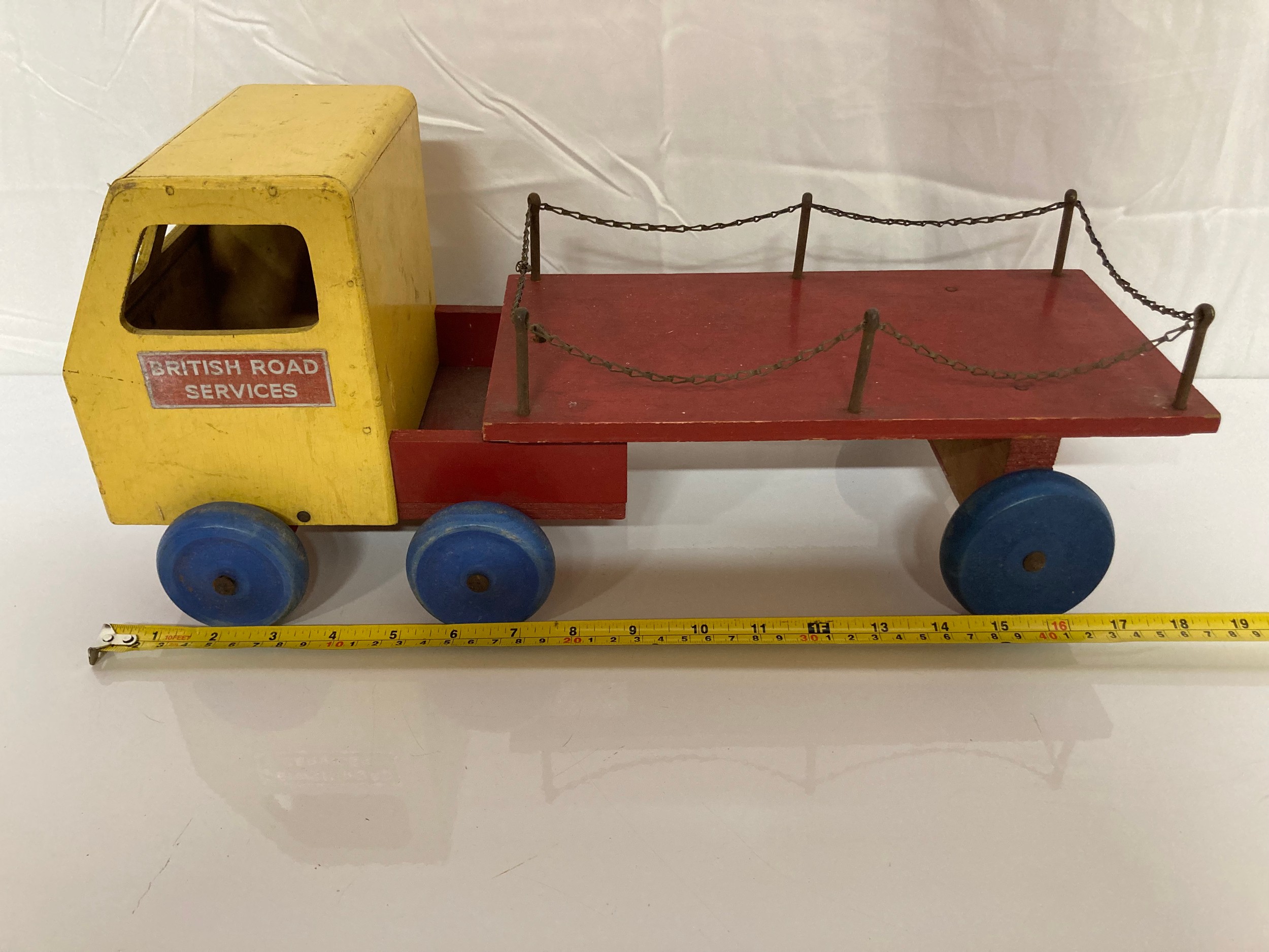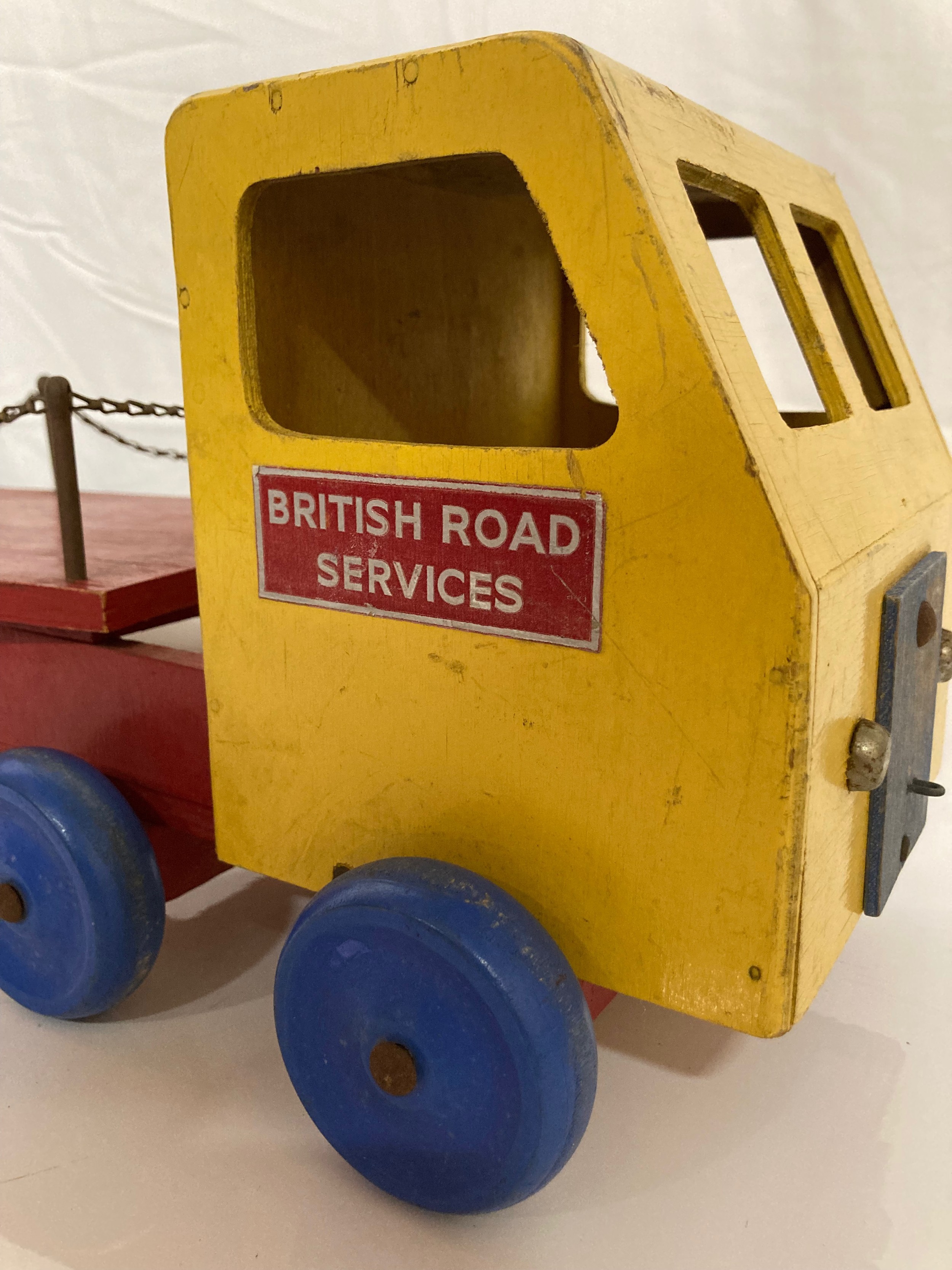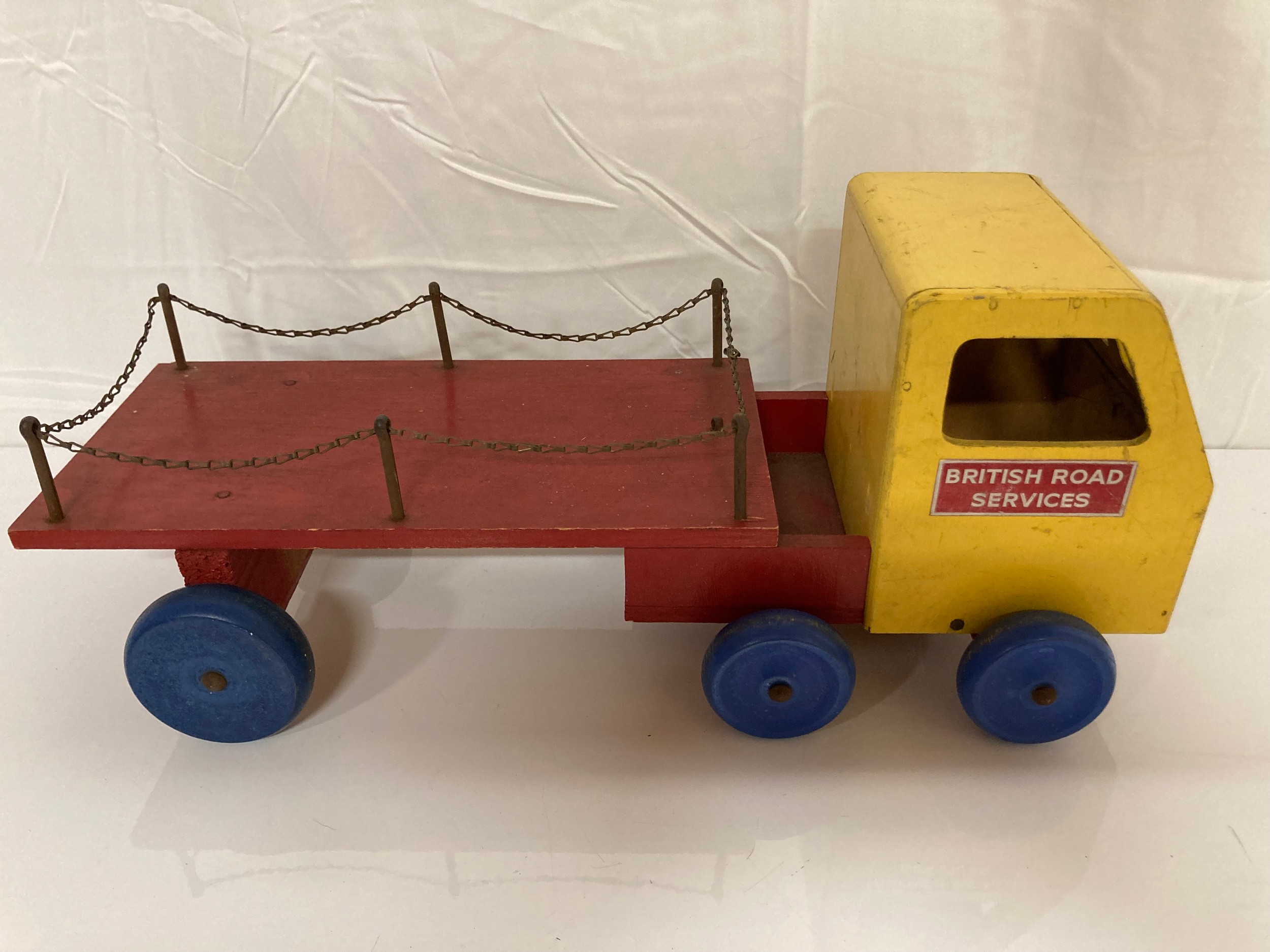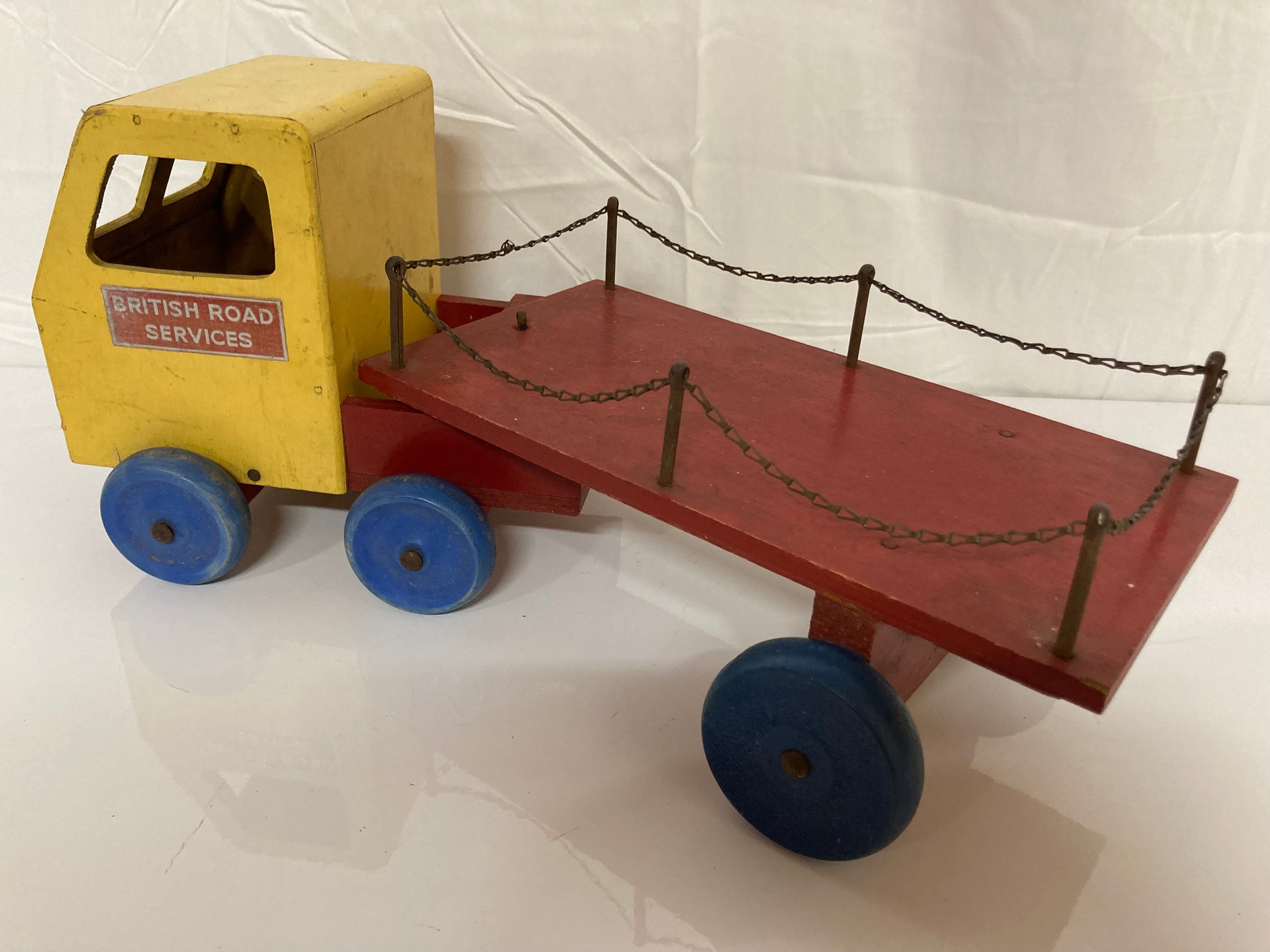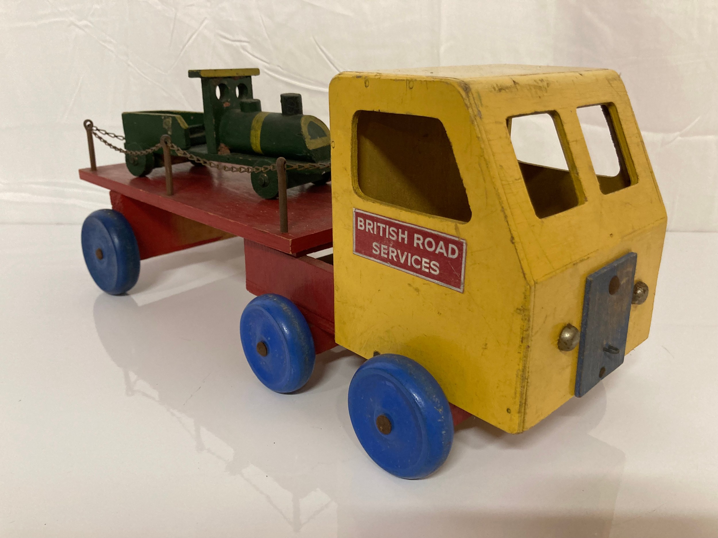 Toy lorry and train, a large wooden flat bed lorry marked for British Road Services, 19 inches long, and a painted wooden toy train 9 inches long.